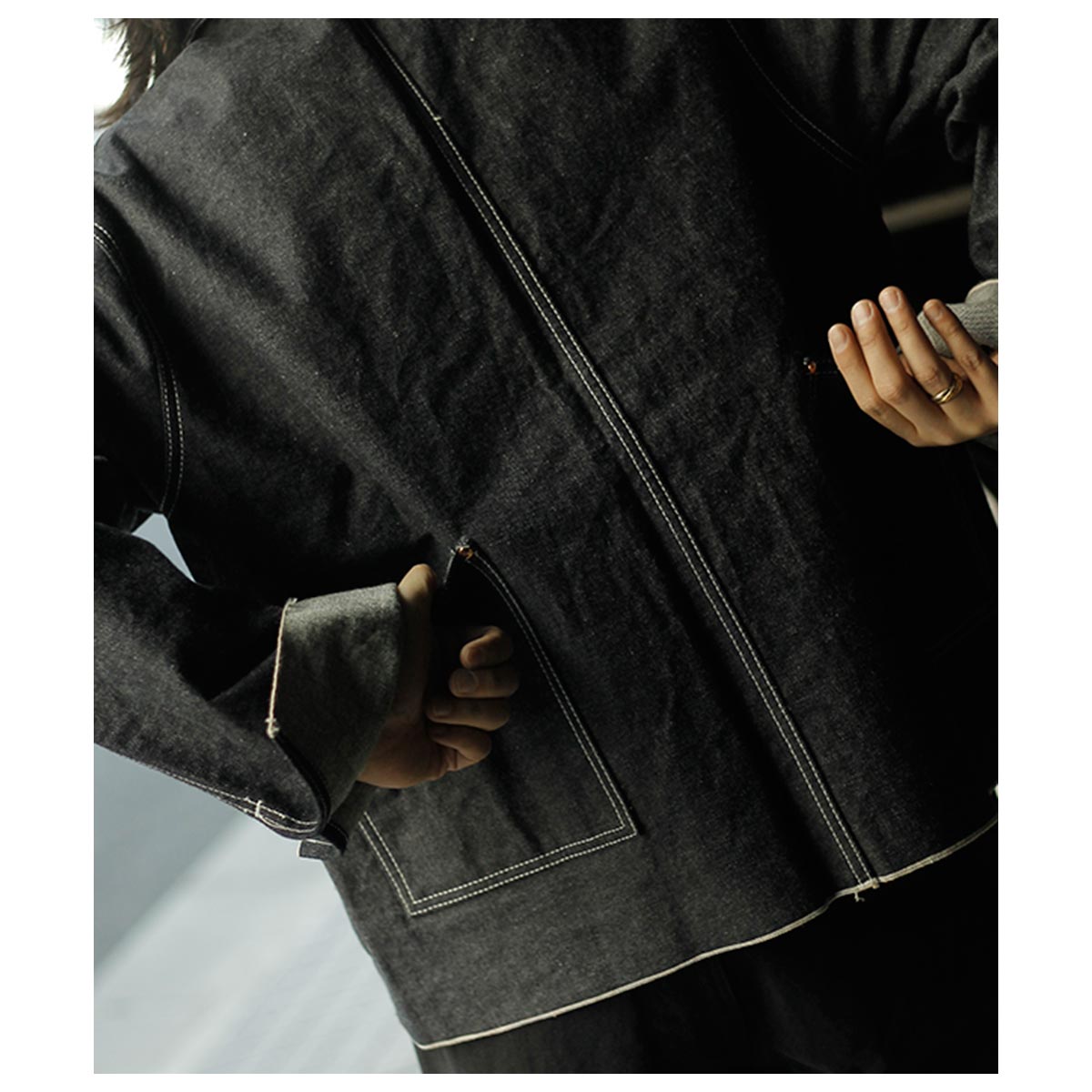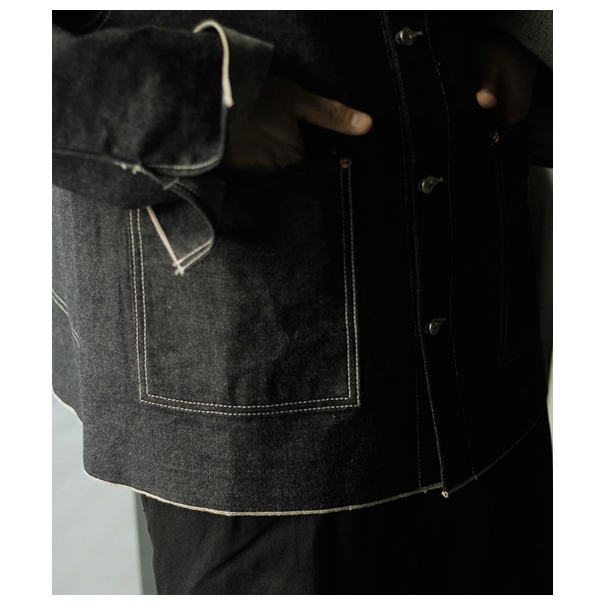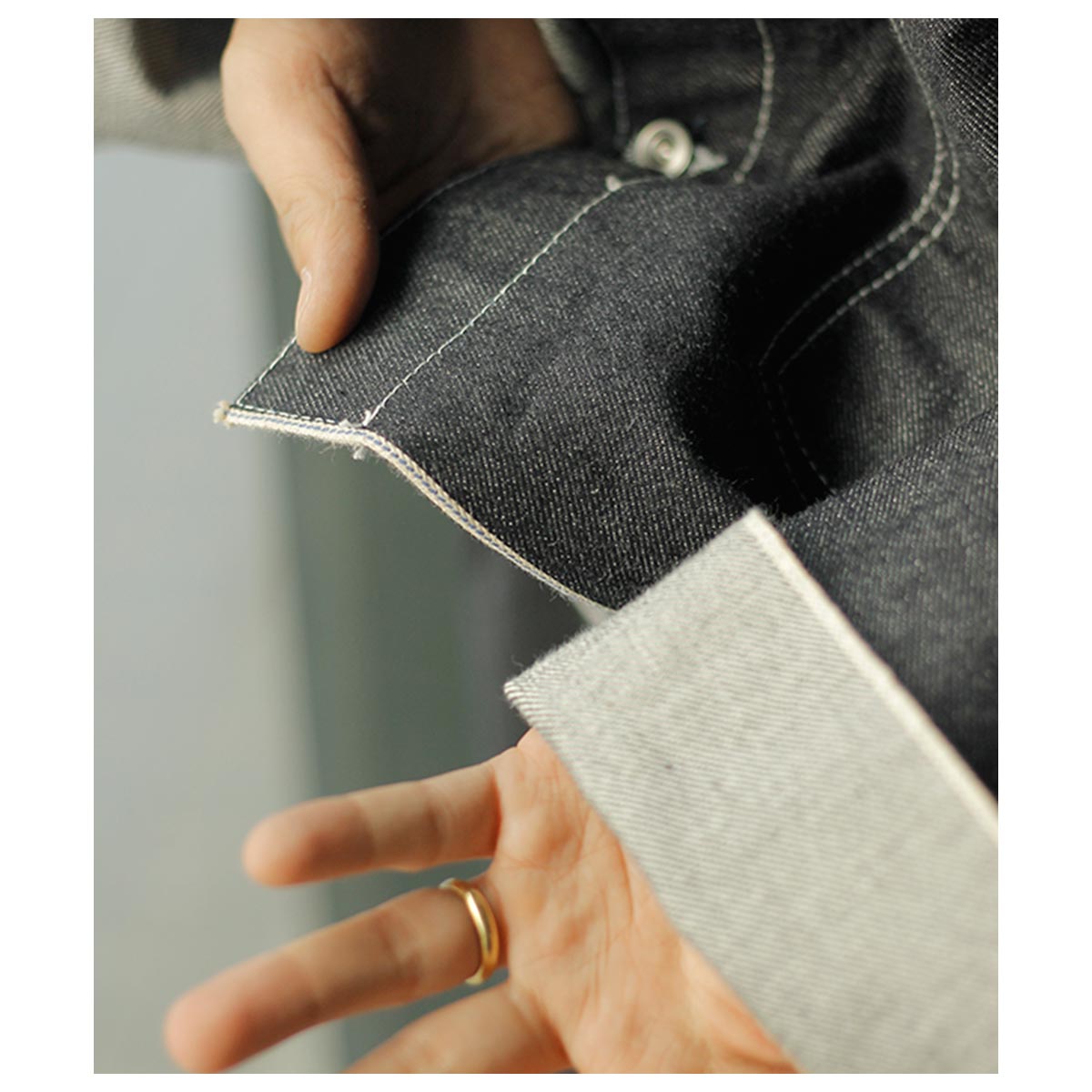 通常は縦方向に使うデニム生地をあえて横向きに裁断。 生地を横断するようにパターンを引くことで、ボディと袖の長さを構成しています。裾や袖口は水平に走るセルヴィッジ(耳)で仕上げられているのも特徴です。