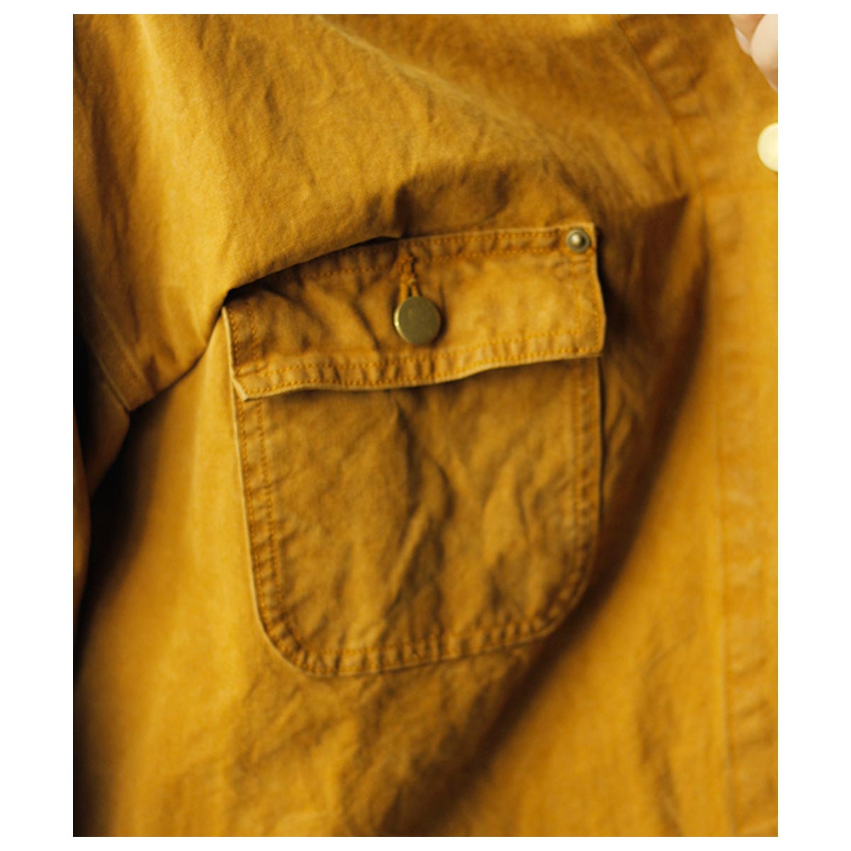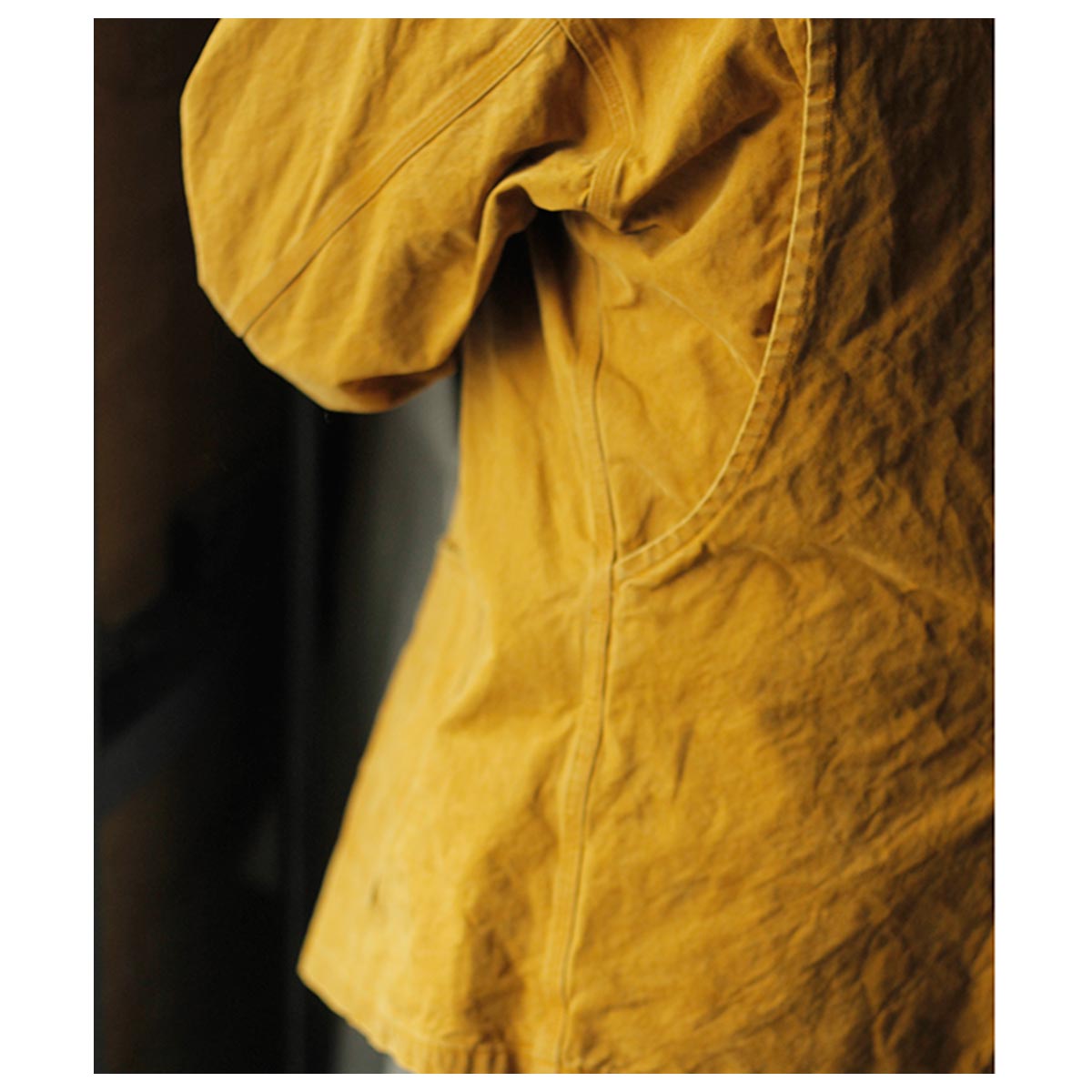 打ち込みのよいライトオンスのダック生地にパラフィン加工でコーティングした生地。さらにストーンバイオ加工などを施し、全体にムラ感とアタリを出しています。