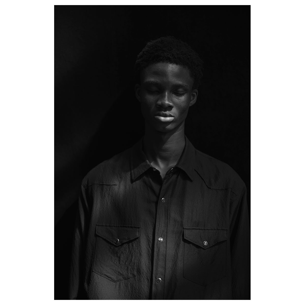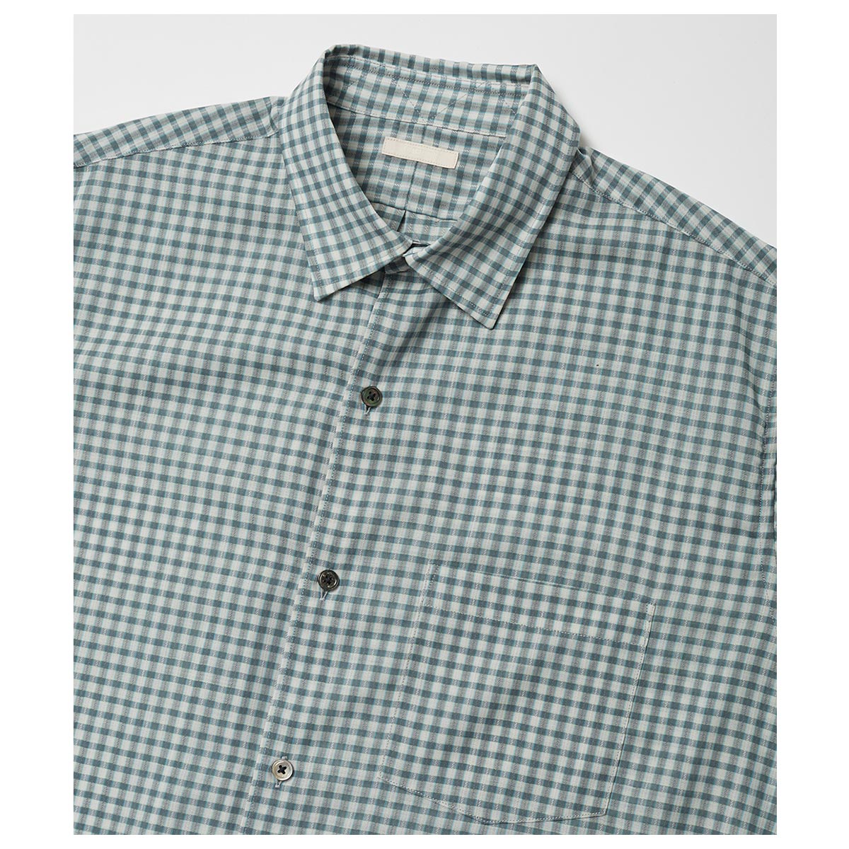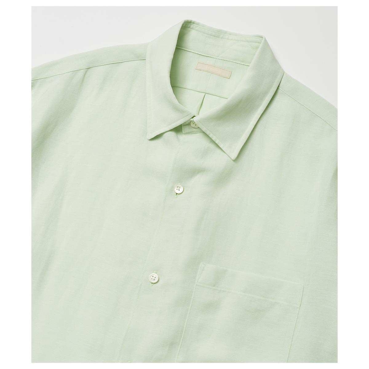ワークで仕⽴てたレギュラーカラーシャツ。⼩振りすぎないコンパクトな襟型とボク
