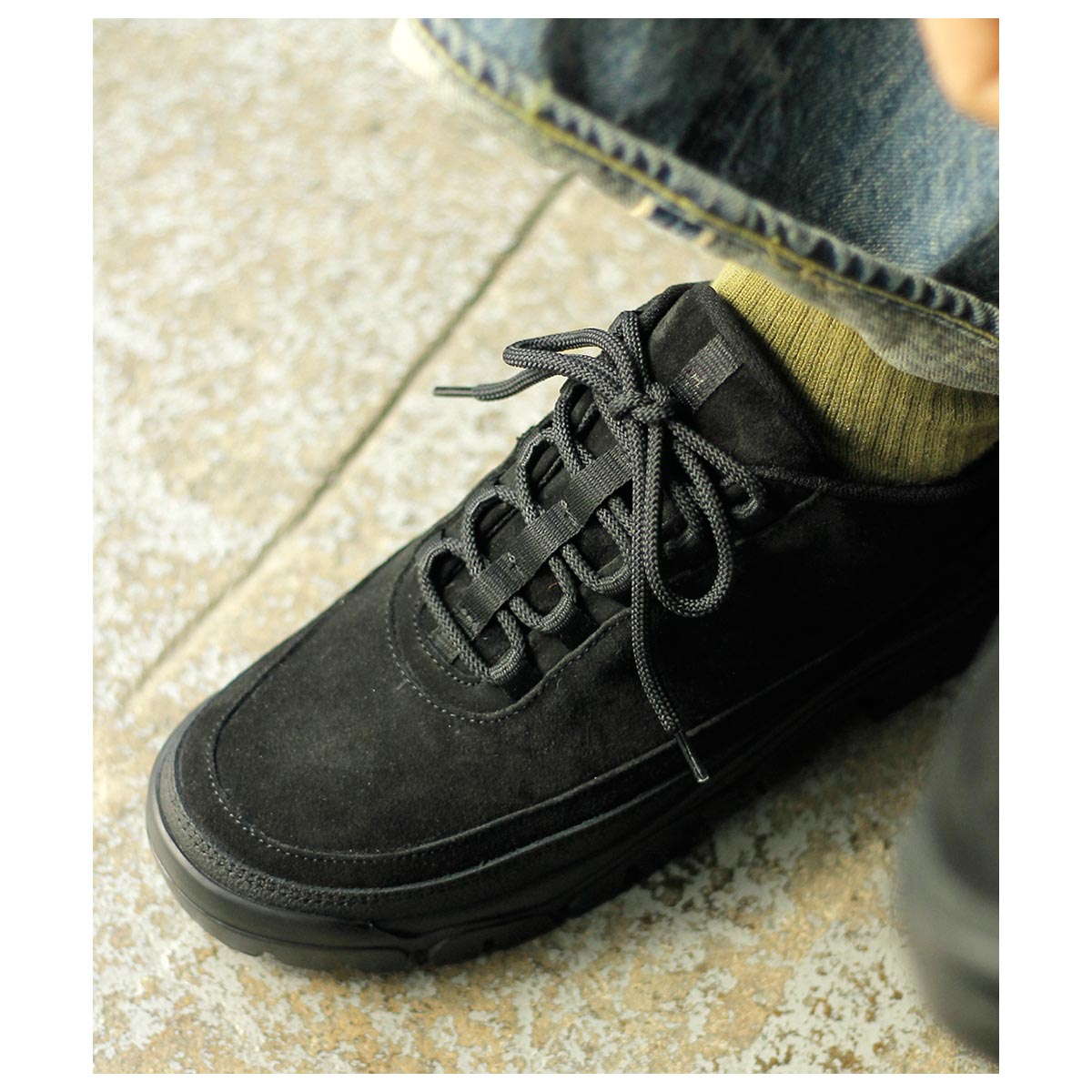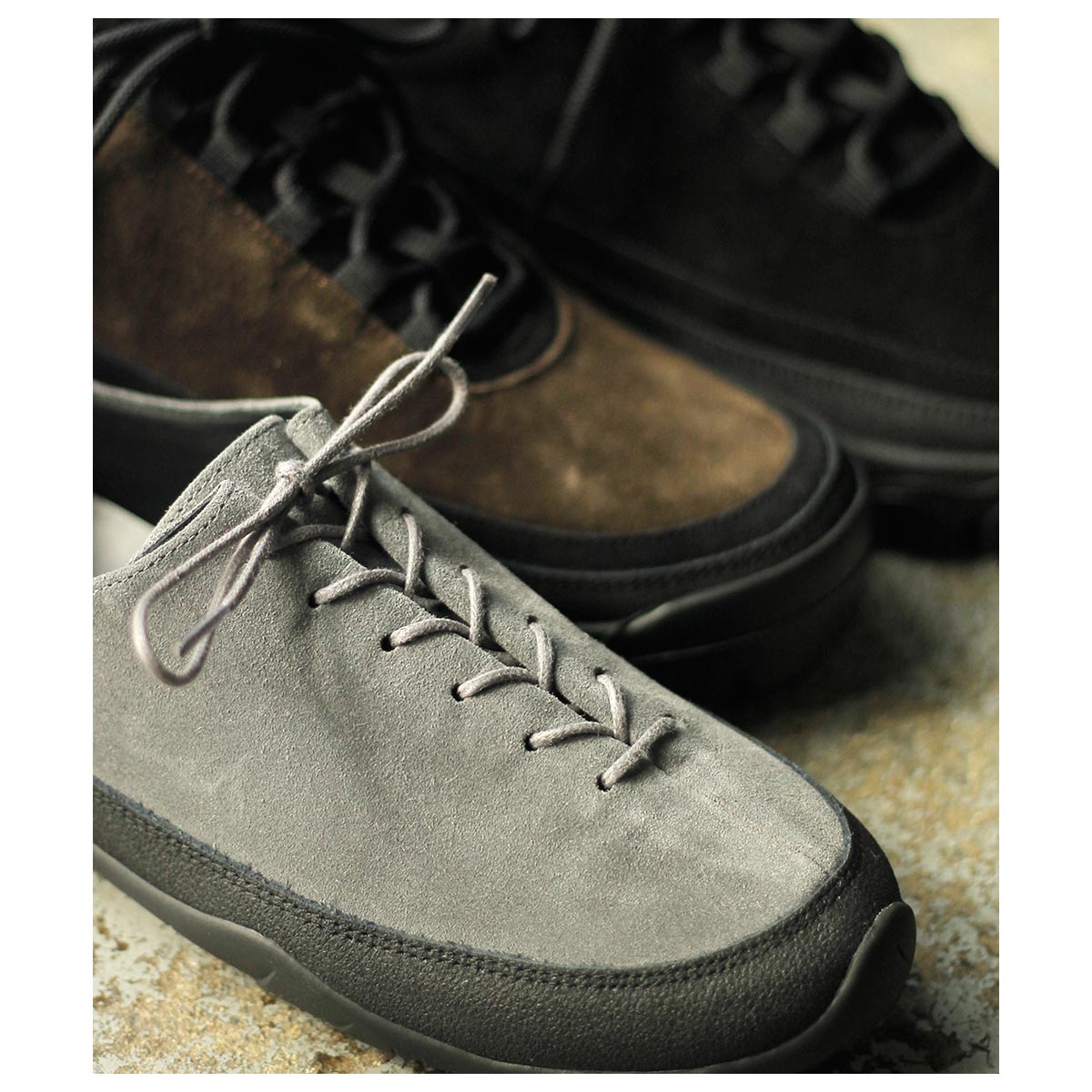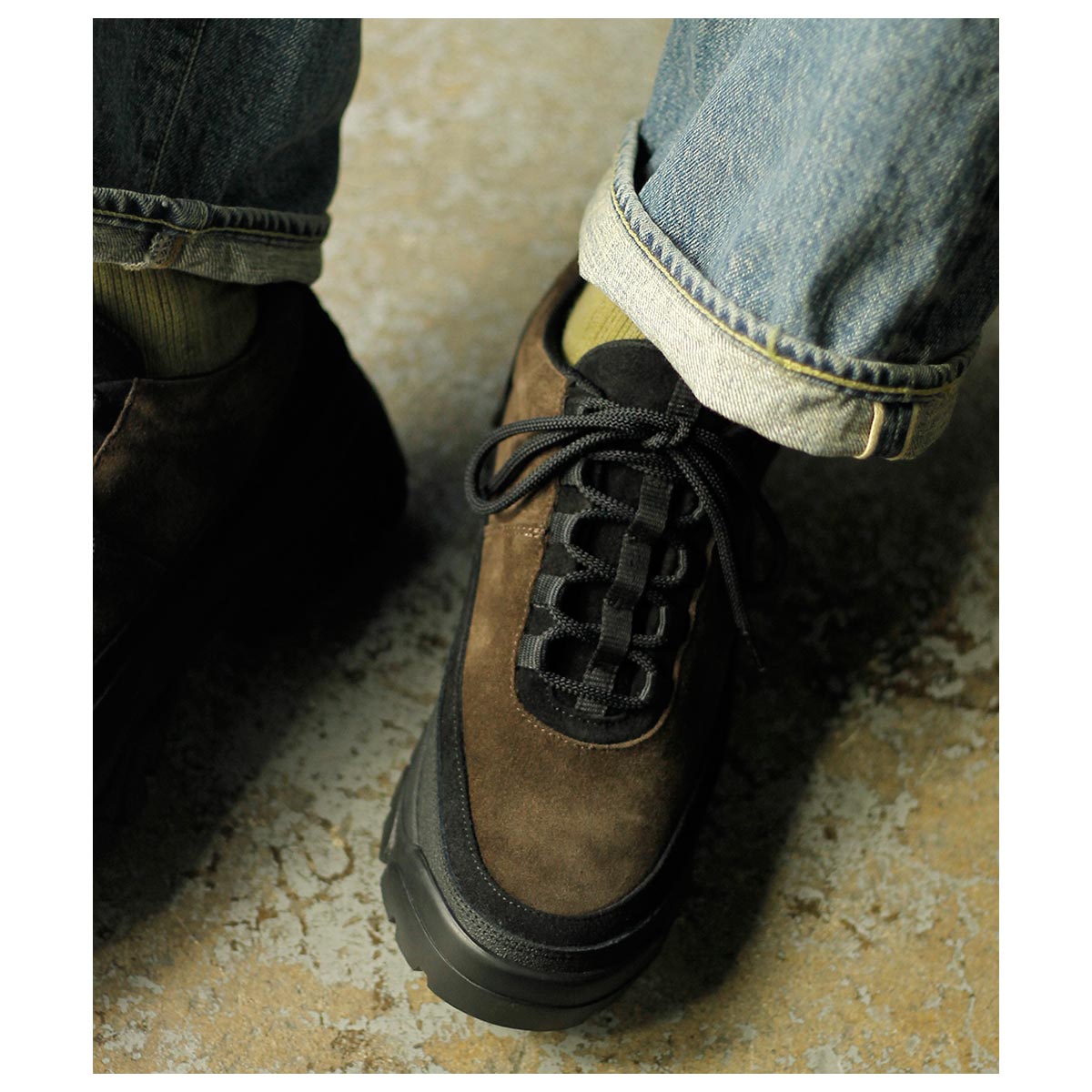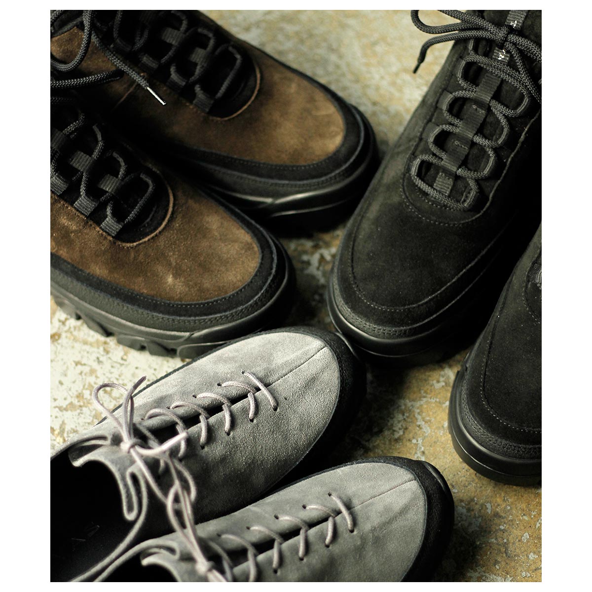 アッパーにはスエード、アップサイクルコーデュラ、フルグレインレザーをレイヤードして使用しており、ミニマルながら存在感のある印象に。アウトソールにはVibramソールを採用し、アッパーを包み込むように配置されたマッドガードも特徴です。