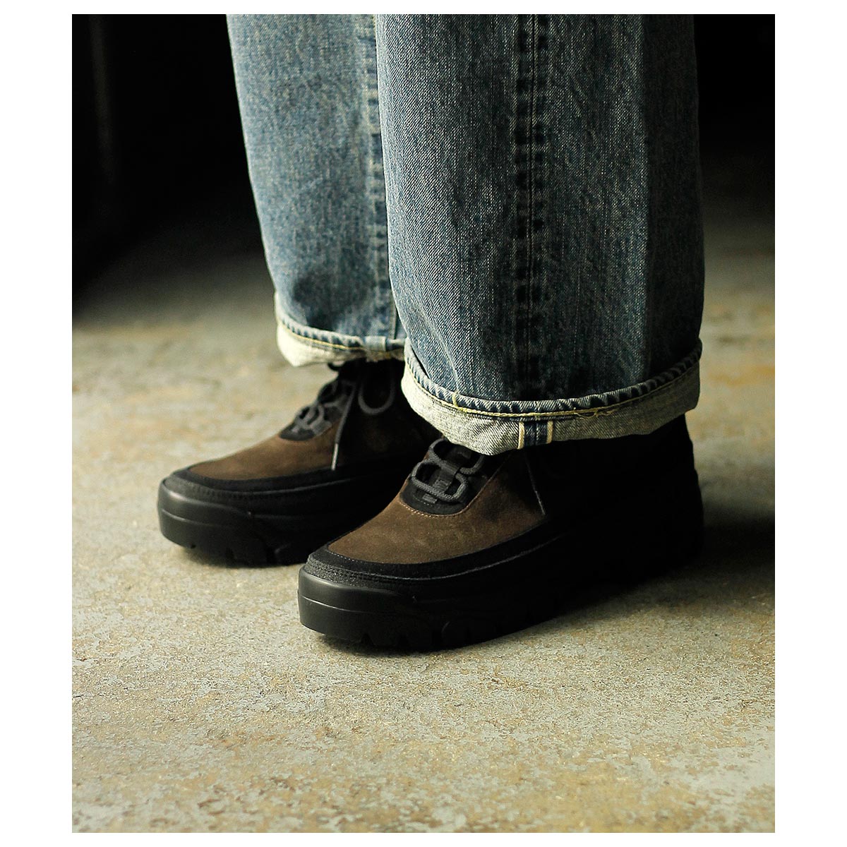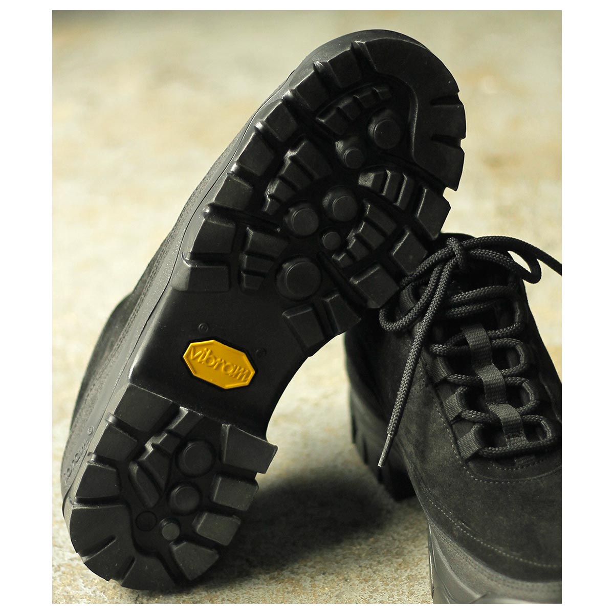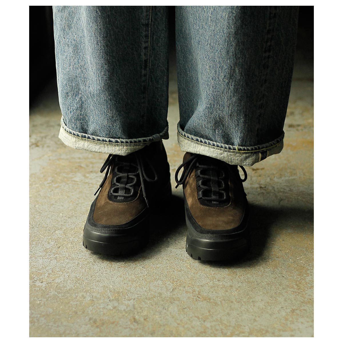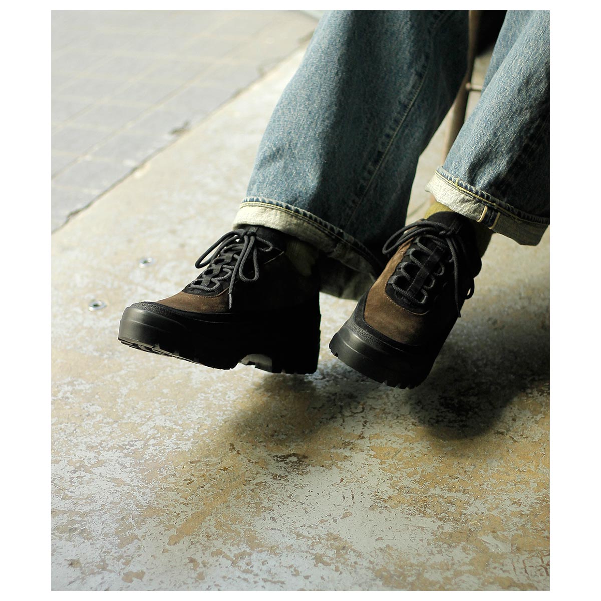 アッパーにはスエード、アップサイクルコーデュラ、フルグレインレザーをレイヤードして使用しており、ミニマルながら存在感のある印象に。アウトソールにはVibramソールを採用し、アッパーを包み込むように配置されたマッドガードも特徴です。