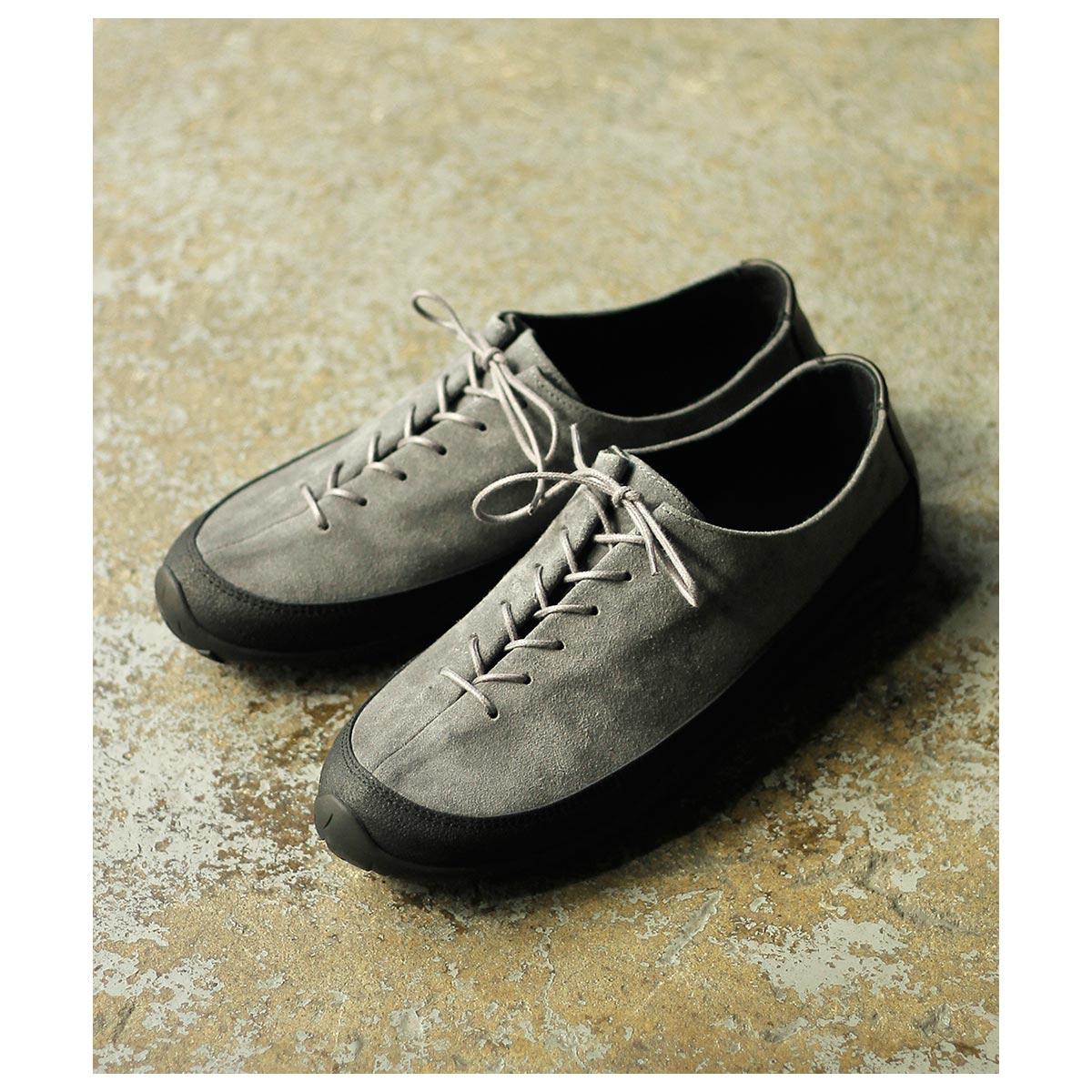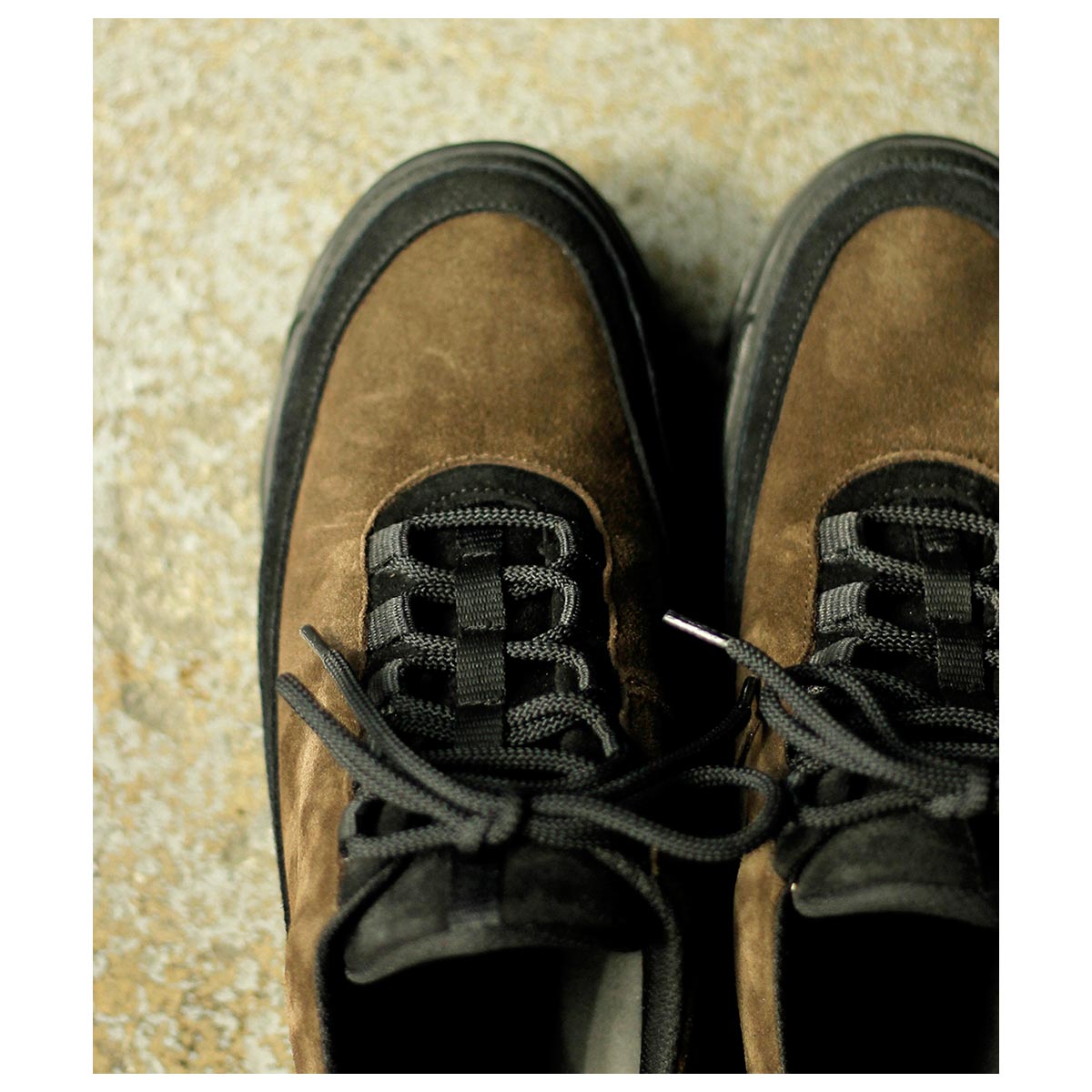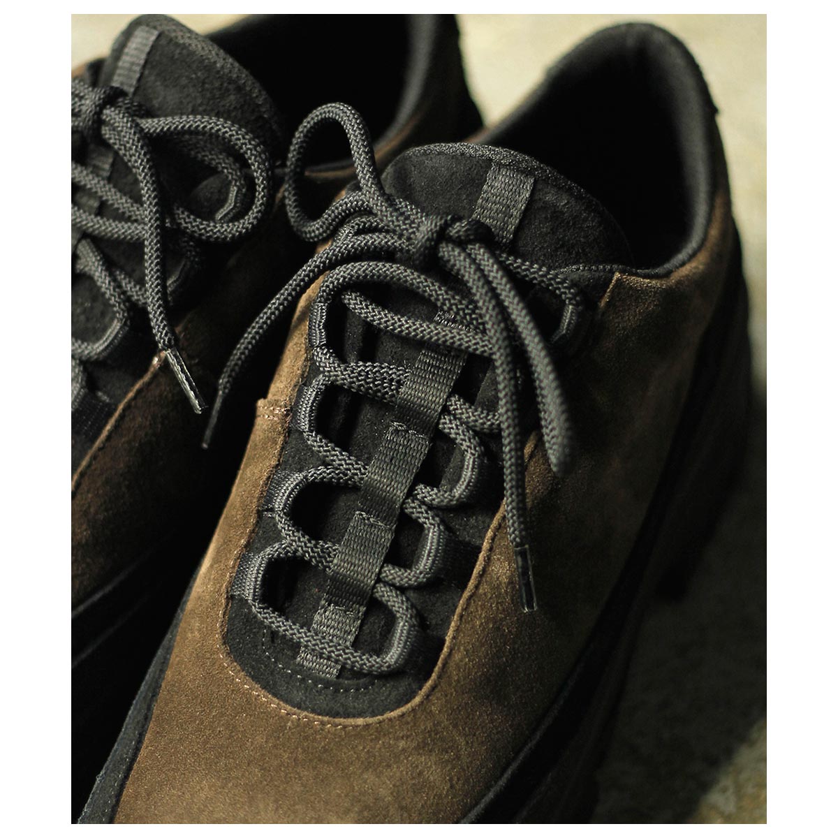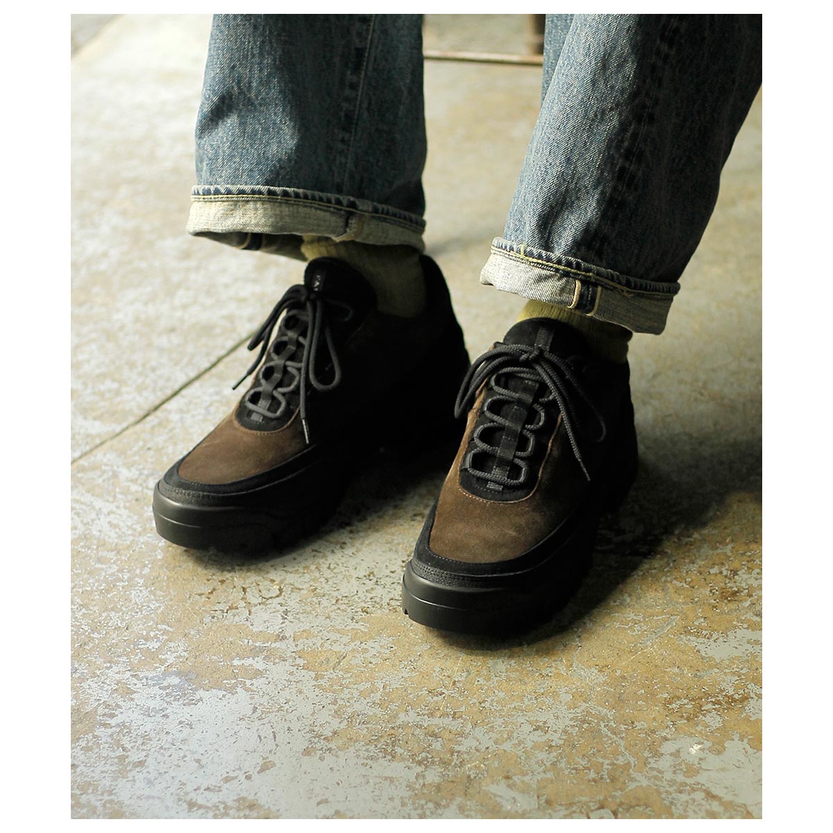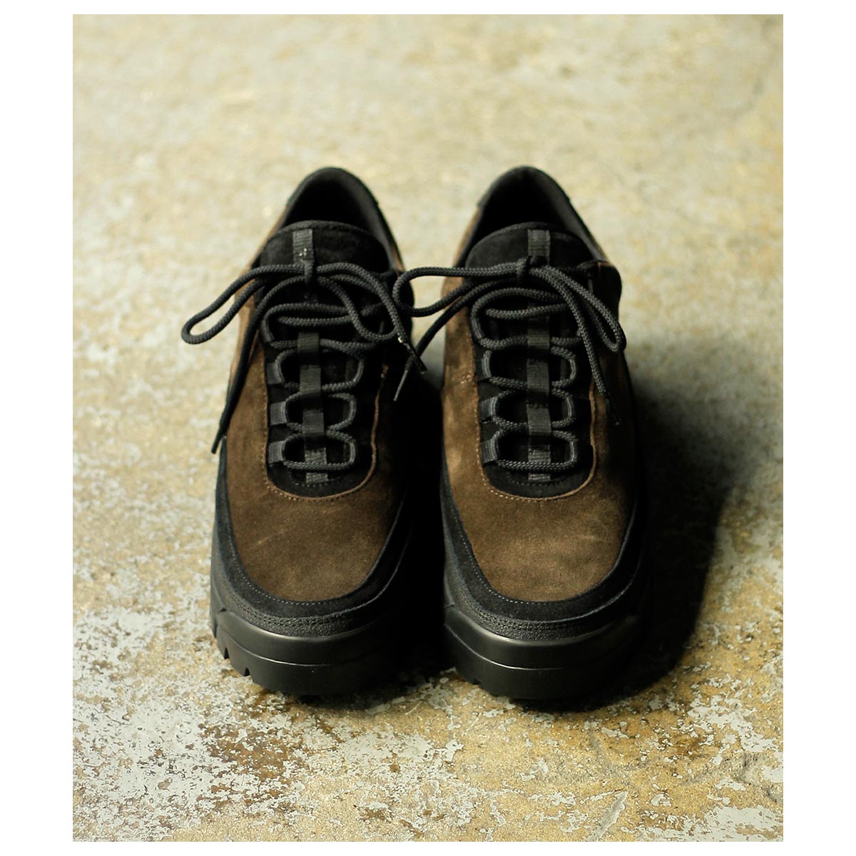 アッパーにはスエード、アップサイクルコーデュラ、フルグレインレザーをレイヤードして使用しており、ミニマルながら存在感のある印象に。アウトソールにはVibramソールを採用し、アッパーを包み込むように配置されたマッドガードも特徴です。