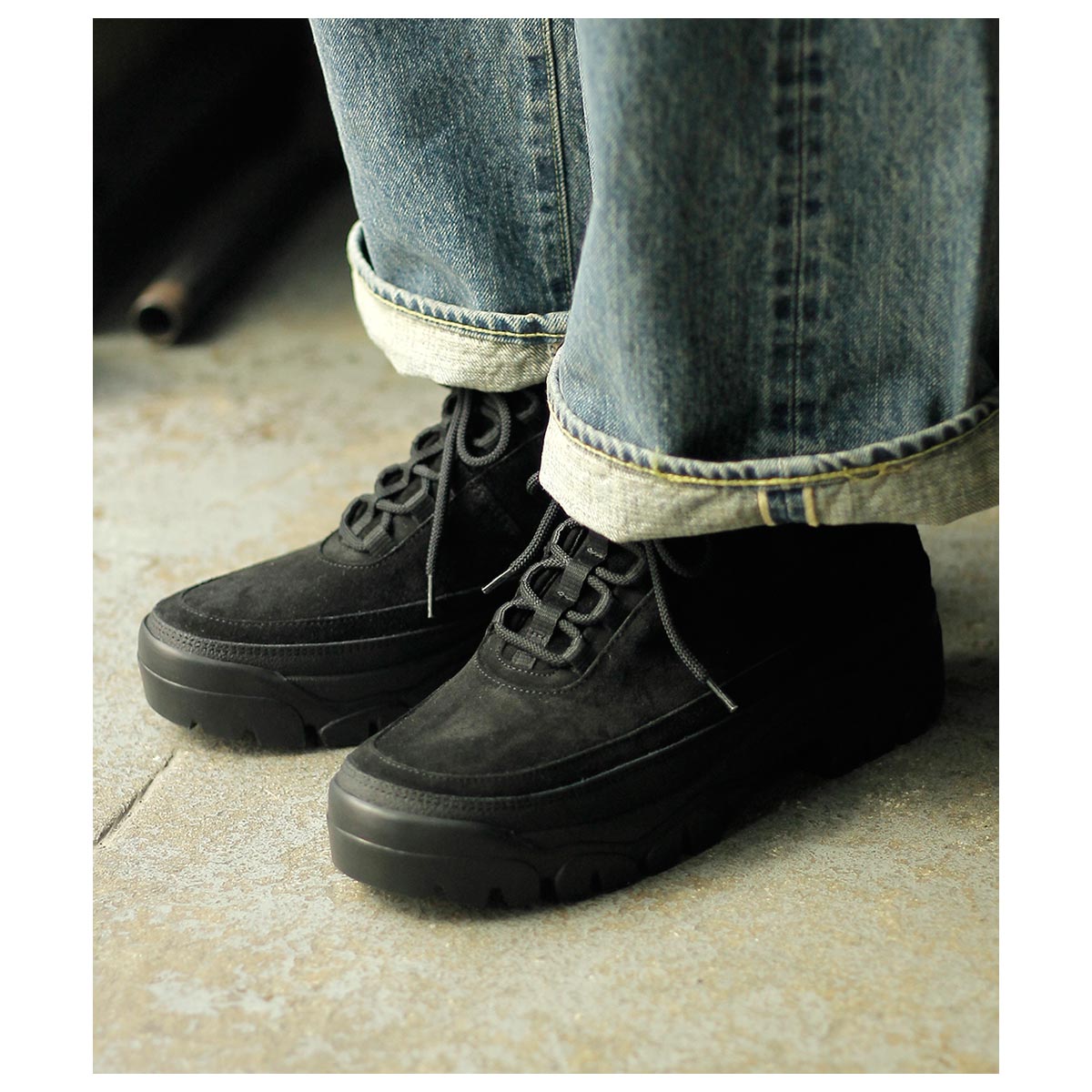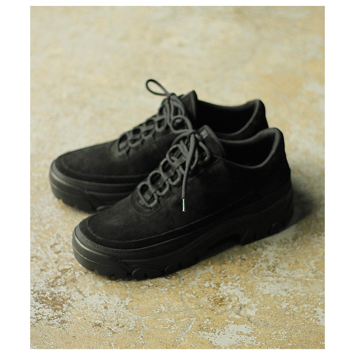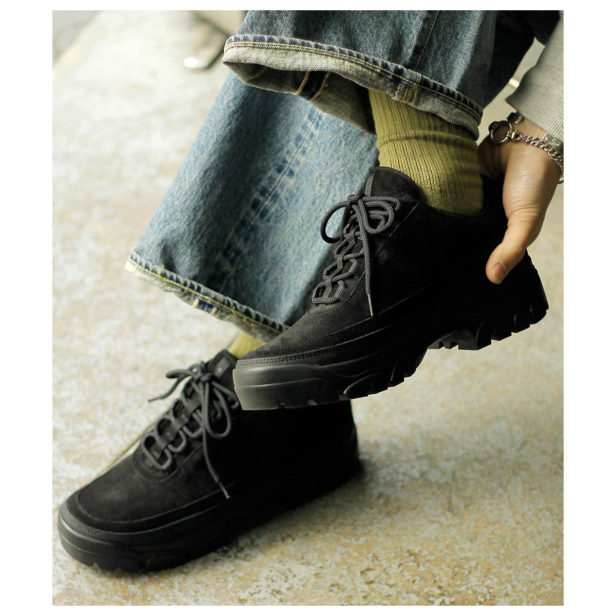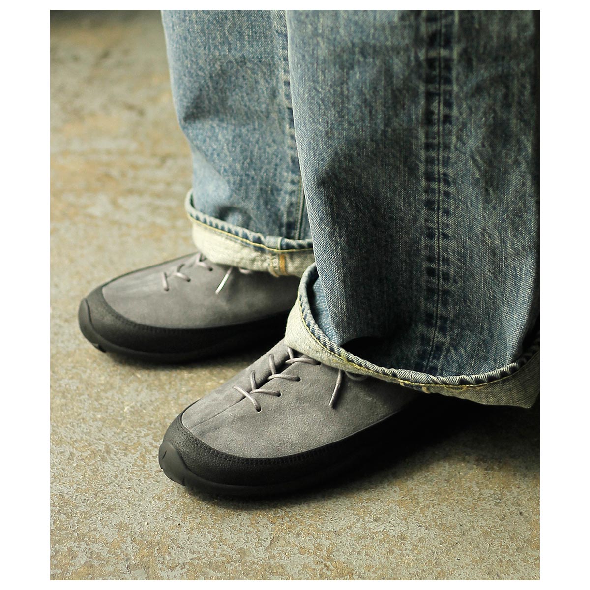 アッパーにはスエード、アップサイクルコーデュラ、フルグレインレザーをレイヤードして使用しており、ミニマルながら存在感のある印象に。アウトソールにはVibramソールを採用し、アッパーを包み込むように配置されたマッドガードも特徴です。