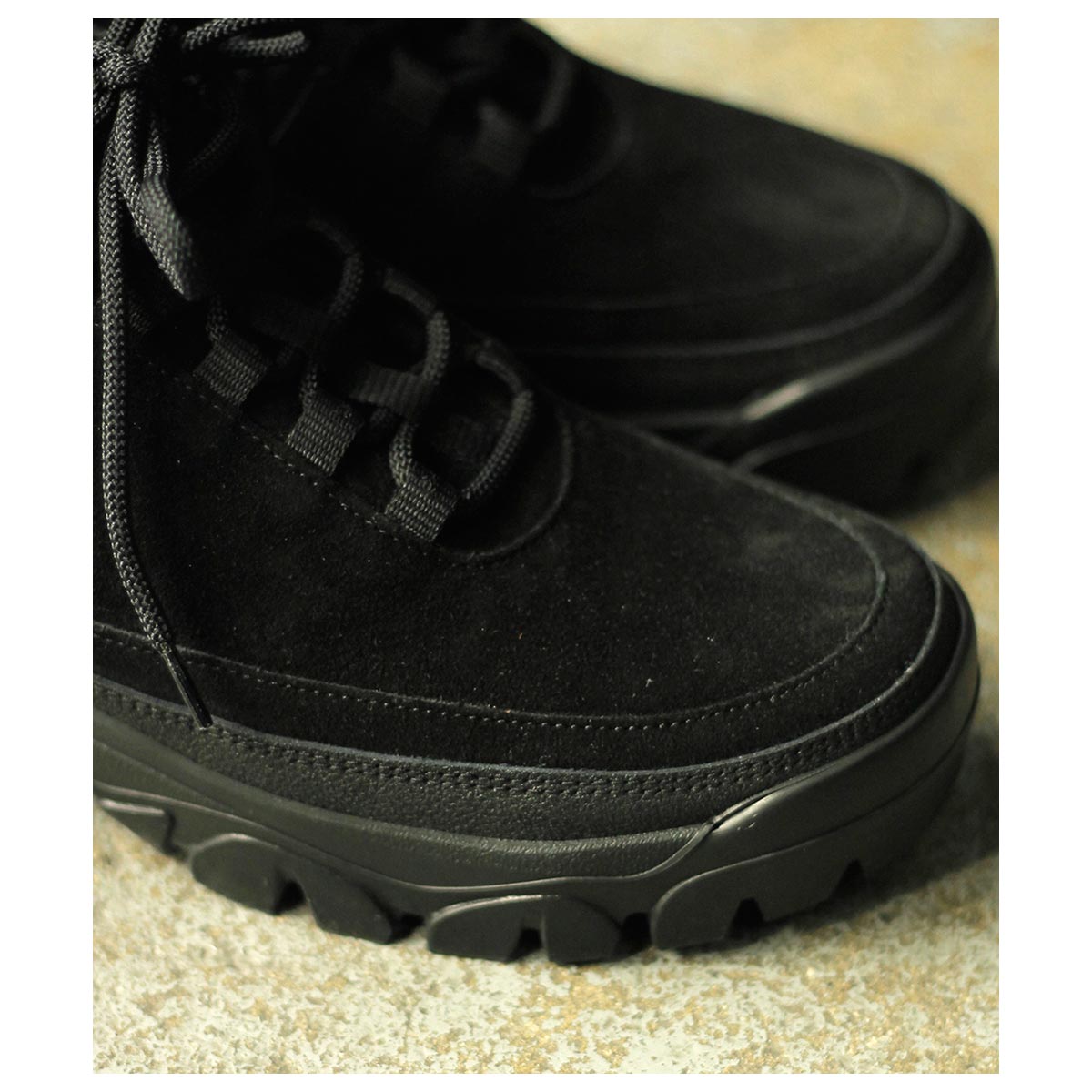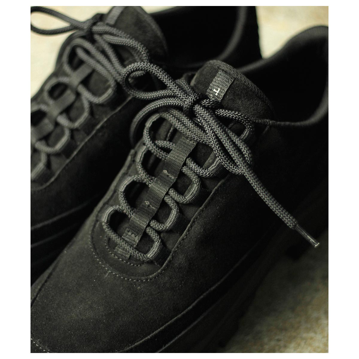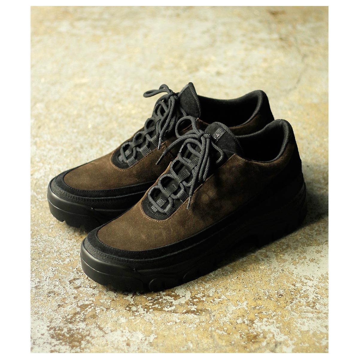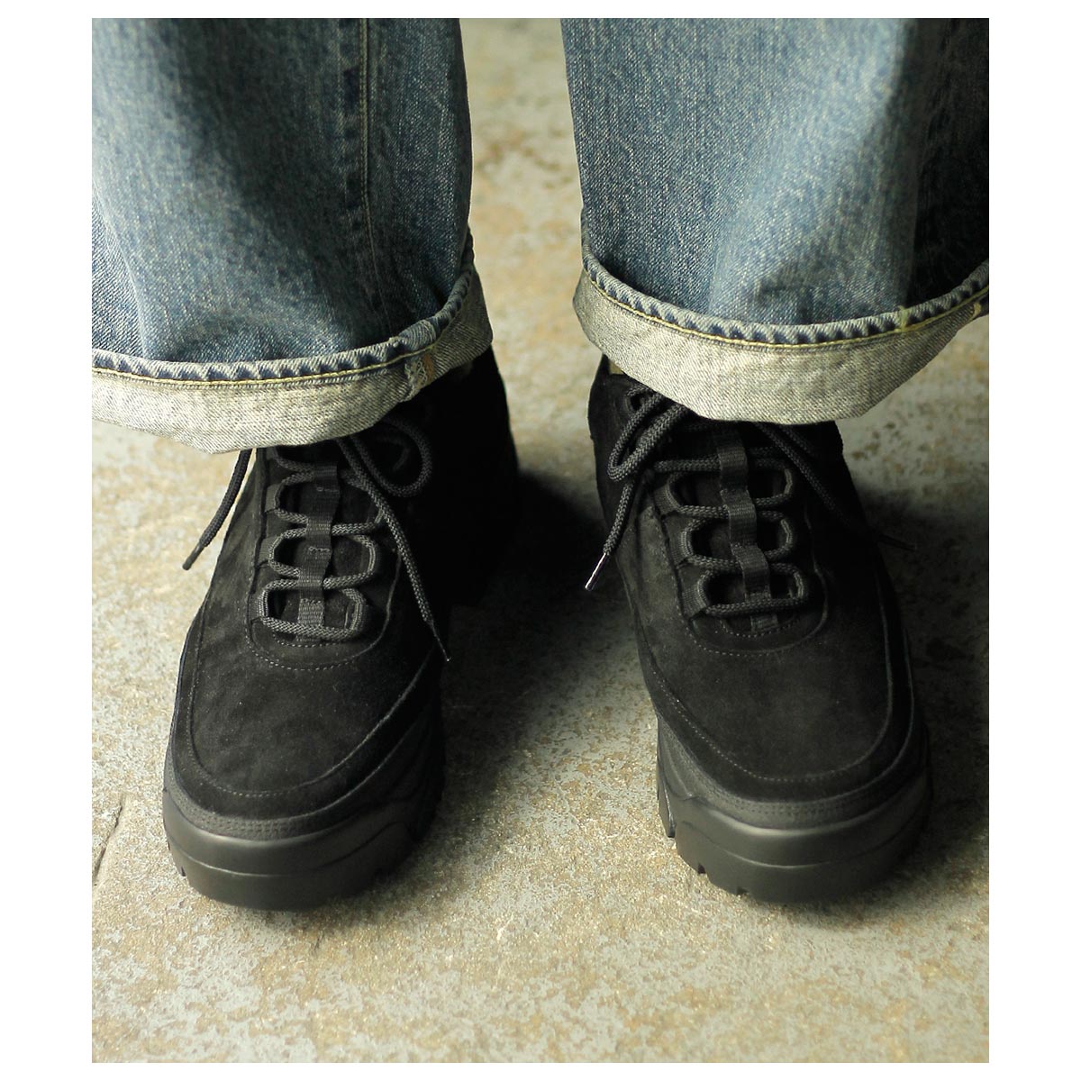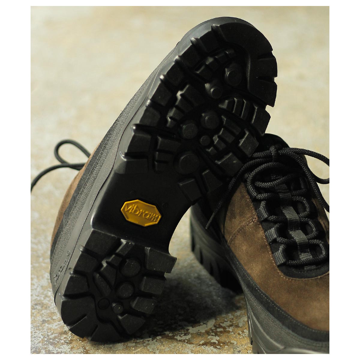 アッパーにはスエード、アップサイクルコーデュラ、フルグレインレザーをレイヤードして使用しており、ミニマルながら存在感のある印象に。アウトソールにはVibramソールを採用し、アッパーを包み込むように配置されたマッドガードも特徴です。
