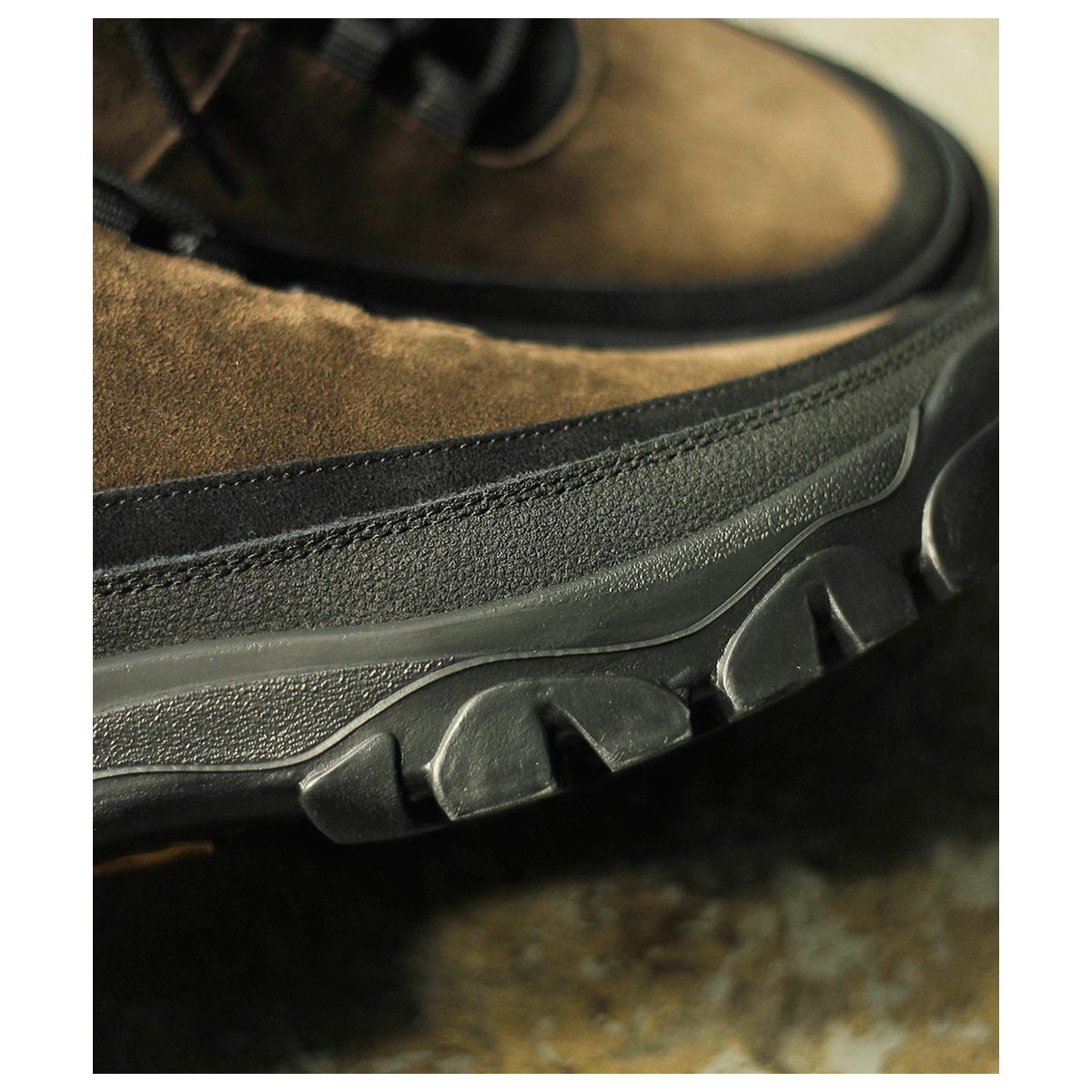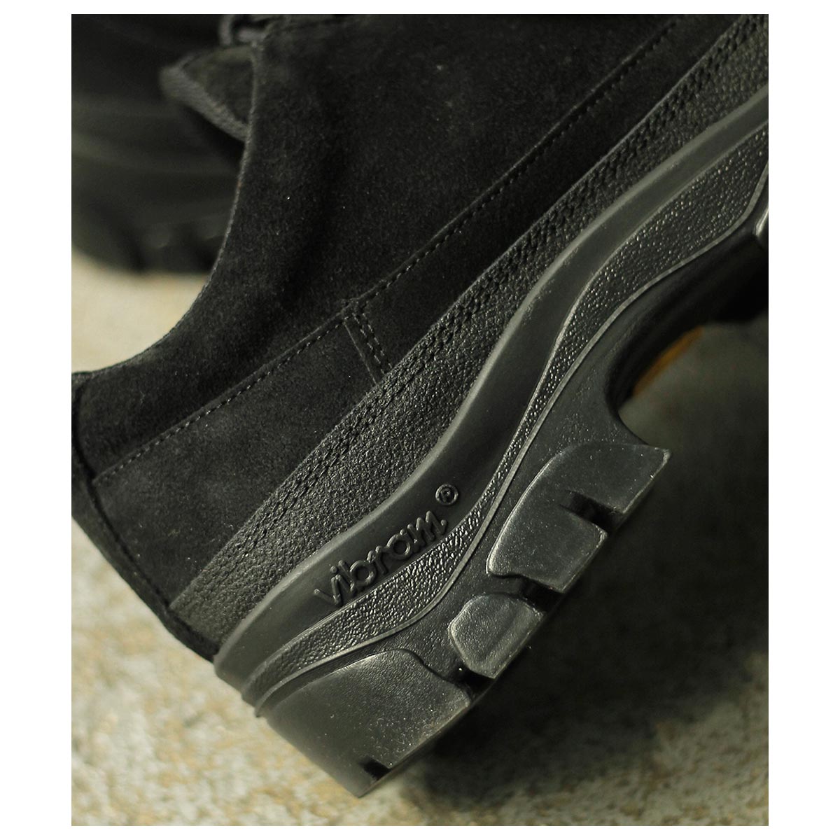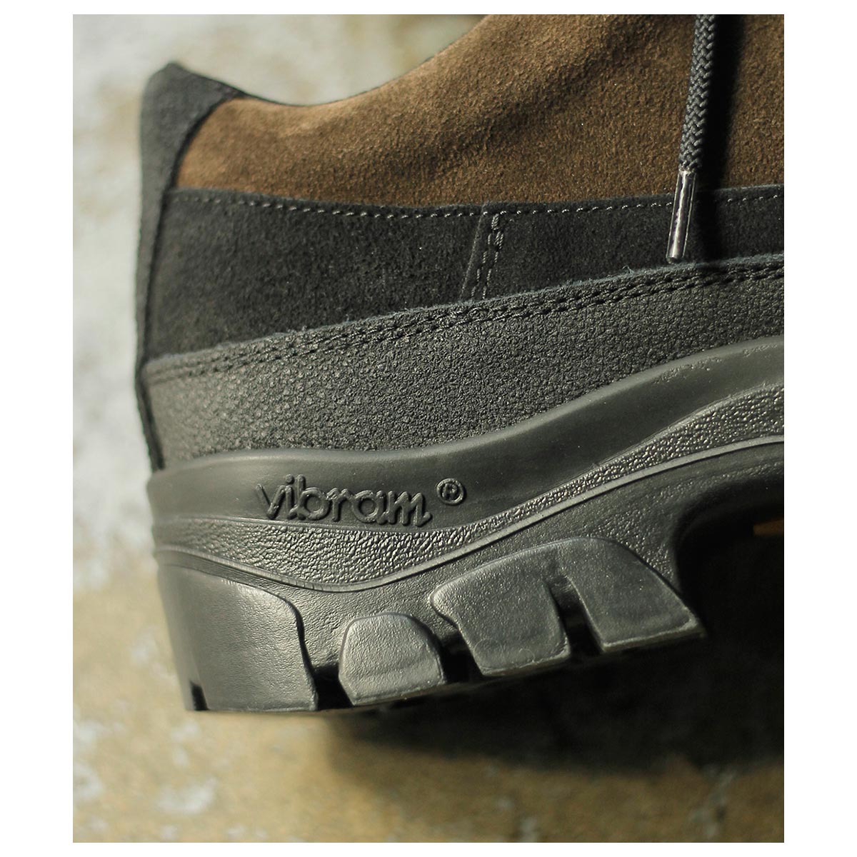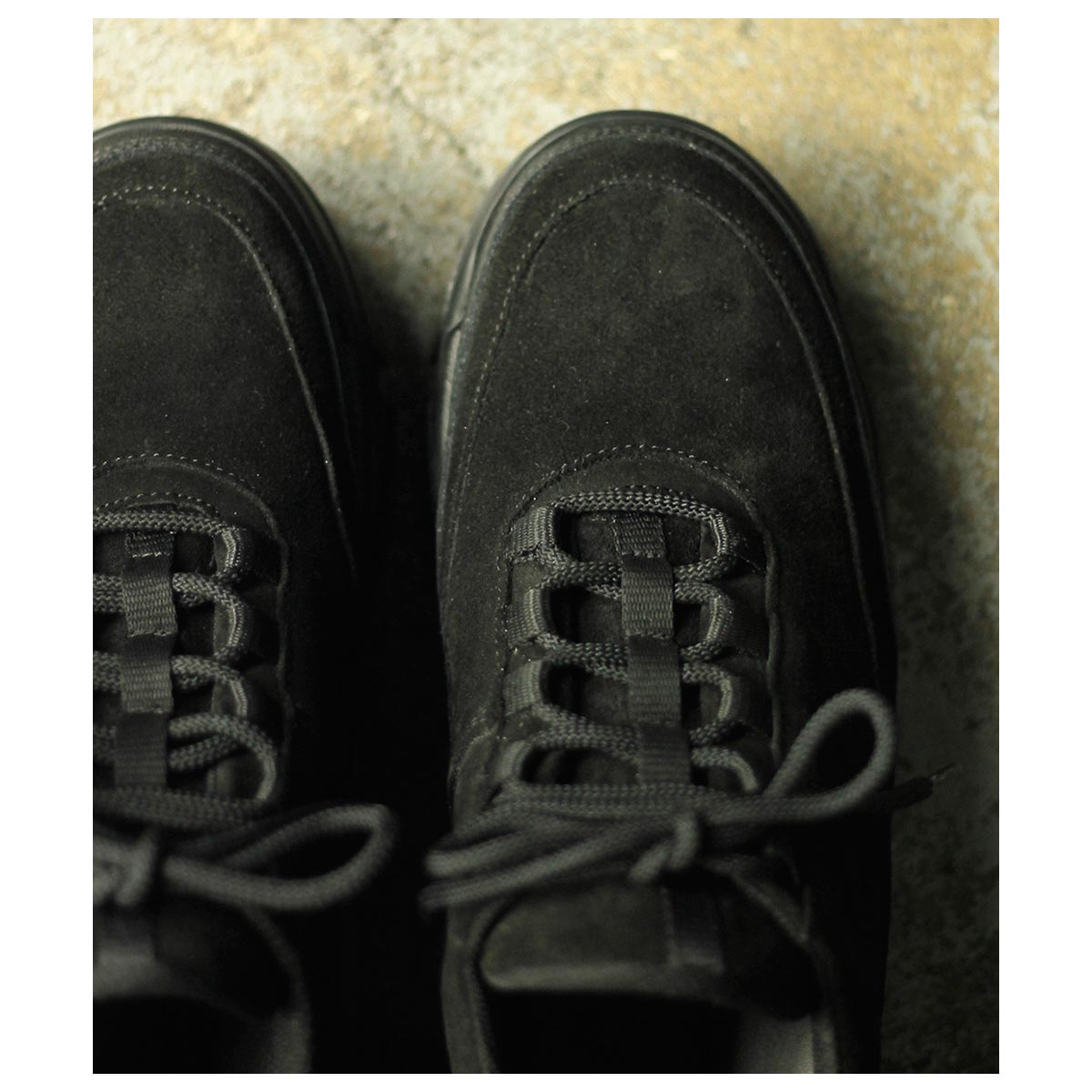 アッパーにはスエード、アップサイクルコーデュラ、フルグレインレザーをレイヤードして使用しており、ミニマルながら存在感のある印象に。アウトソールにはVibramソールを採用し、アッパーを包み込むように配置されたマッドガードも特徴です。