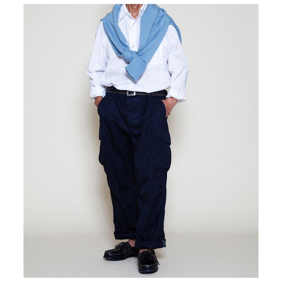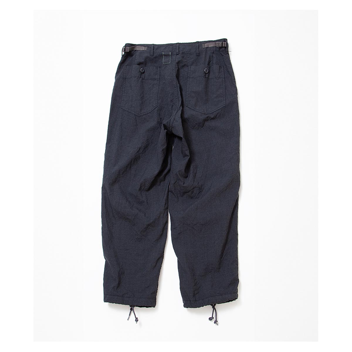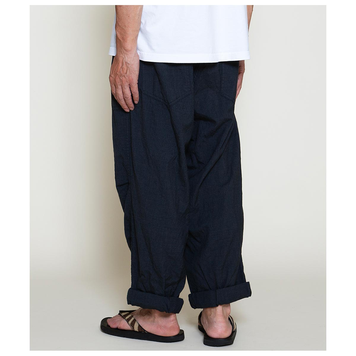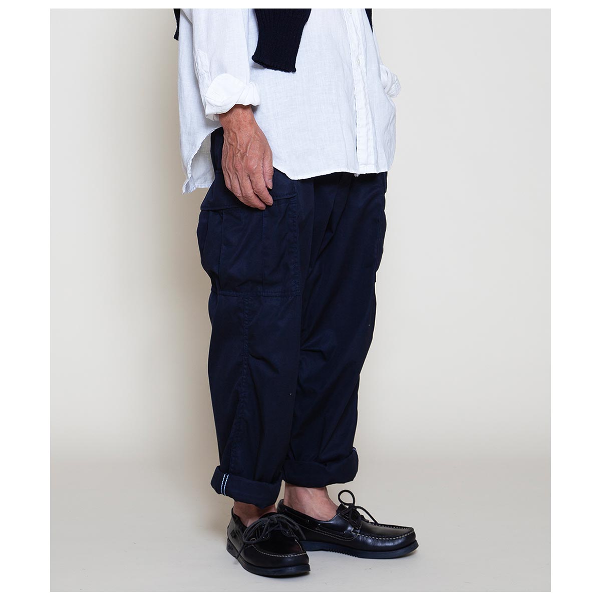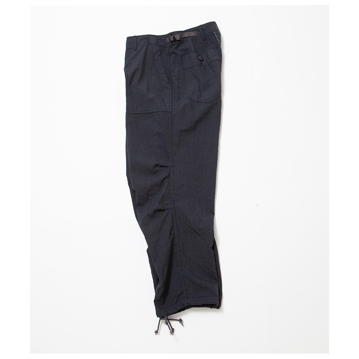 “1950 年代・米軍の軍事演習用” アグレッサーユニフォーム(仮想敵国ユニフォーム)” のボトムスを基に作られたアイテムです。 前後4つのパッチポケットのシンプルなディテールですが、膝に2本のタックが入る立体的な身頃の作りとなっています。膝を中心に前身頃が弓なりにカーブする完全オリジナルシルエットです。 太いワタリから裾に向けてゆるくテーパードする穿き易い形で、後身頃のバランスがやや大きいとてもリラックスできる履き心地です。