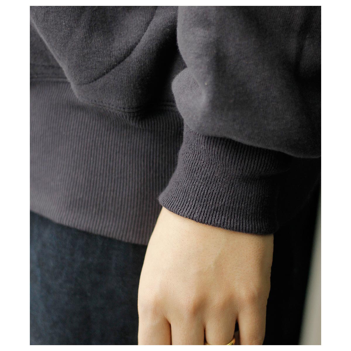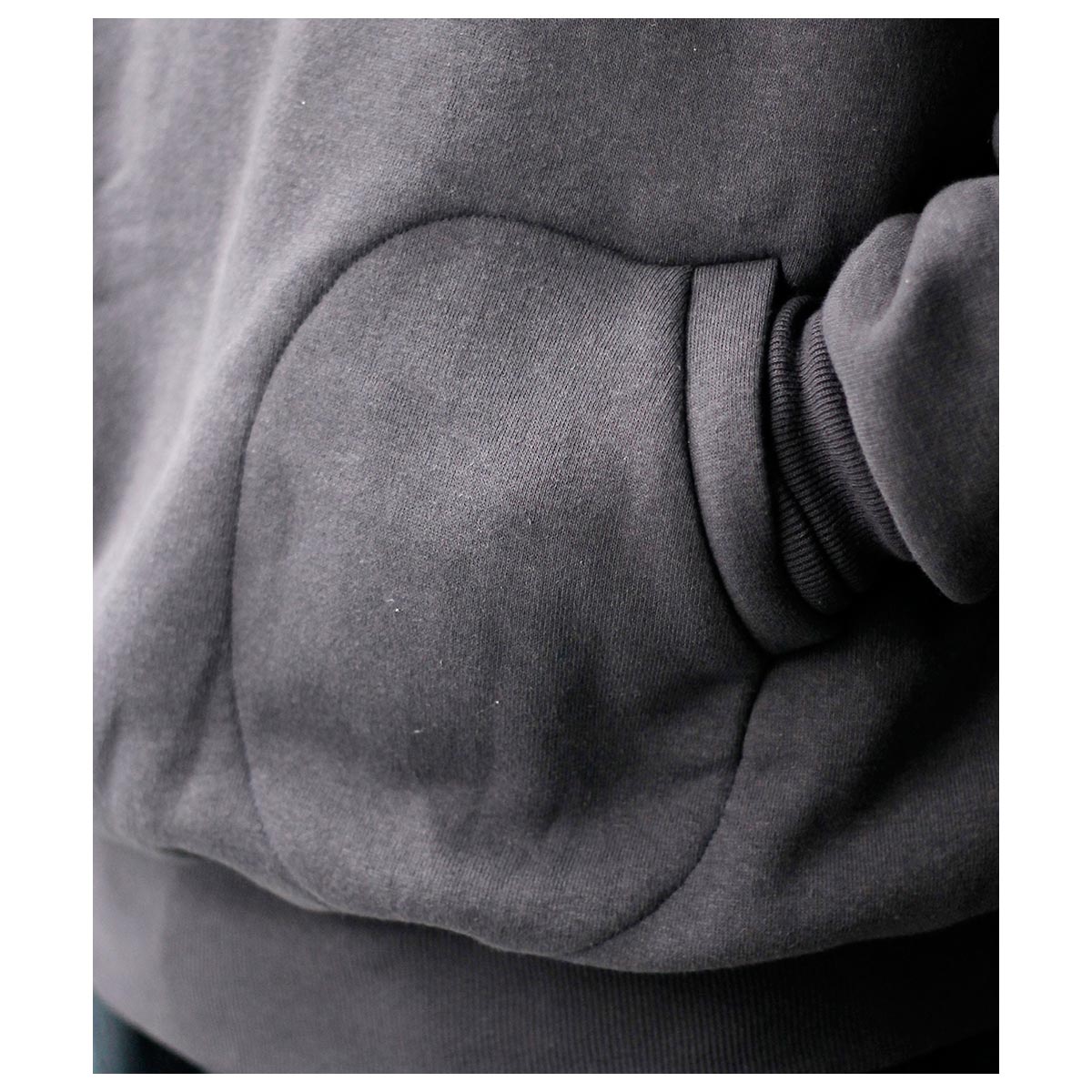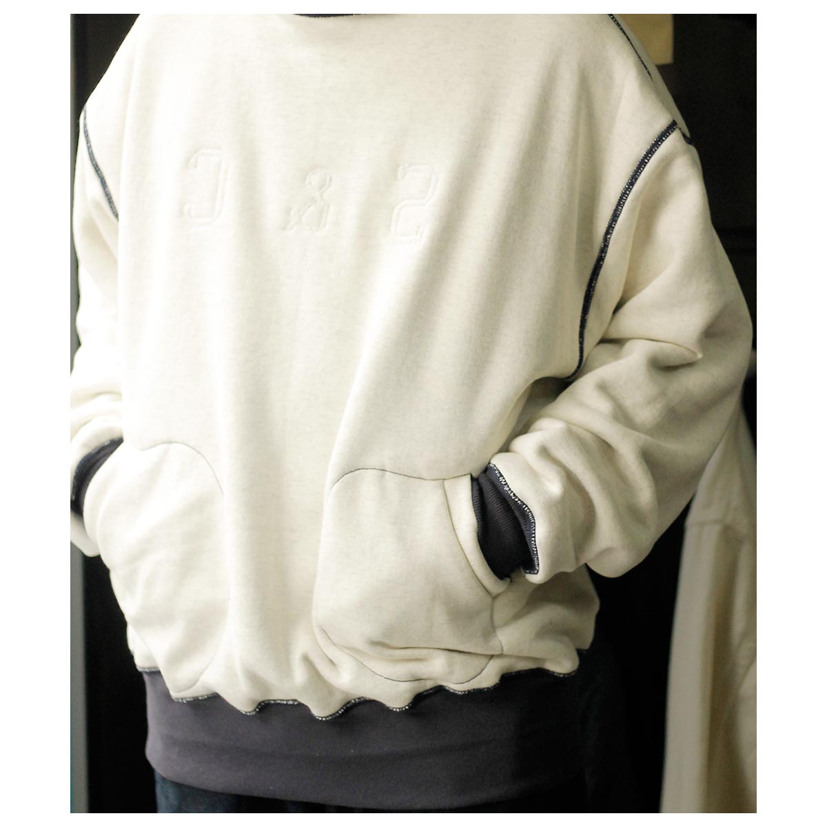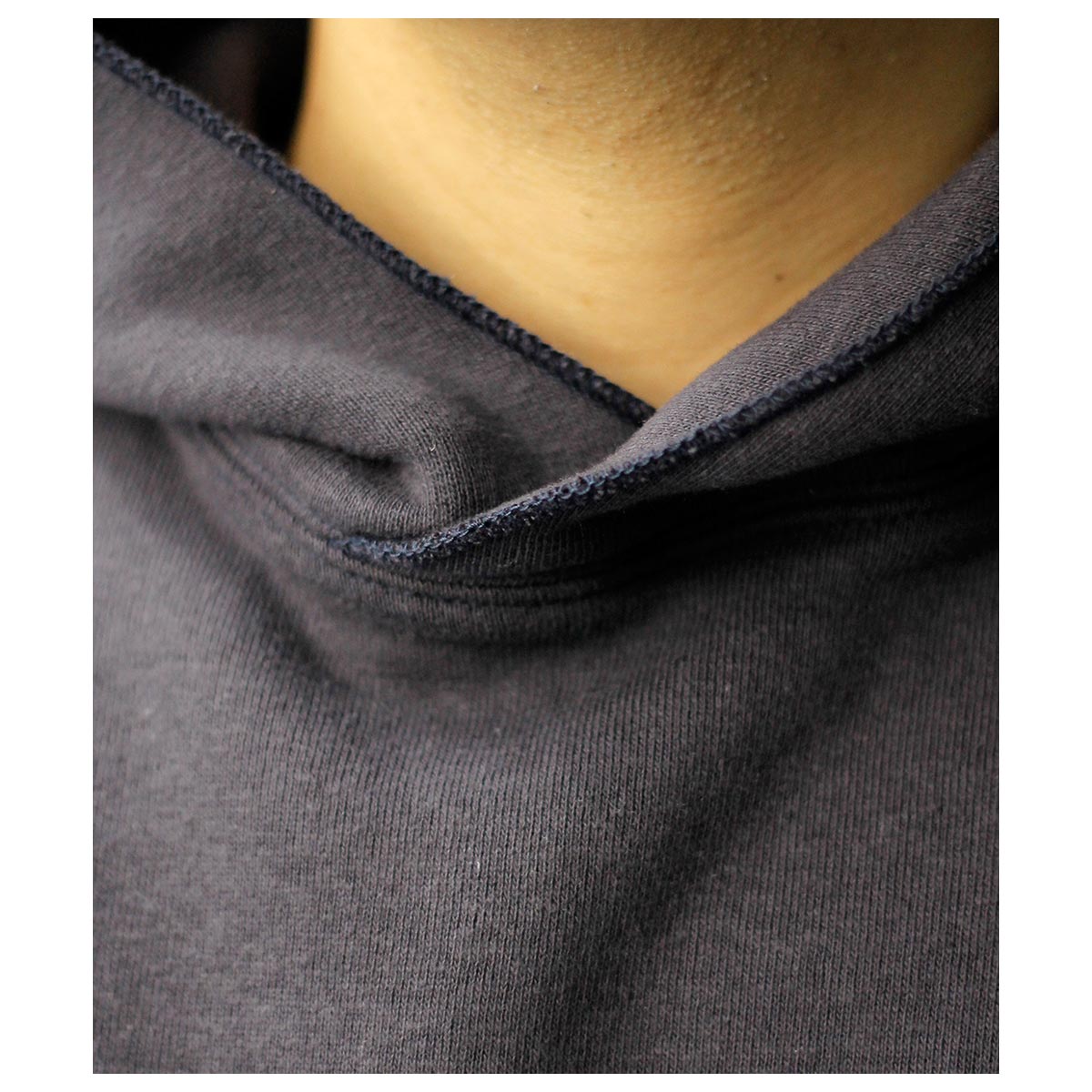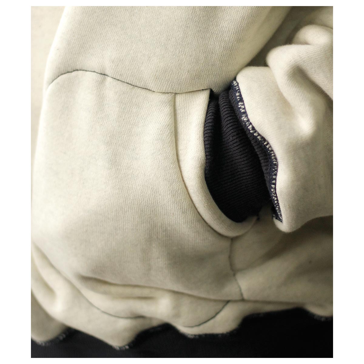 “ノックアウトの名前の由来は、ポケットの形が「ボクシンググローブ」だから。しかし、私のお気に入りのディテールは、トリムステッチを施したクロスオーバー・フードです。ダブルフェイスでポケットが両サイドに付いているため、1着で2着のスウェットが手に入るようなものです。 特に今回はツートーン・バージョンを開発しました!片面は無地、もう片面はコントラスト・トリム。気分に合わせてお選びください。”