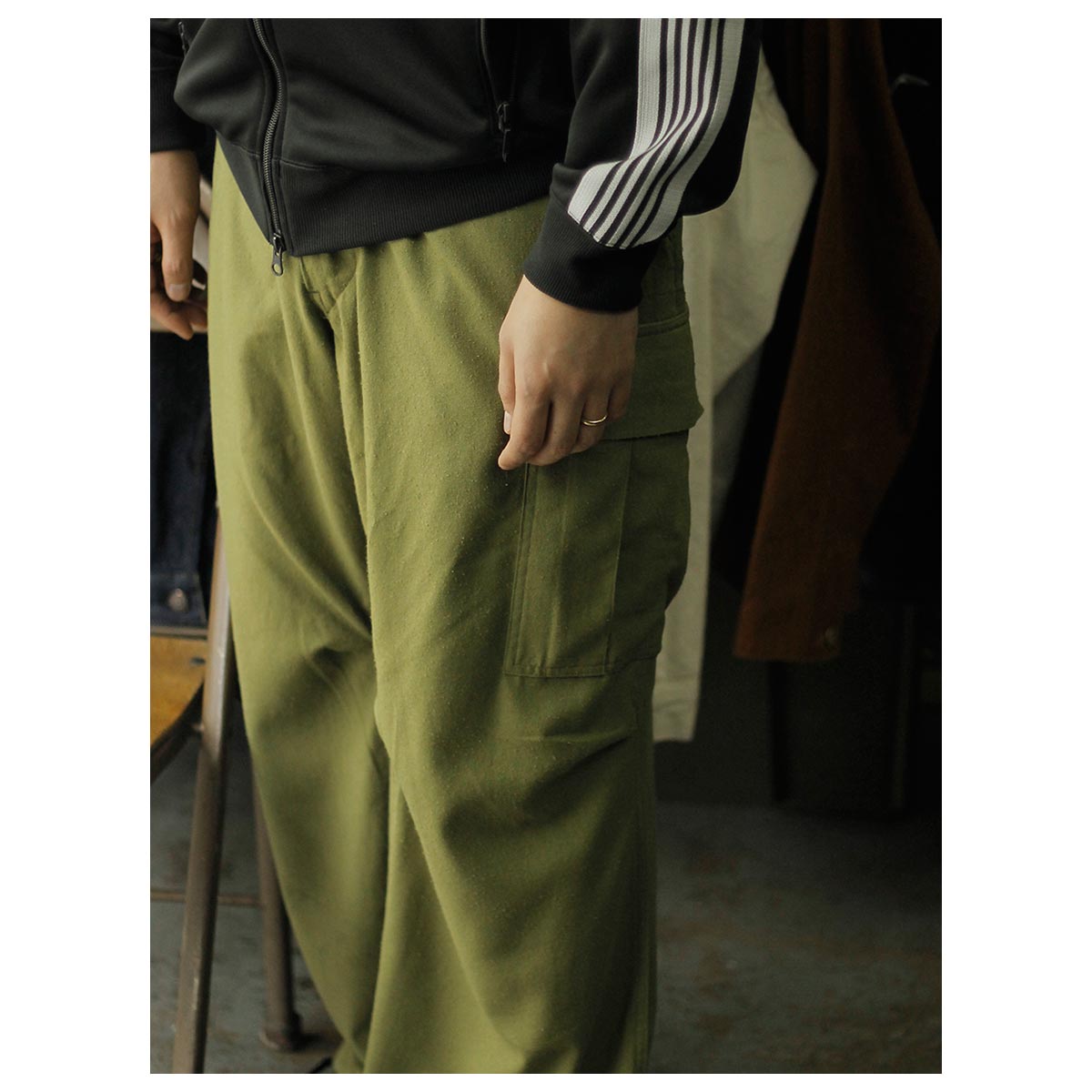 落ち着いたチャコールの中にほんのりと感じる艶感が、全体に品のある印象を与えてくれます。そこにオリーブのカーゴパンツを合わせることで、ミリタリーの無骨さを程よく中和し、重たくなりすぎないバランスに。