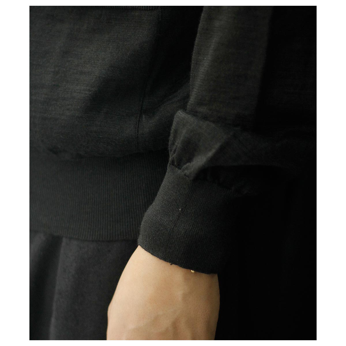 裾のみにリブを配しており、ミニマムな首回りには光沢のある貝ボタンを採用し上品な佇まいです。