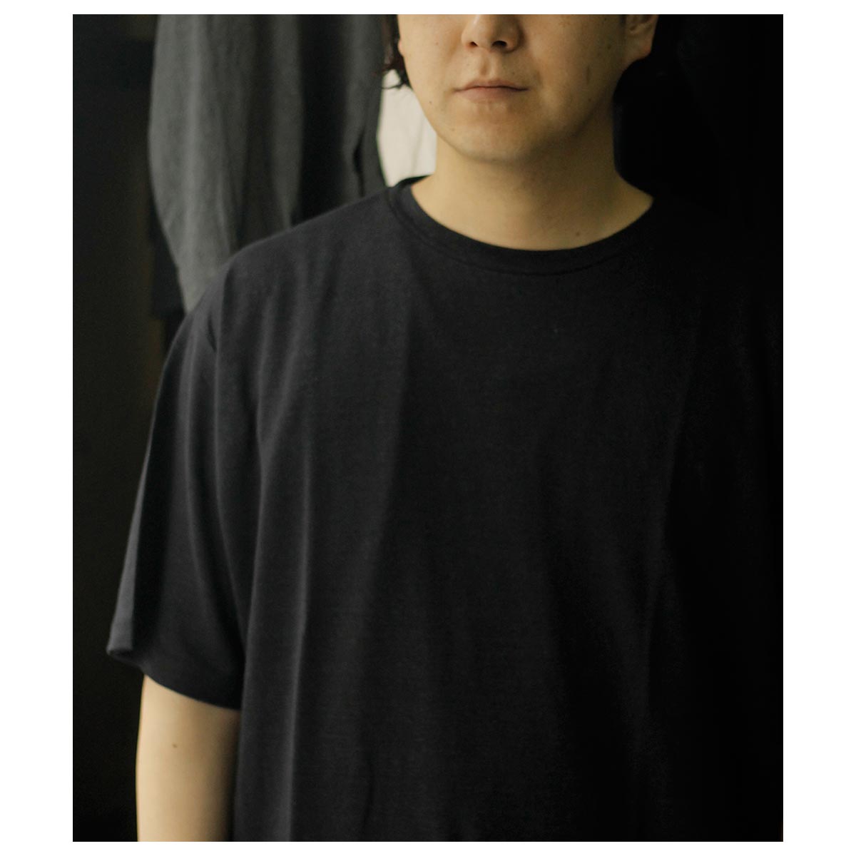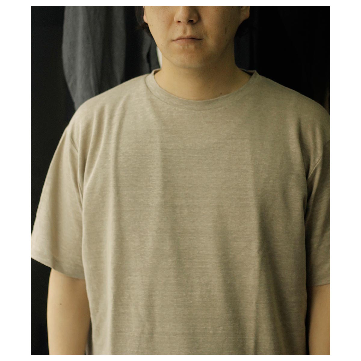 甘めの天竺組織でシンプルに編立て、強い洗いをかけることで、しなやかなドレープ感と柔らかな着心地、リネンならではの素材感が感じられるアイテムです。