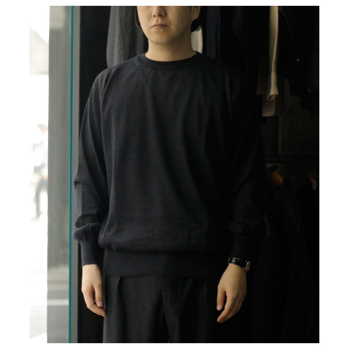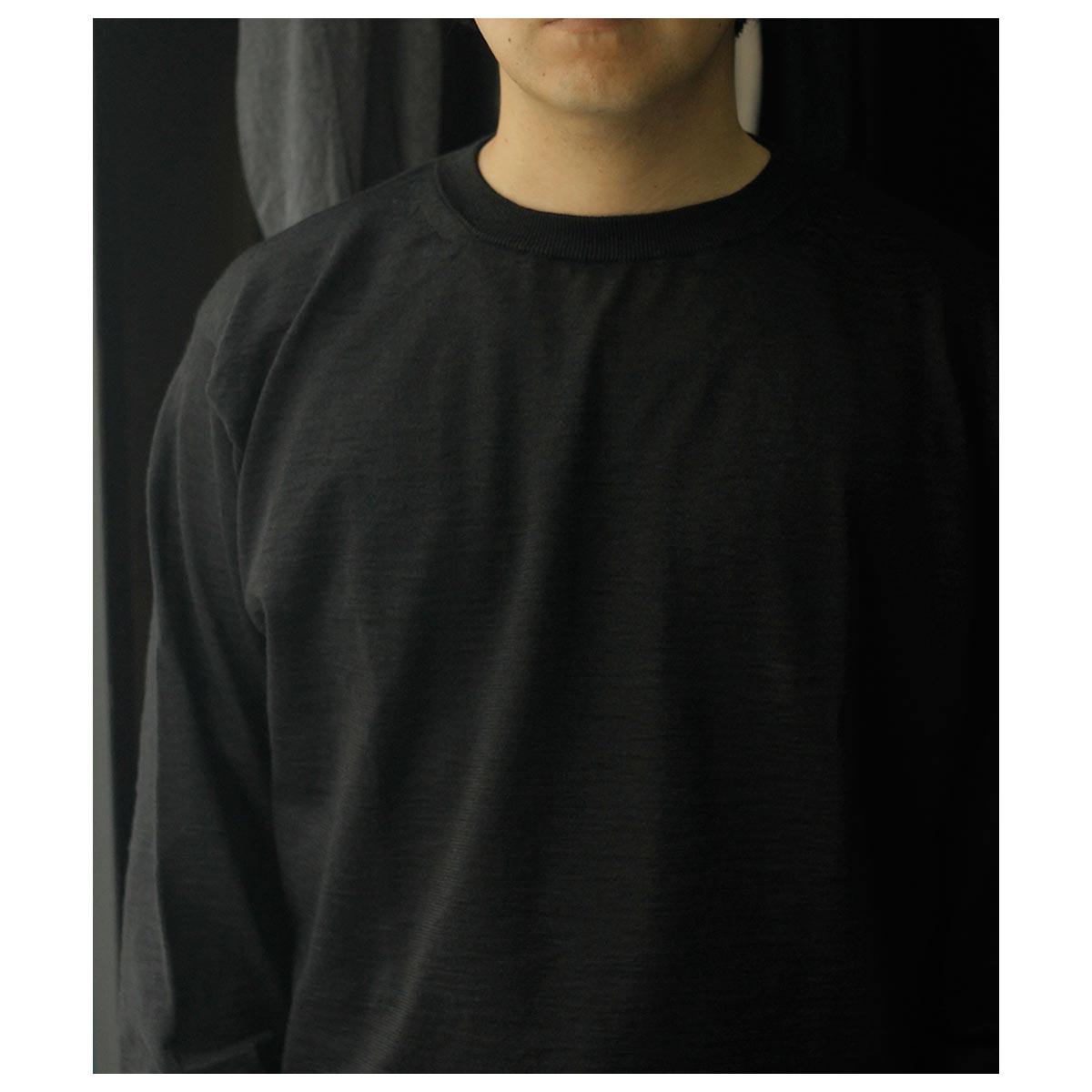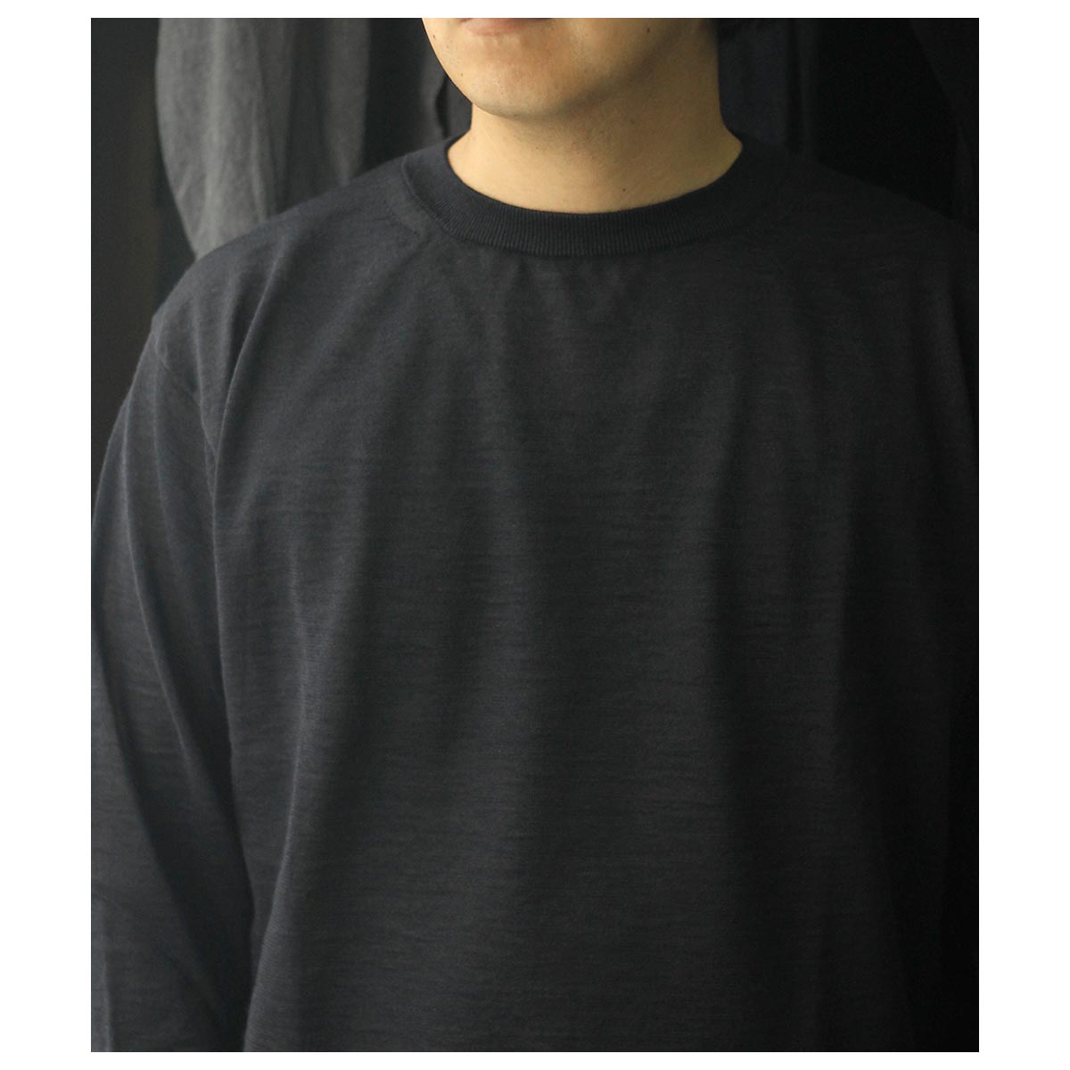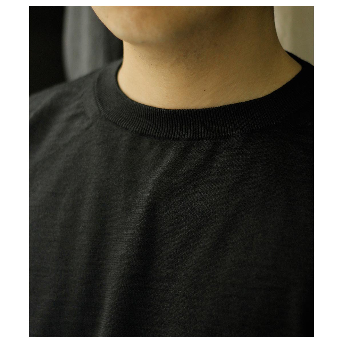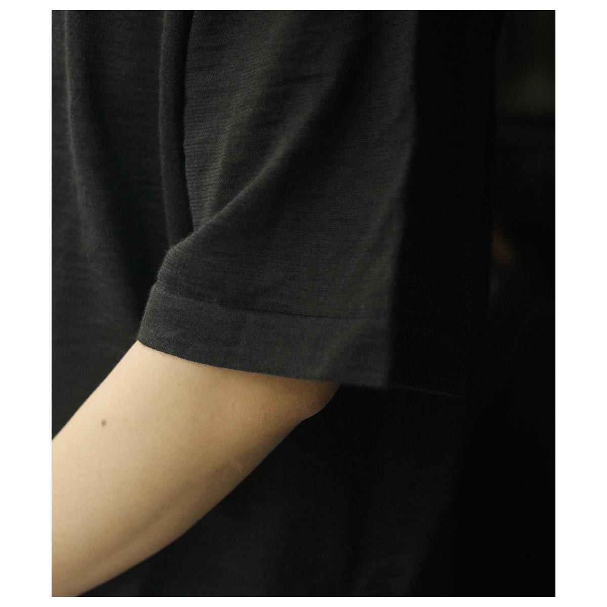 首回りはミニマムな設定で裾袖ともにリブを強めに配していて、透け感を楽しめる上品なシルエットにしています。タンクトップやノースリーブを合わせて、清涼感のある着こなしを楽しめます。