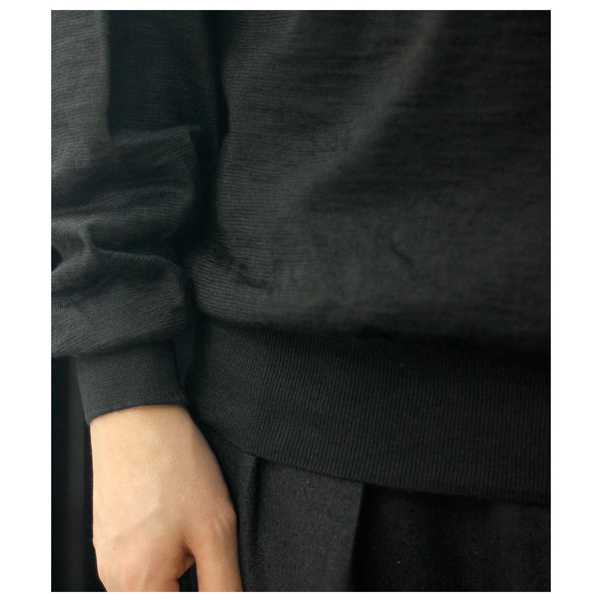 裾のみにリブを配しており、ミニマムな首回りには光沢のある貝ボタンを採用し上品な佇まいです。