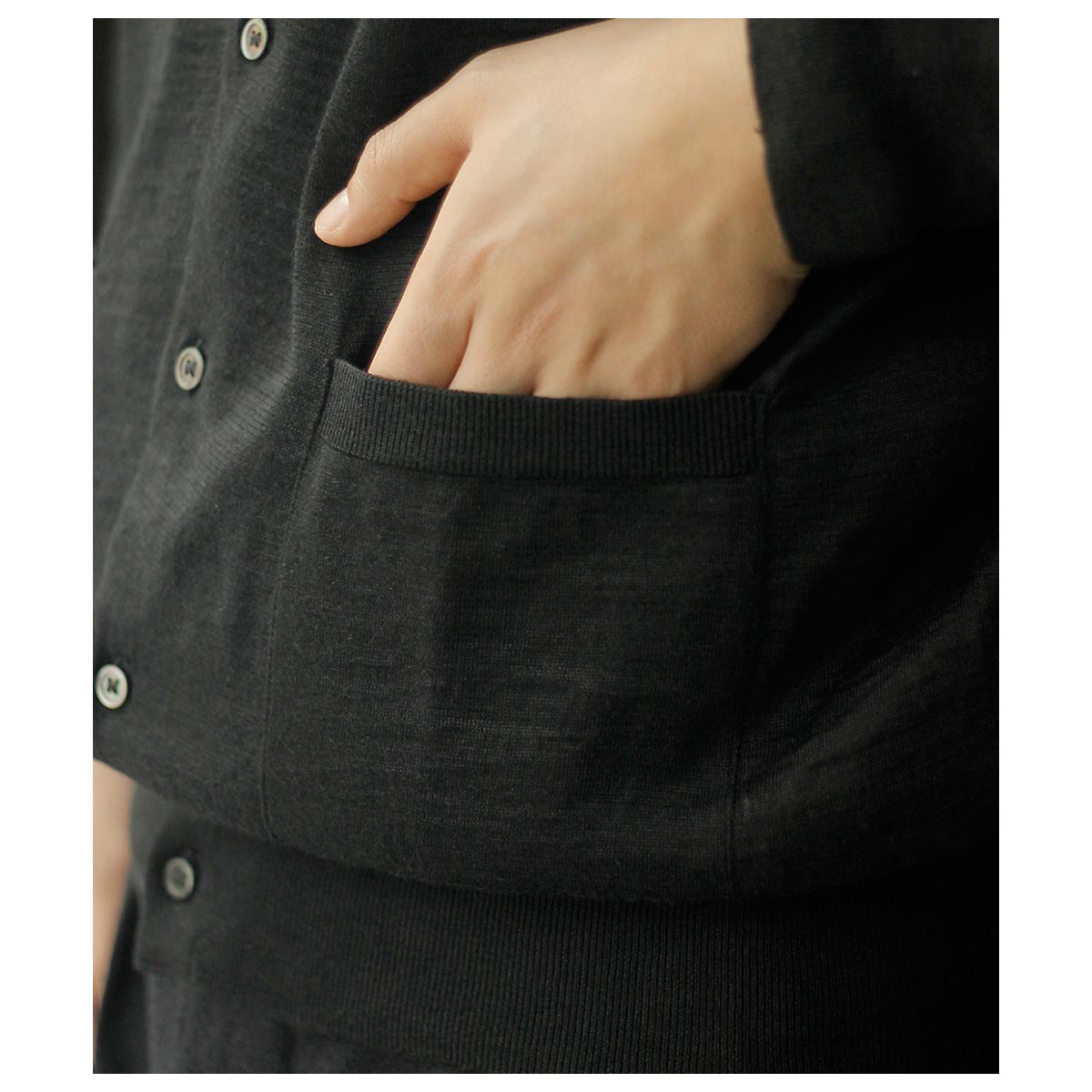 開けて着てラフにカットソーの上から着ても、閉めて上品に着ても素敵です。ボタンには小さめの貝ボタンを採用し、サイドにはポケットを付けています。