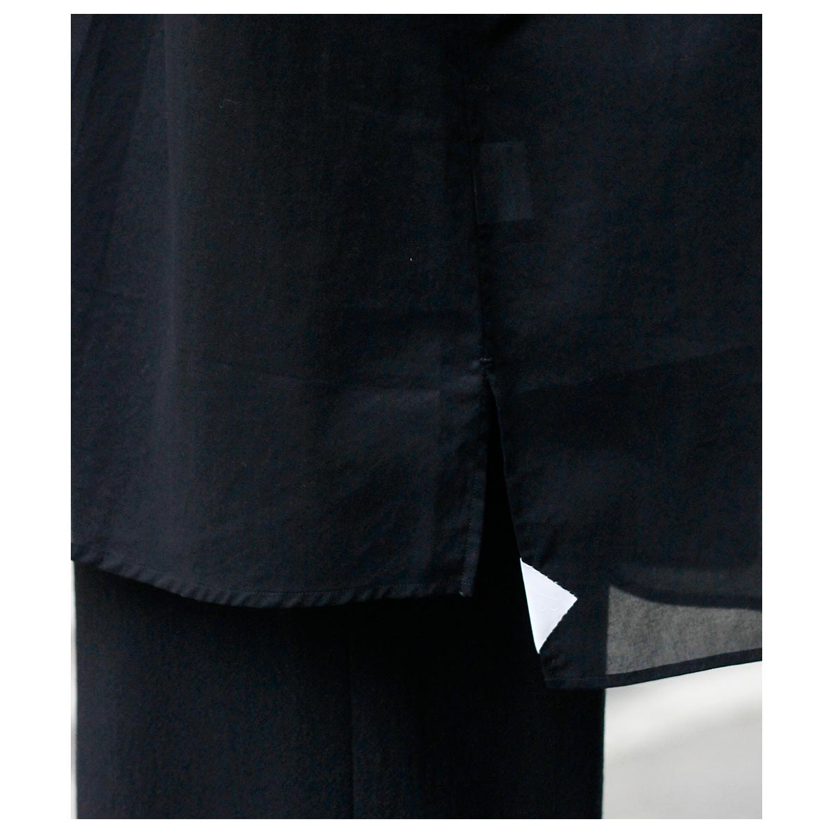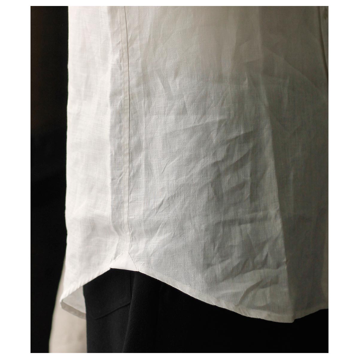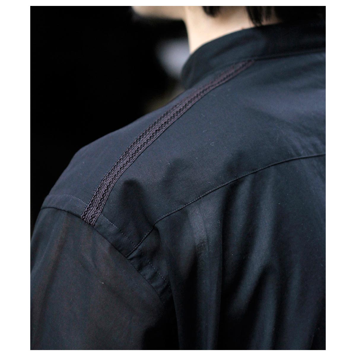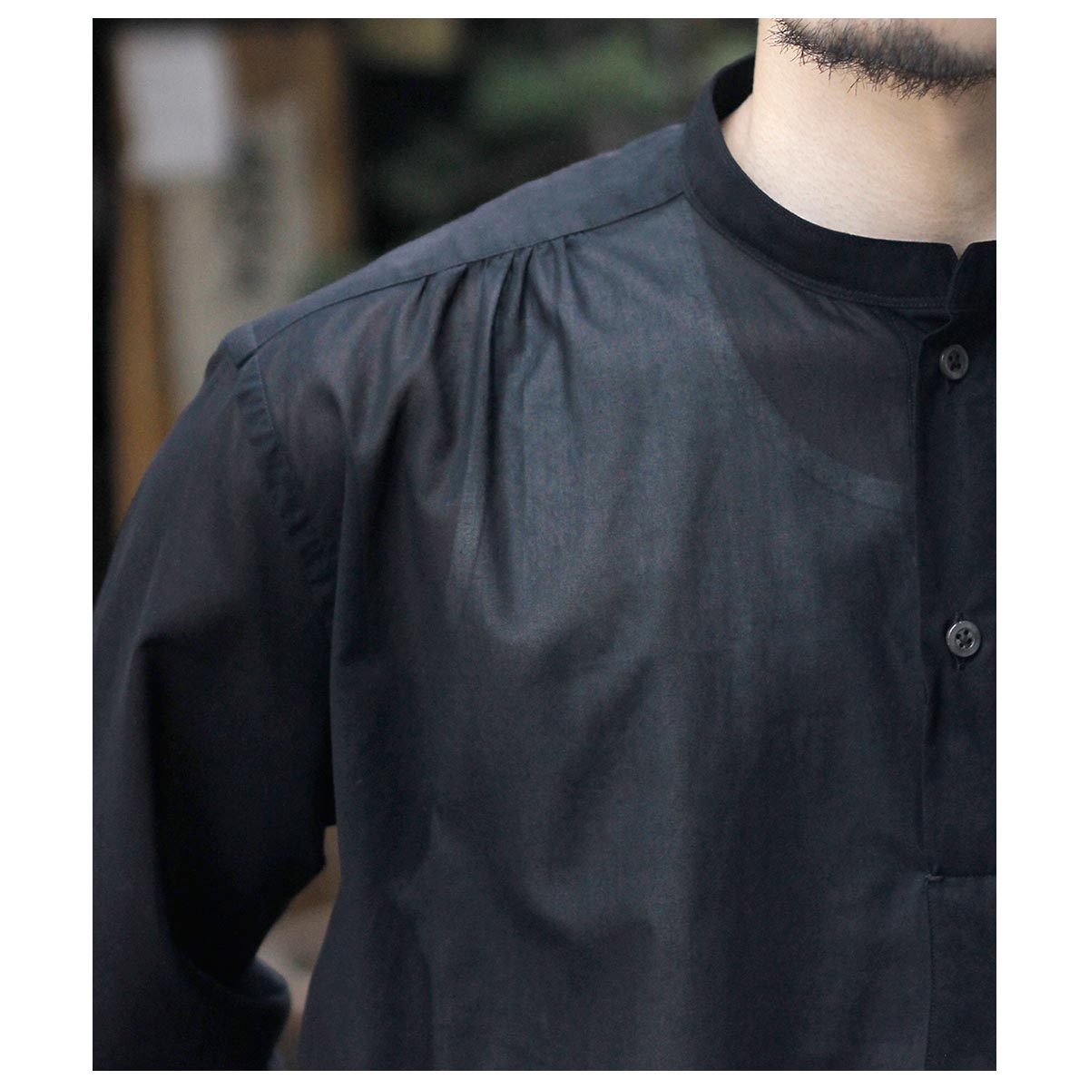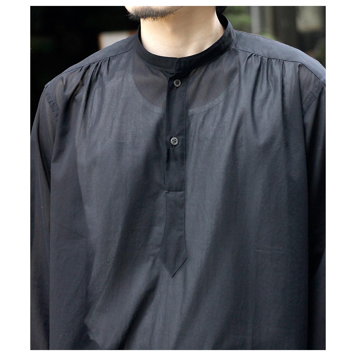 これがコットン100%?と思わせてくれる独特な肌触り。限界まで強撚した100/2のケバをガス焼きしシャリ感と強度を両立、さらに特殊加工を施すことで今まで触ったことのないようなタッチに仕上がっています。光を通さない黒は重く感じますがこの透け感だからこそ黒を選んだ、そう思わせてくれた生地です。
