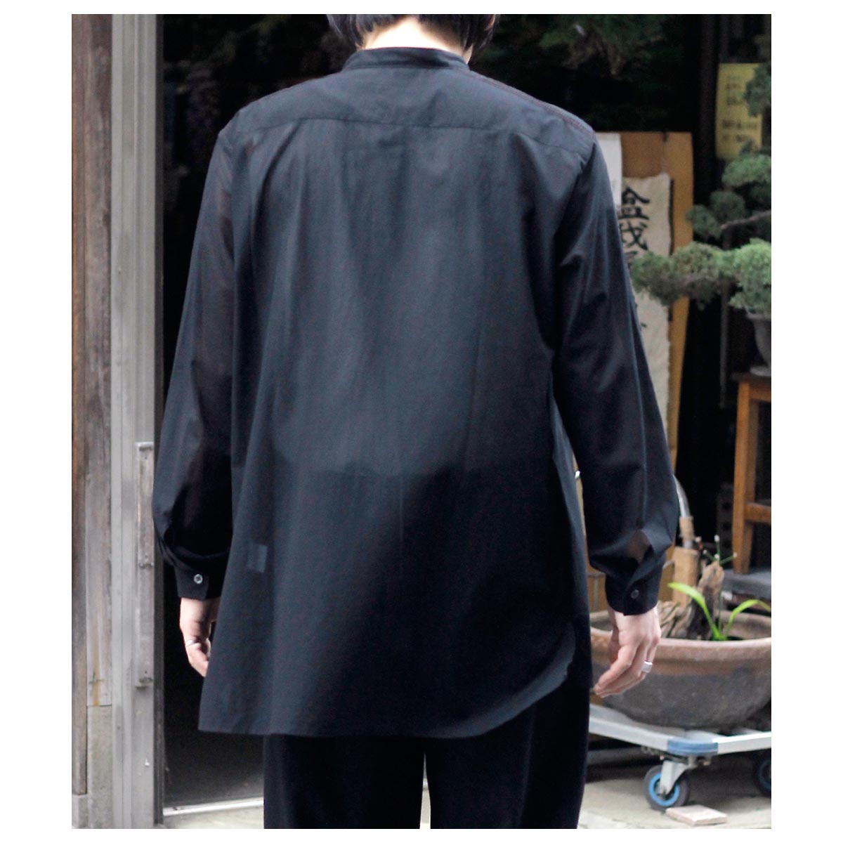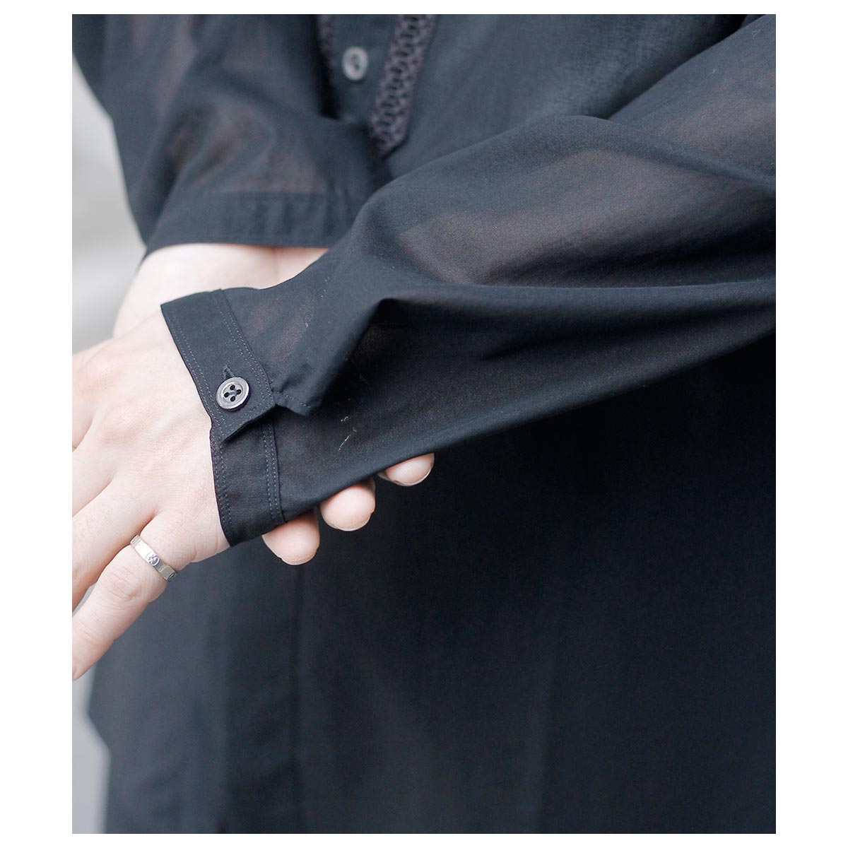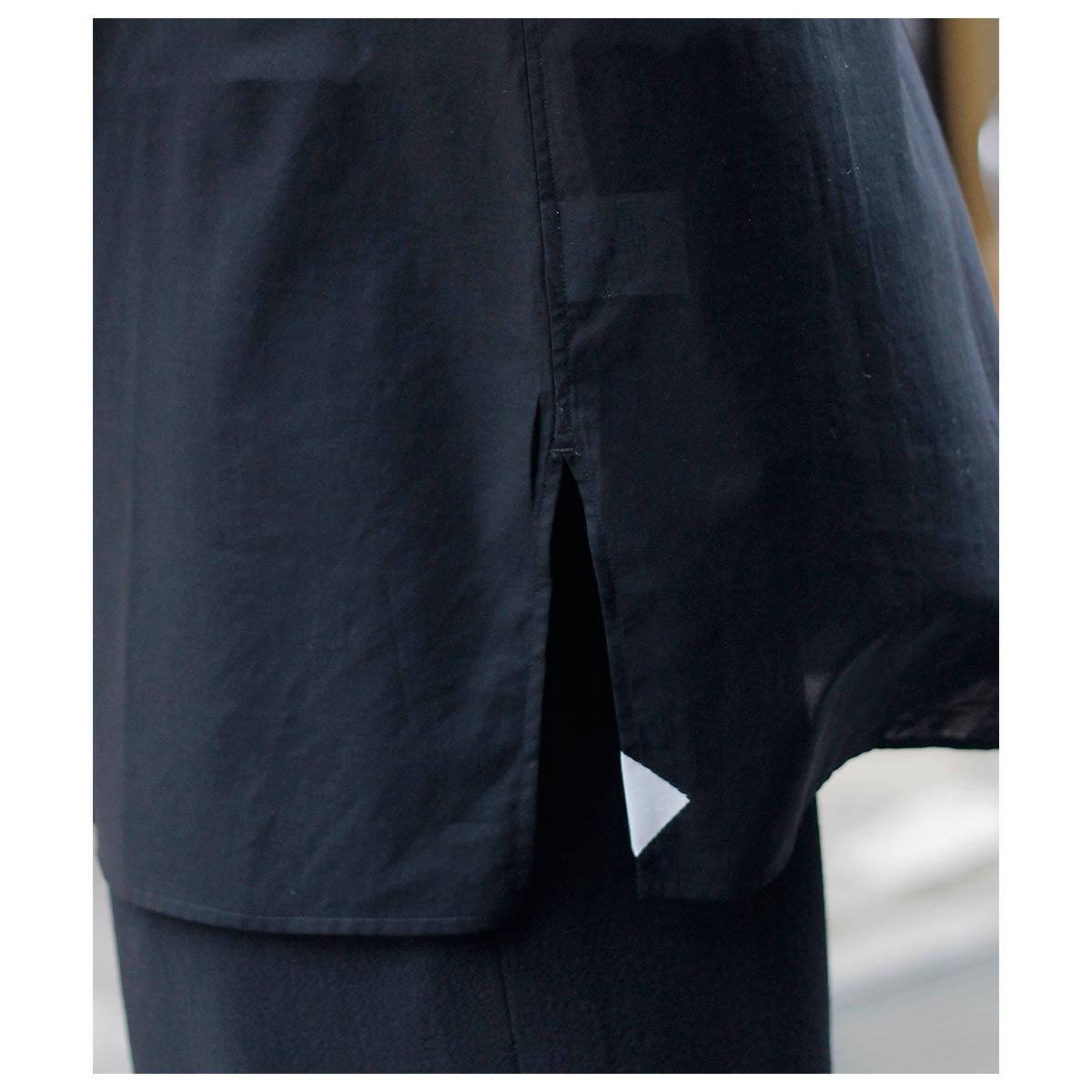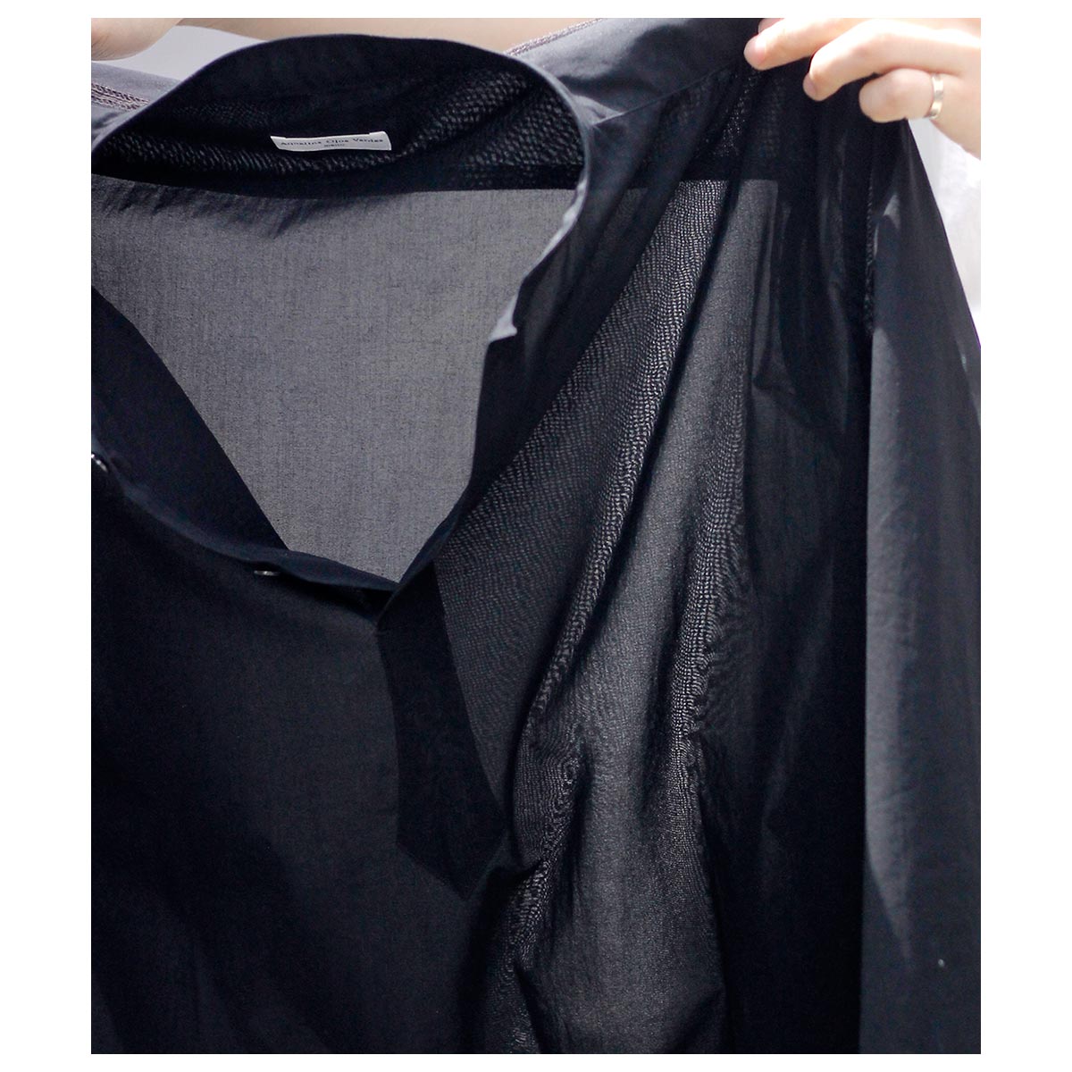 これがコットン100%?と思わせてくれる独特な肌触り。限界まで強撚した100/2のケバをガス焼きしシャリ感と強度を両立、さらに特殊加工を施すことで今まで触ったことのないようなタッチに仕上がっています。光を通さない黒は重く感じますがこの透け感だからこそ黒を選んだ、そう思わせてくれた生地です。