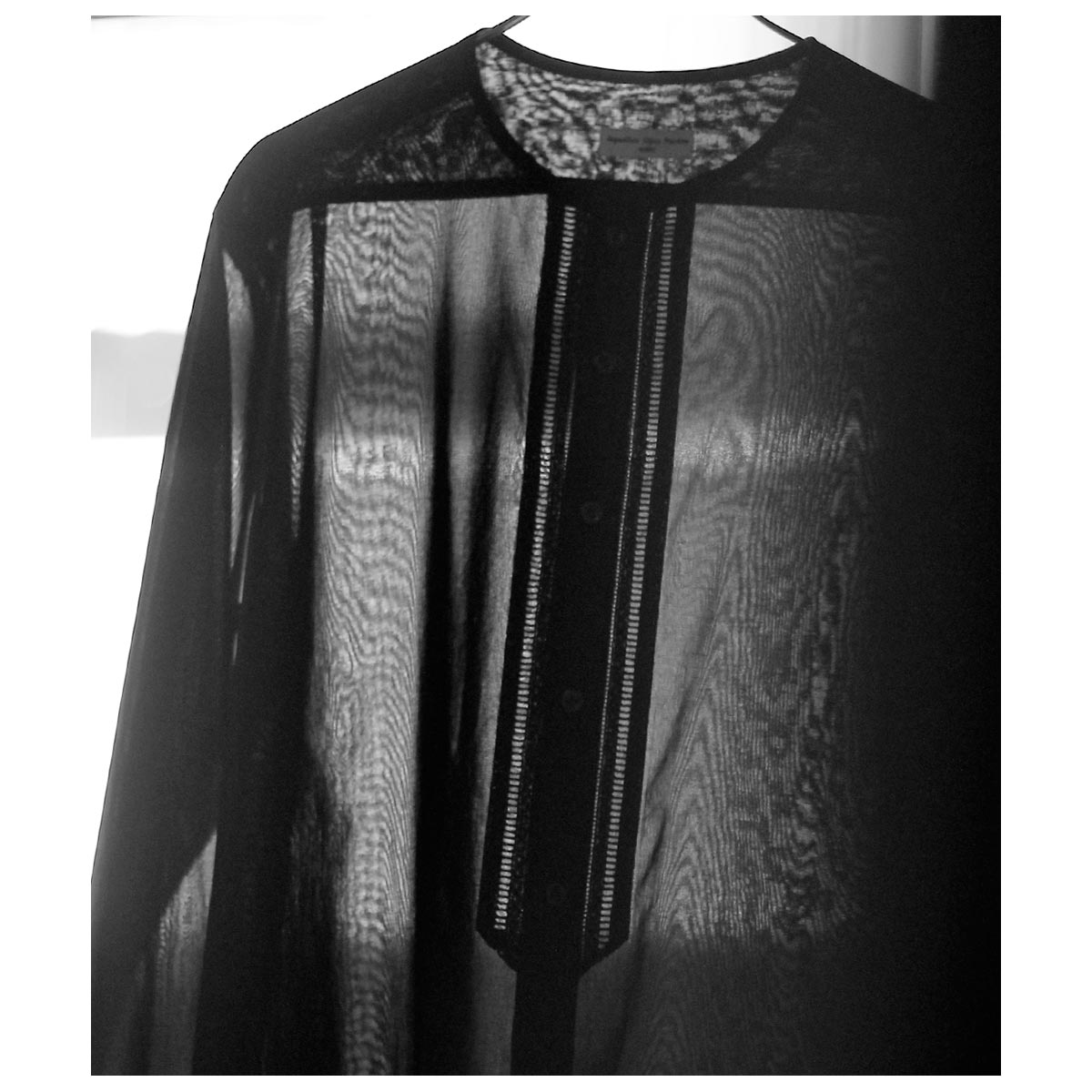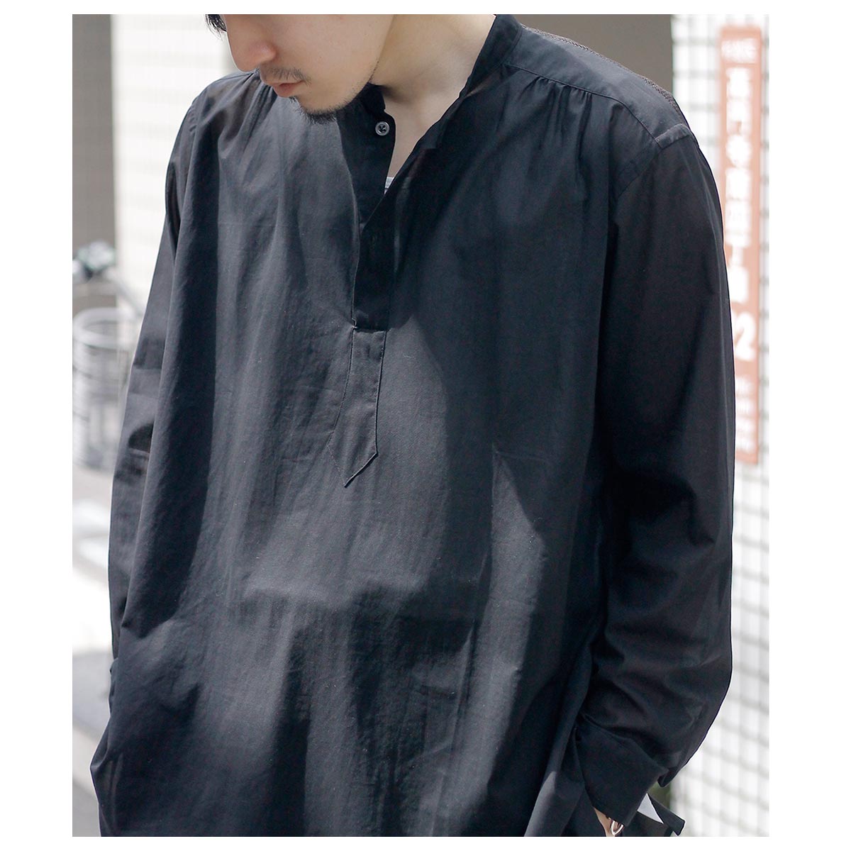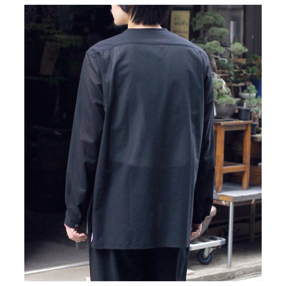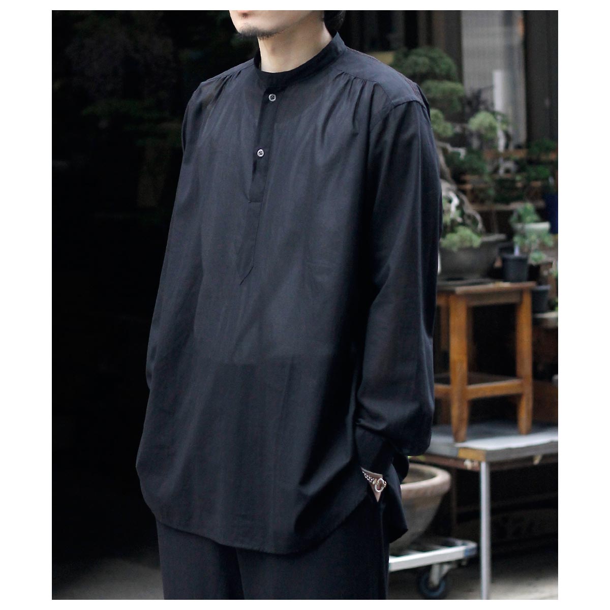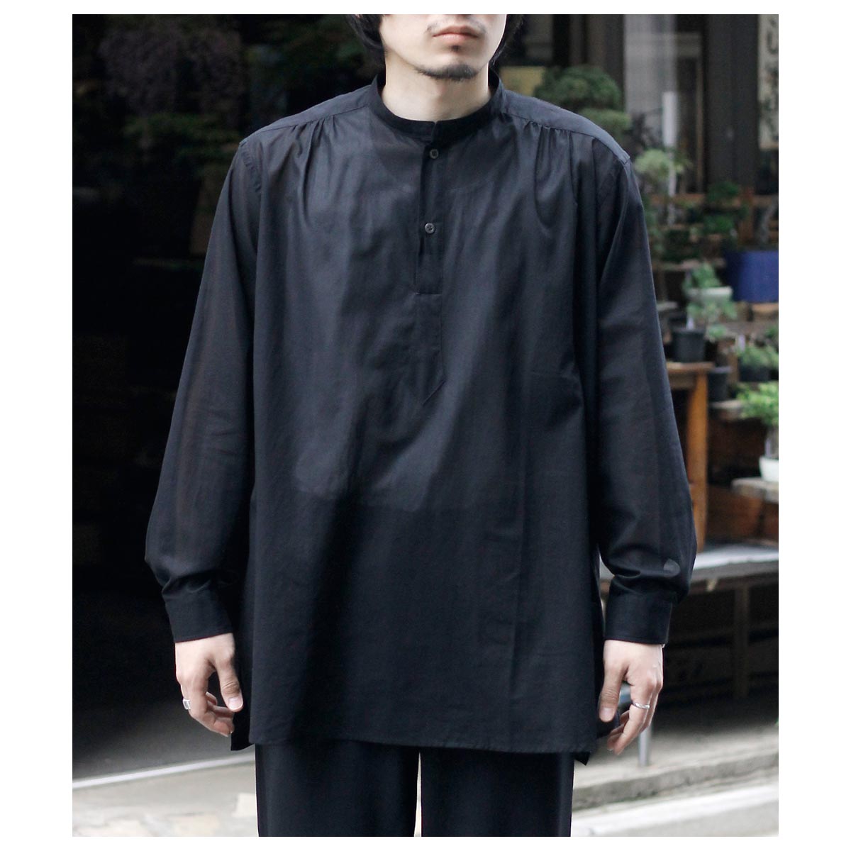 これがコットン100%?と思わせてくれる独特な肌触り。限界まで強撚した100/2のケバをガス焼きしシャリ感と強度を両立、さらに特殊加工を施すことで今まで触ったことのないようなタッチに仕上がっています。光を通さない黒は重く感じますがこの透け感だからこそ黒を選んだ、そう思わせてくれた生地です。