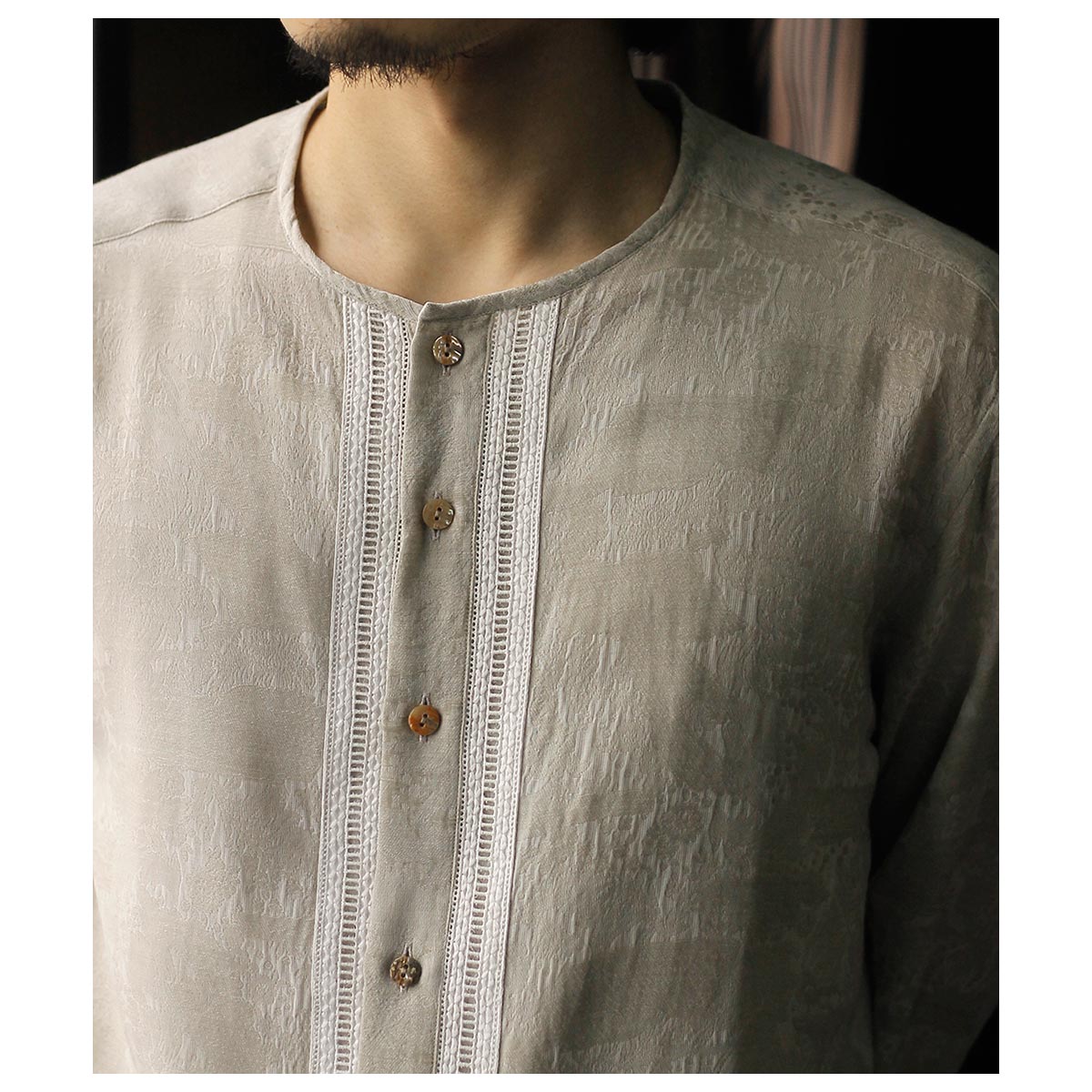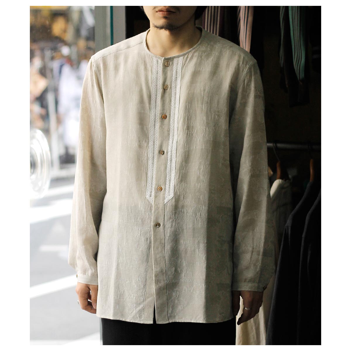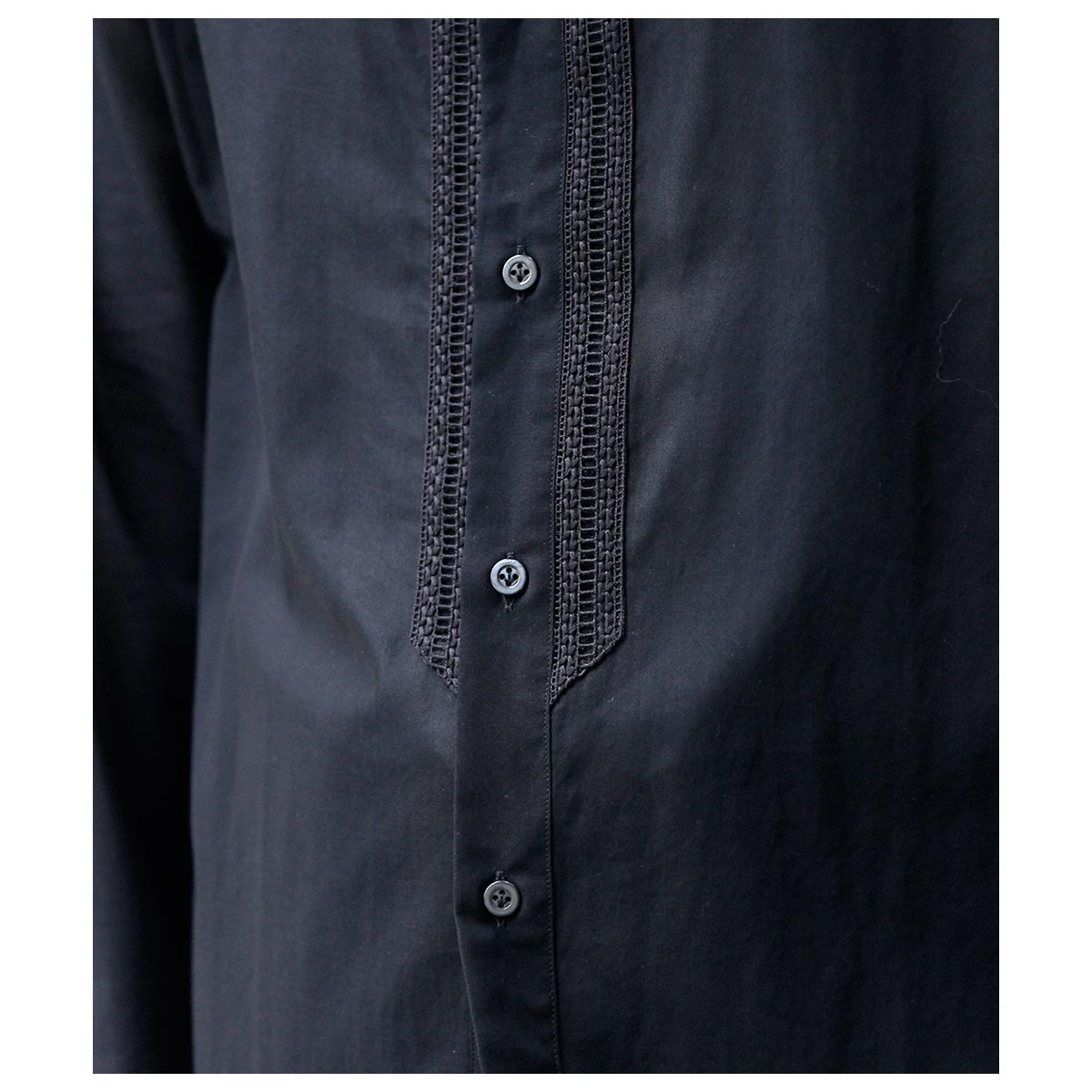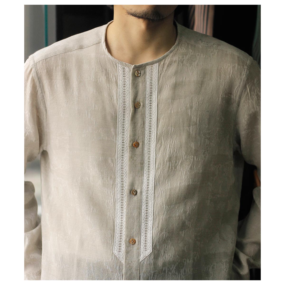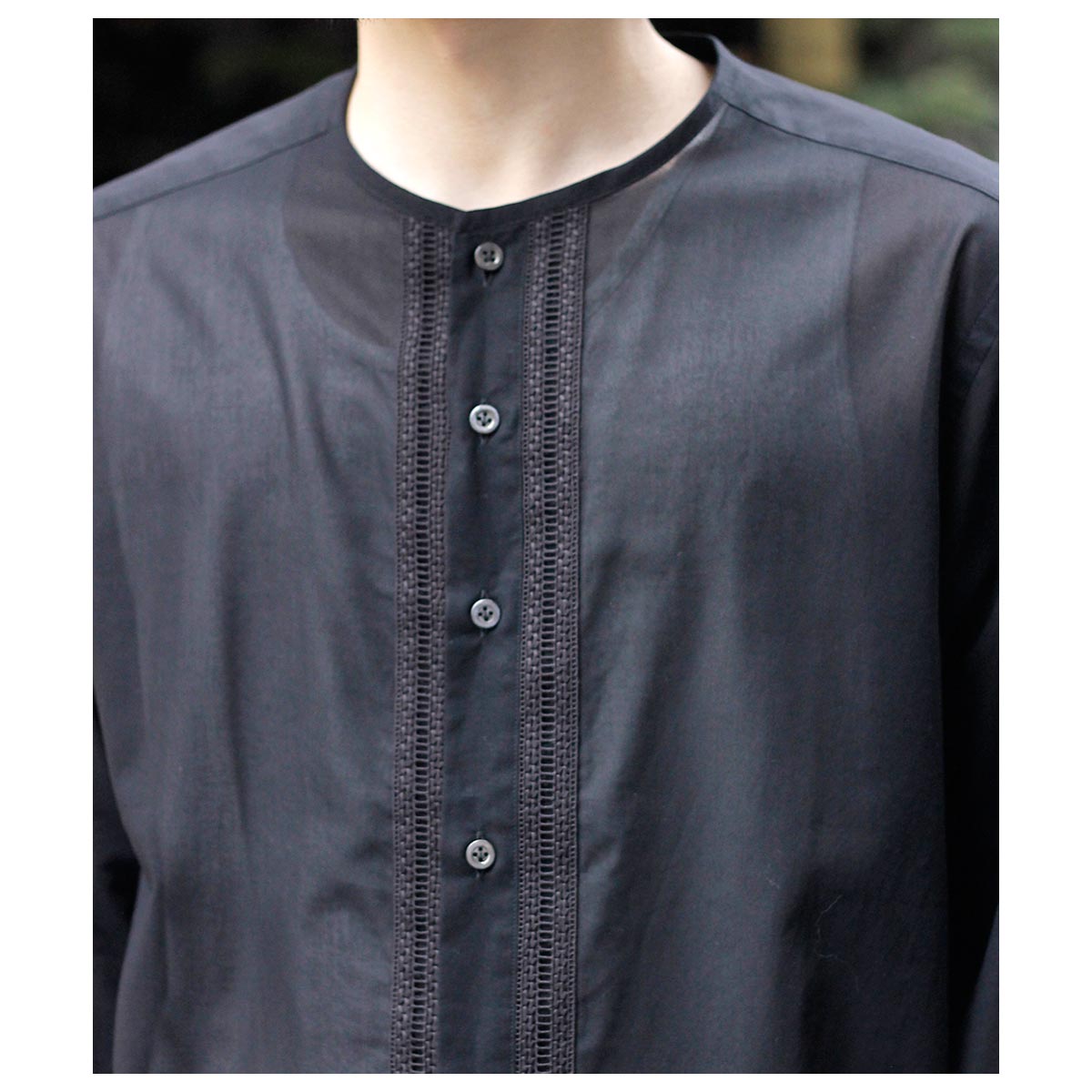 デザイナーが若い時に愛用したという刺繍入りの透け感のあるメキシコ製のシャツがベース。いつまでも色褪せないファッションアイテムの一つです。そんな思い出からのスタートで今回は敢えて衿をパイピング仕様にして衿元に触れない軽さや風通しを求めました。また前立ての綿レースをイカ胸のイメージで挟み込み、他の部分はなるべく削ぎ落とした仕様で仕上げました。
