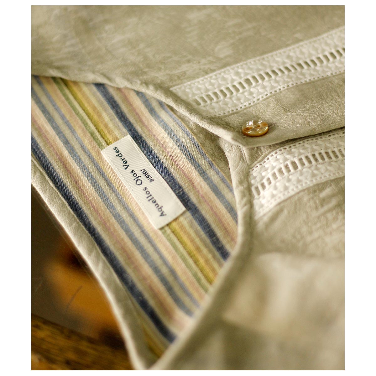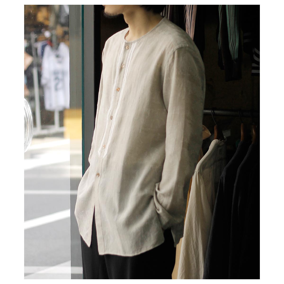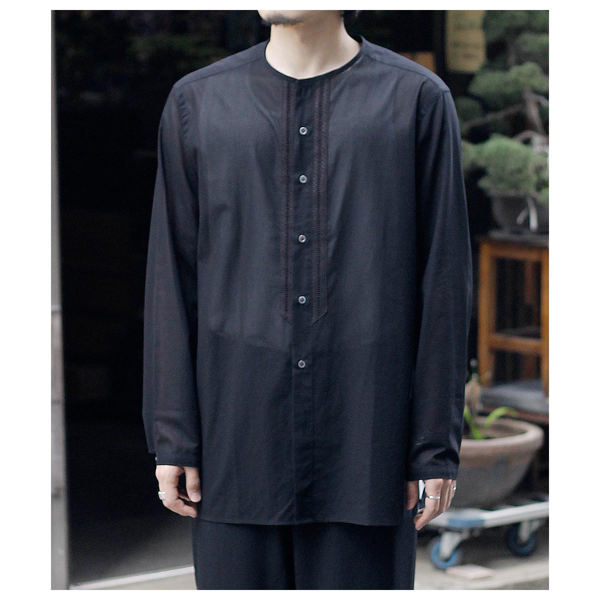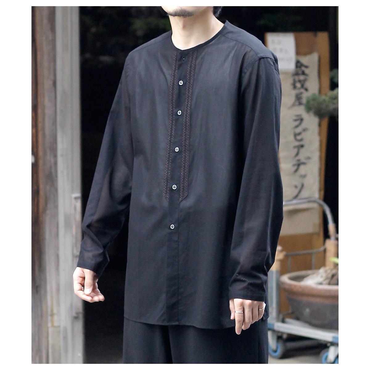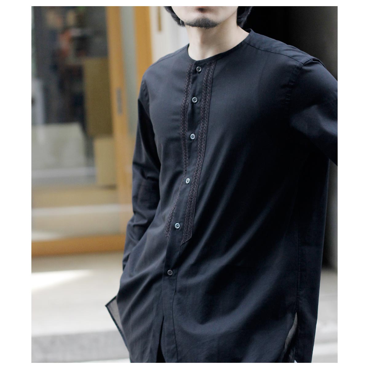 デザイナーが若い時に愛用したという刺繍入りの透け感のあるメキシコ製のシャツがベース。いつまでも色褪せないファッションアイテムの一つです。そんな思い出からのスタートで今回は敢えて衿をパイピング仕様にして衿元に触れない軽さや風通しを求めました。また前立ての綿レースをイカ胸のイメージで挟み込み、他の部分はなるべく削ぎ落とした仕様で仕上げました。