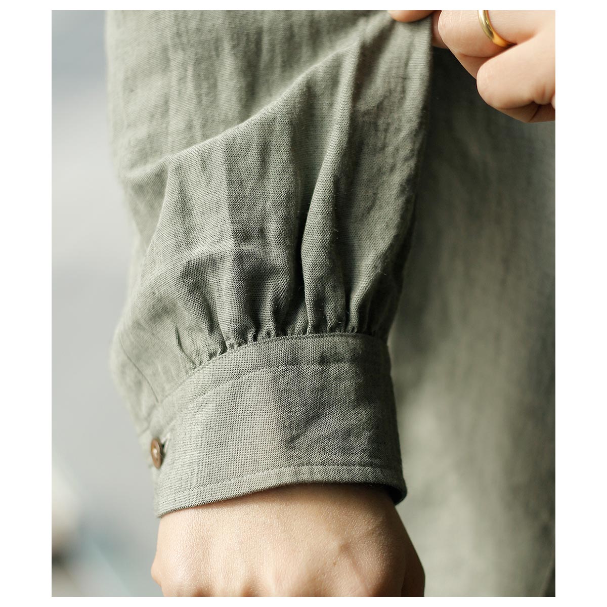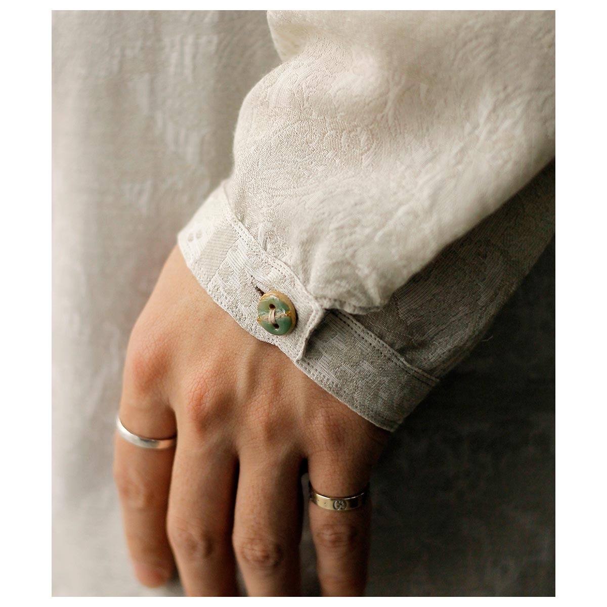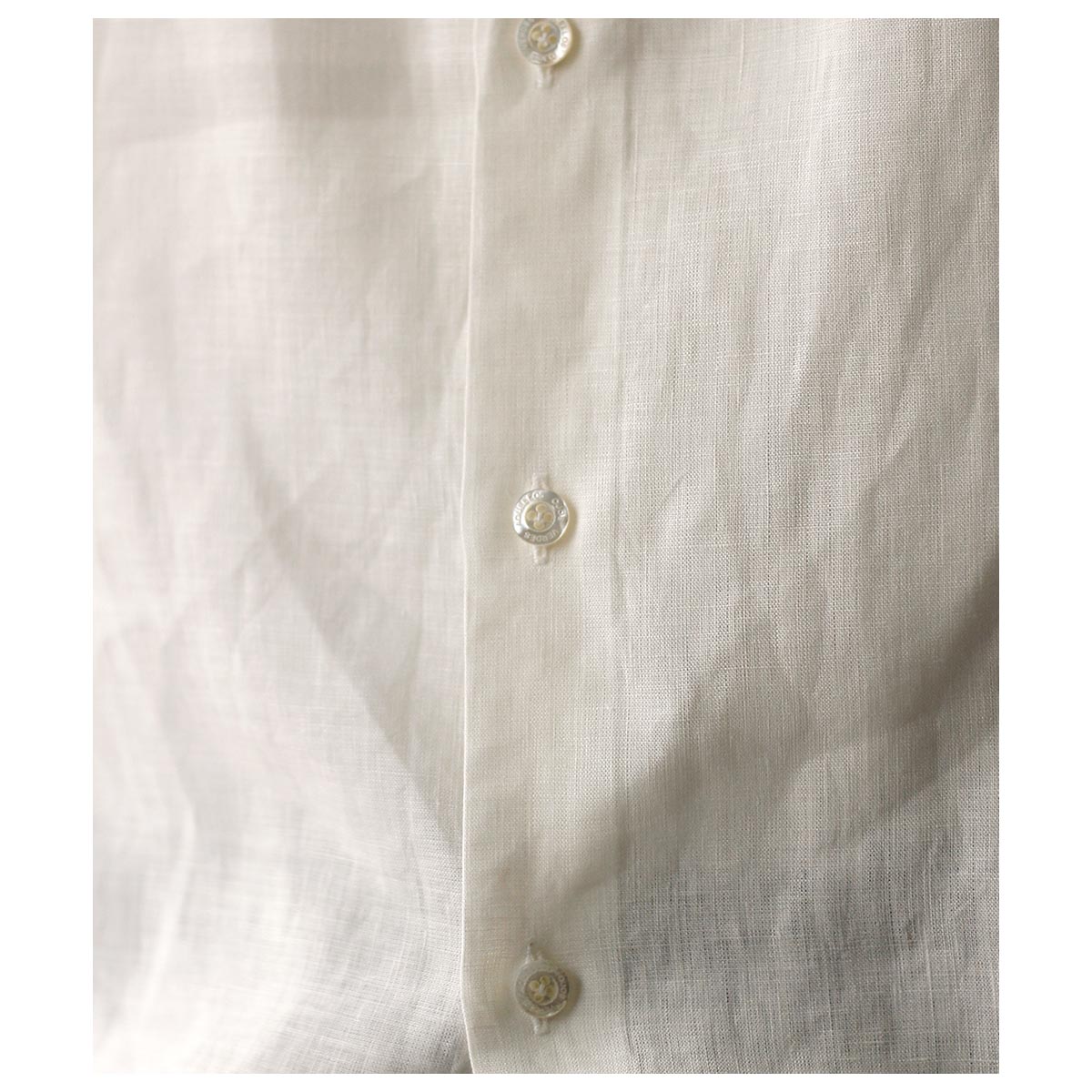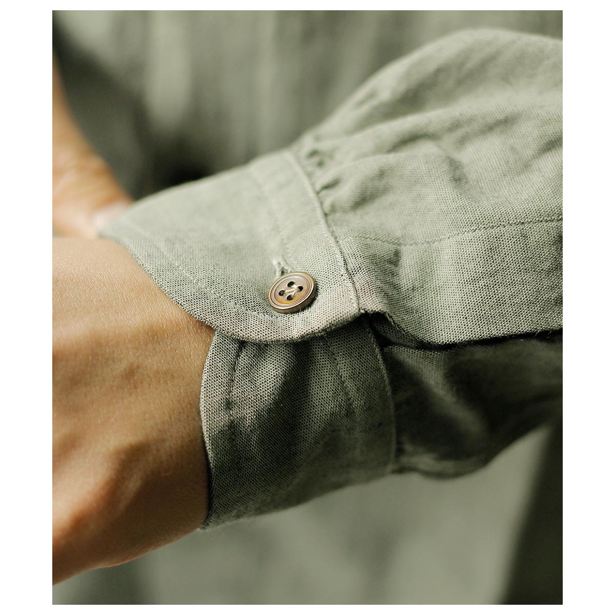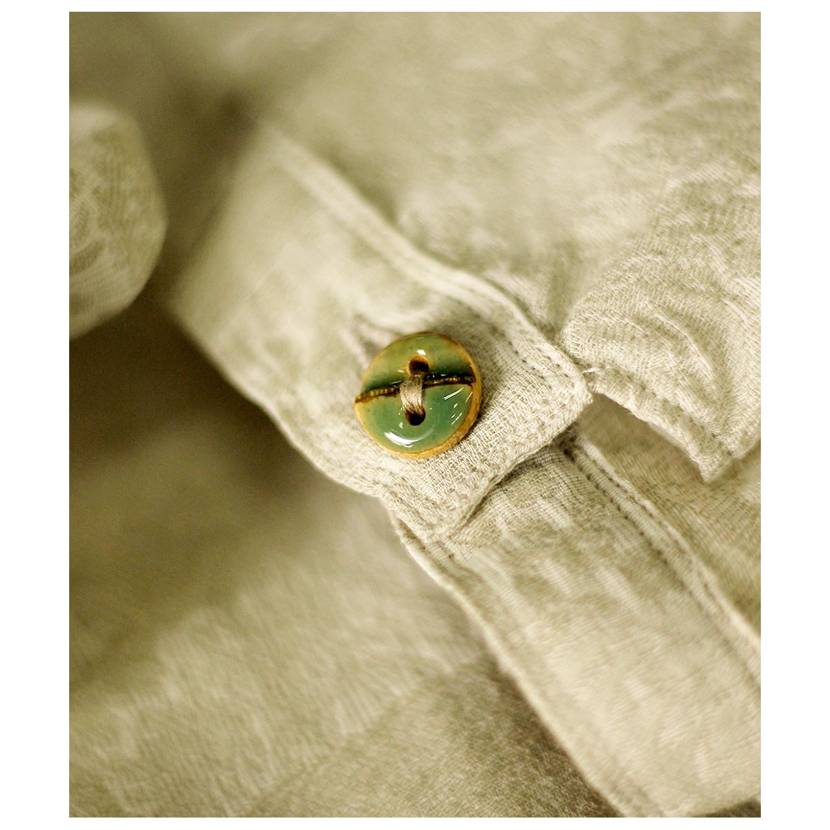 ボタンは前立てアワビ貝ボタン、袖口には陶器風木製ITALYボタンを使用。