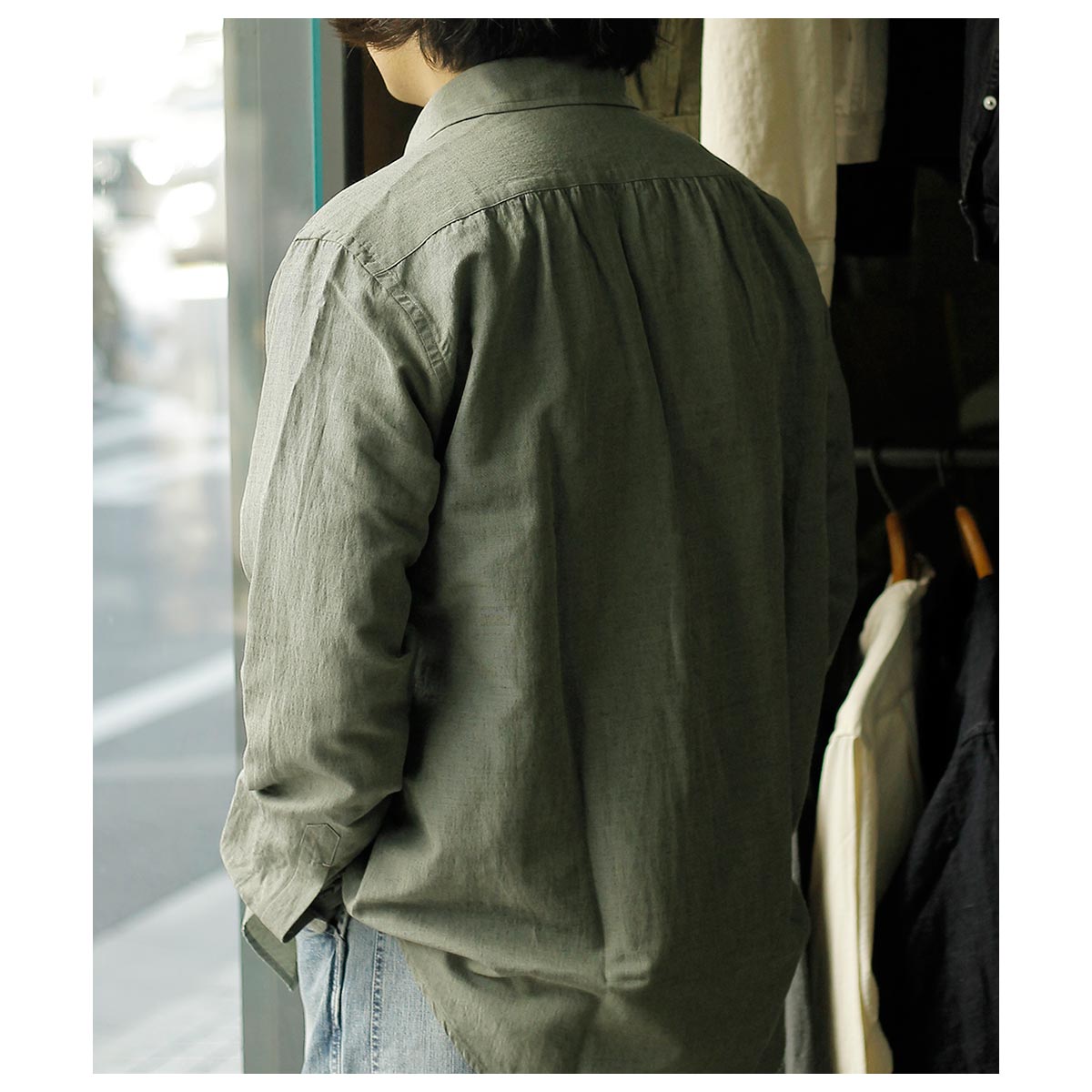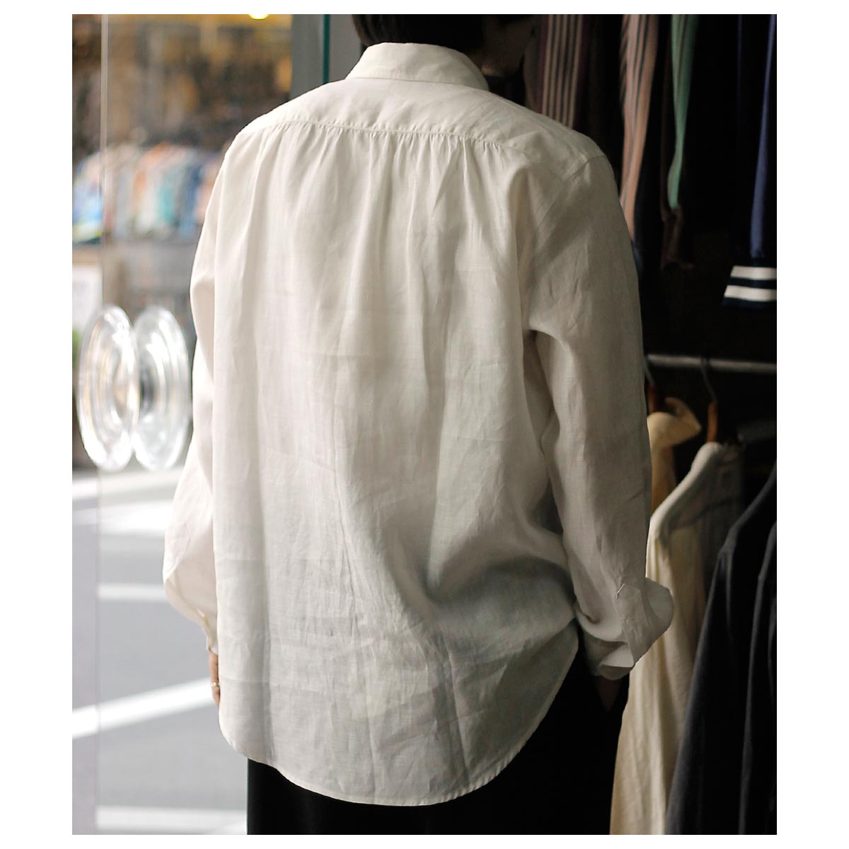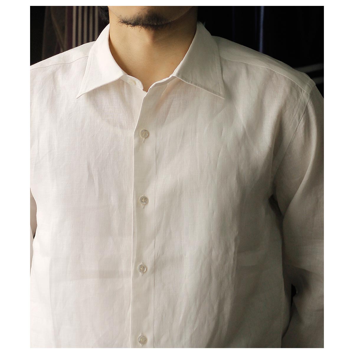 ’20年~’40年頃ファッションに精通した英国のエドワード8世のちのウインザー公が愛用した衿型からウインザーワイドカラー。衿を開けた時にも軽さを感じる少し上品なワイドカラーに、後ろ身頃はギャザーをよせて定番の両脇手縫いガゼット。南イタリアのドレスシャツの系譜をひいたリラックスドレススタイルです。 ボタンにはナチュラルなナット釦を使用しております。