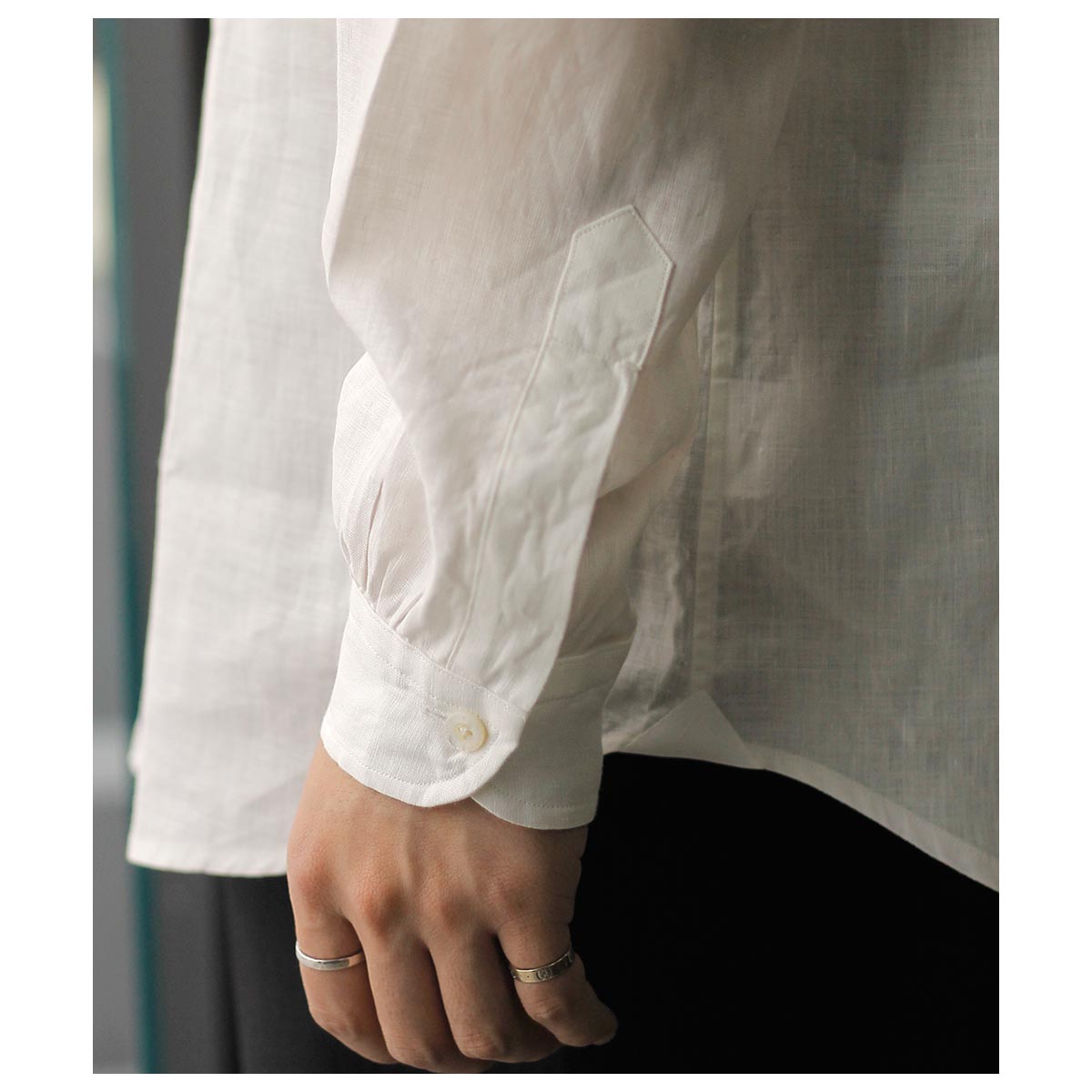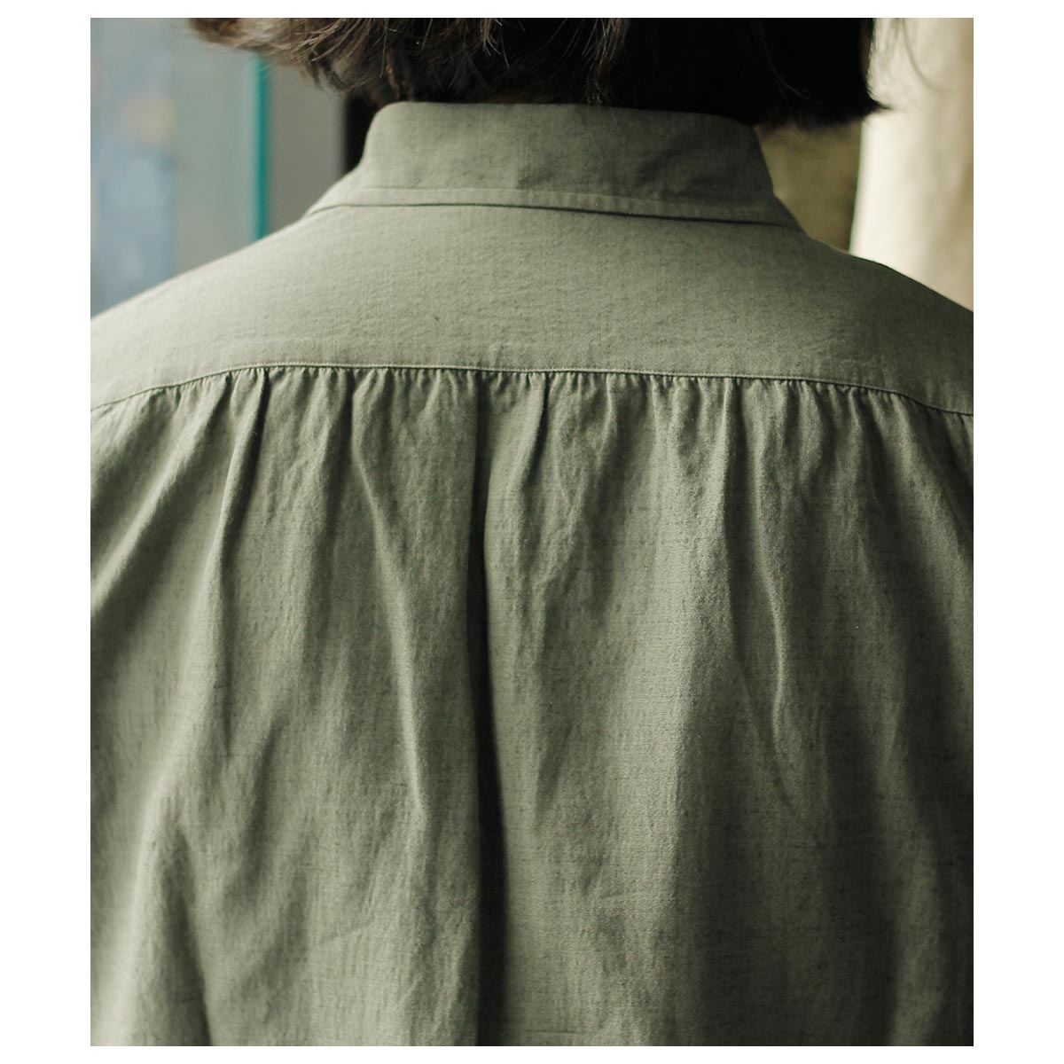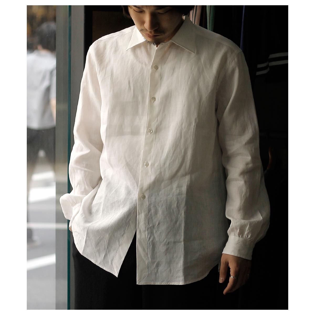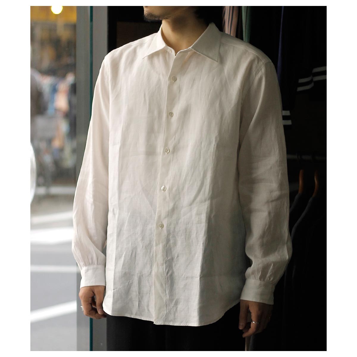 ’20年~’40年頃ファッションに精通した英国のエドワード8世のちのウインザー公が愛用した衿型からウインザーワイドカラー。衿を開けた時にも軽さを感じる少し上品なワイドカラーに、後ろ身頃はギャザーをよせて定番の両脇手縫いガゼット。南イタリアのドレスシャツの系譜をひいたリラックスドレススタイルです。 ボタンにはナチュラルなナット釦を使用しております。