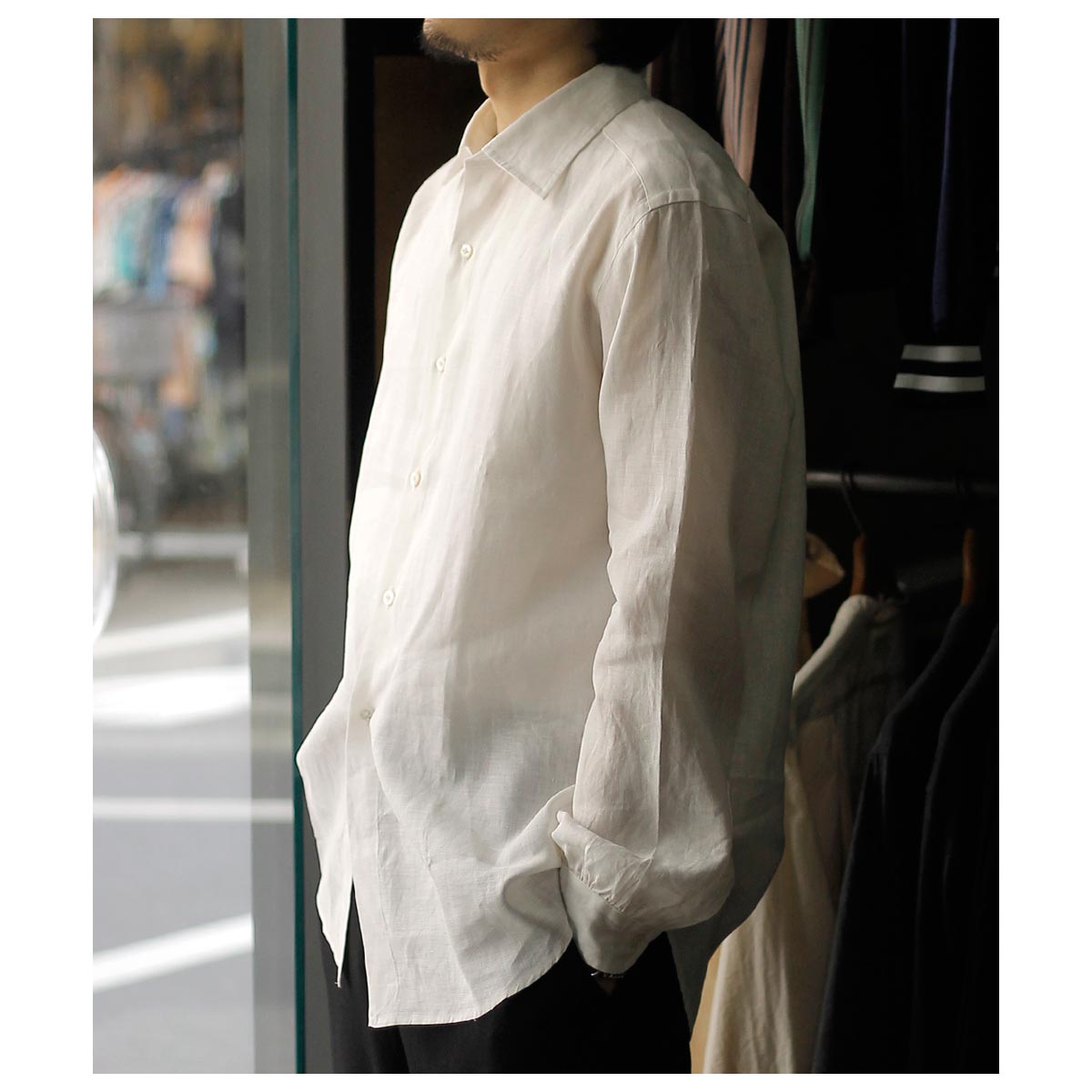 近江上布として室町から麻織物から盛んだった滋賀で生まれたオーセンティックなリネンの平織り。経糸に60/1、緯糸に80/1の細番手を配置したこの生地は経年と共により柔らかく滑らかに育っていくだろう期待を感じさせる良い生地です。