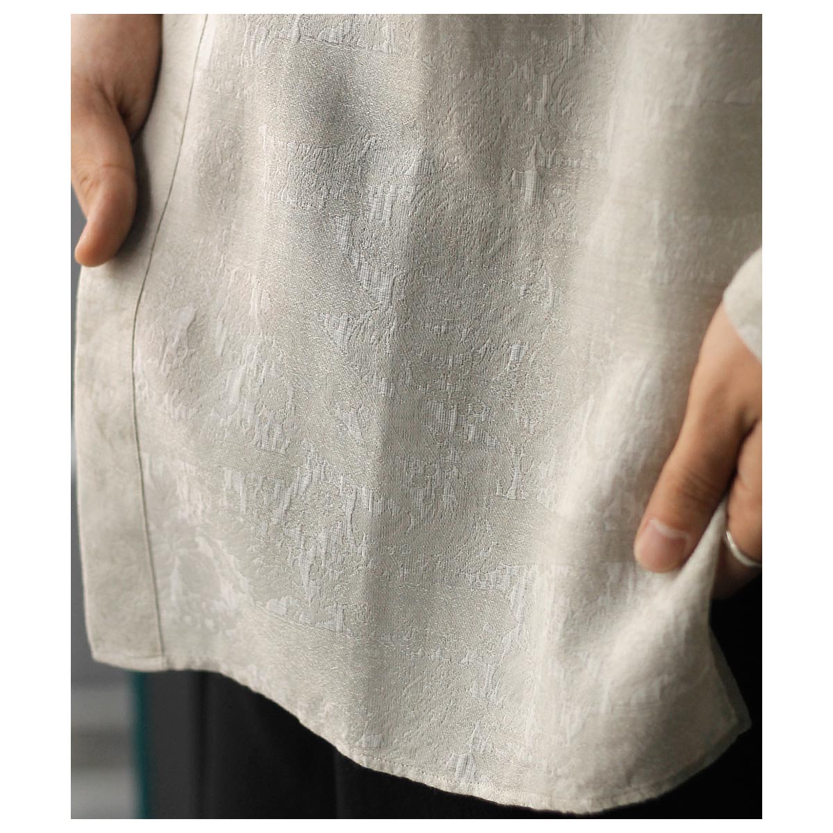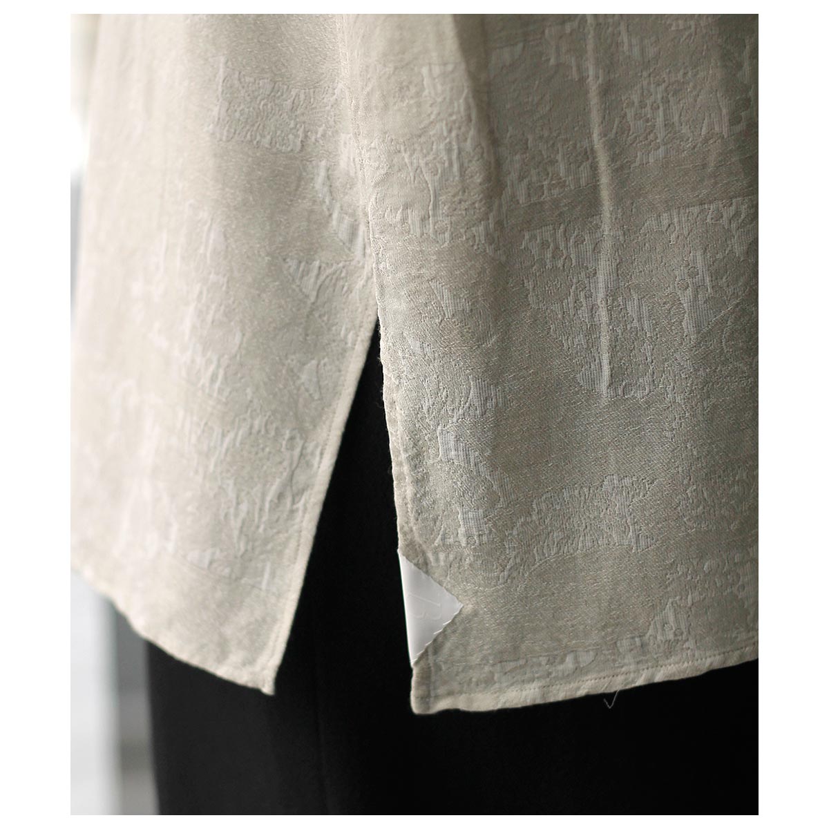元々はインテリア用に使われていた花柄の紋紙で織られたジャカード生地。経糸にキュプラ、緯糸にペールトーンのモスグリーンのコットンと白レーヨンを1本ずつ配置しました。淡い色味の中に見える花柄が独特な印象を与えてくれます。
