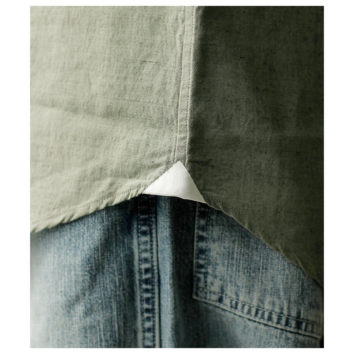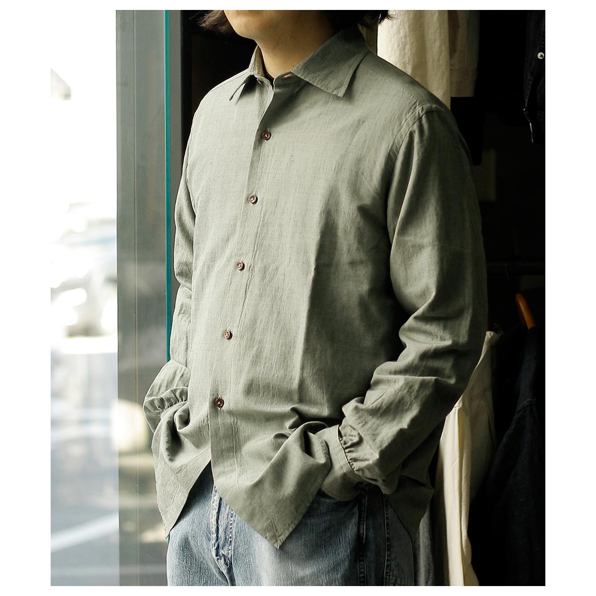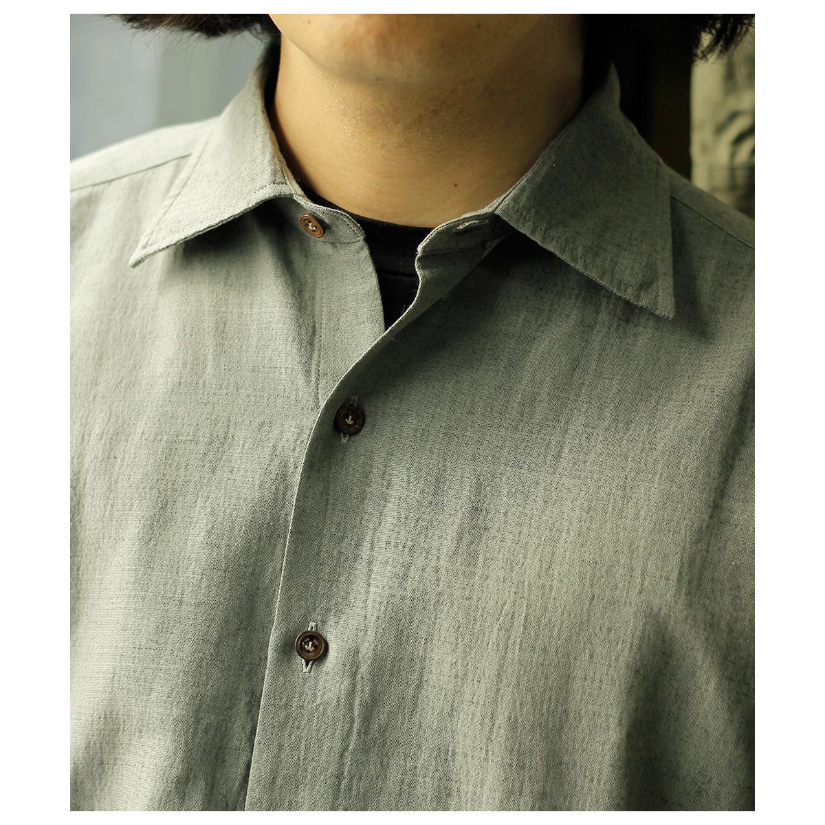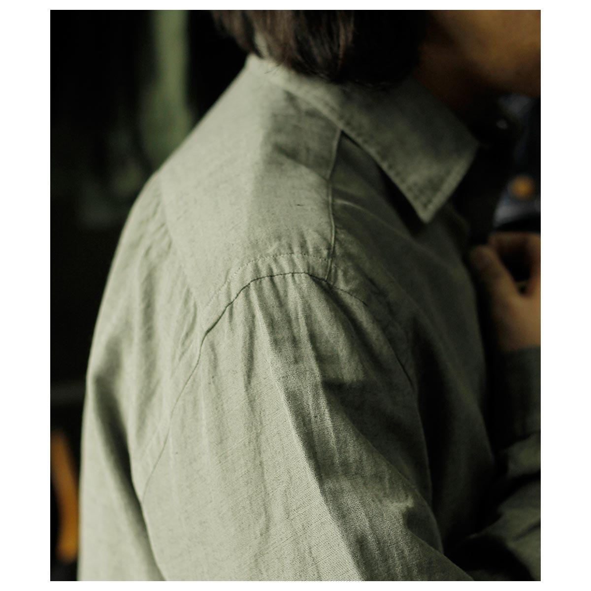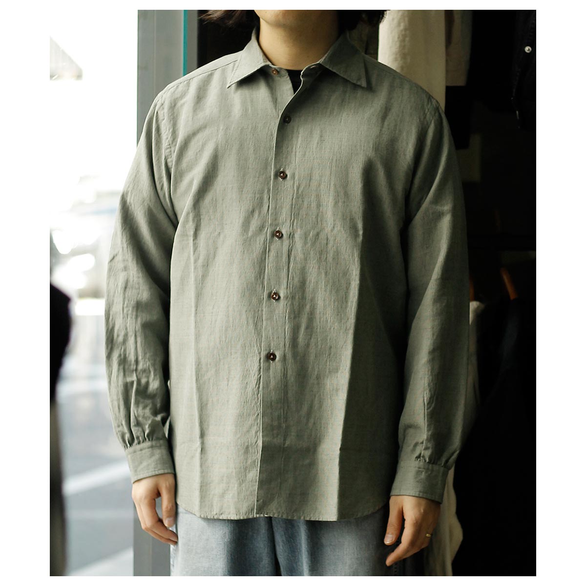 春夏用のウールモヘアのトロピカルシャンブレーそんな重厚なイメージのシャツ地を作りたい、そんなところから生まれた生地。 モヘアの光沢やケバ感はラミーに置き換えが一番近い、シャツ地としての機能として肌触りの良い100/2コットンを使用、柔らかさと少しの光沢を足せるレーヨンシルクの混紡糸を足し、以上を組み合わせ経糸にコットン、緯糸に敢えてラミーは生地後染めを考え黒を使用、またラミーの間にレーヨンシルクを配置した。組織は2/1綾でなめ らかなコットン経糸面を肌側にし、緯糸側の独特な光沢面を表側にしています。 今回は敢えて彩度を抑えた色味でラミー黒のケバ感が正にモヘアのように仕上がっています。
