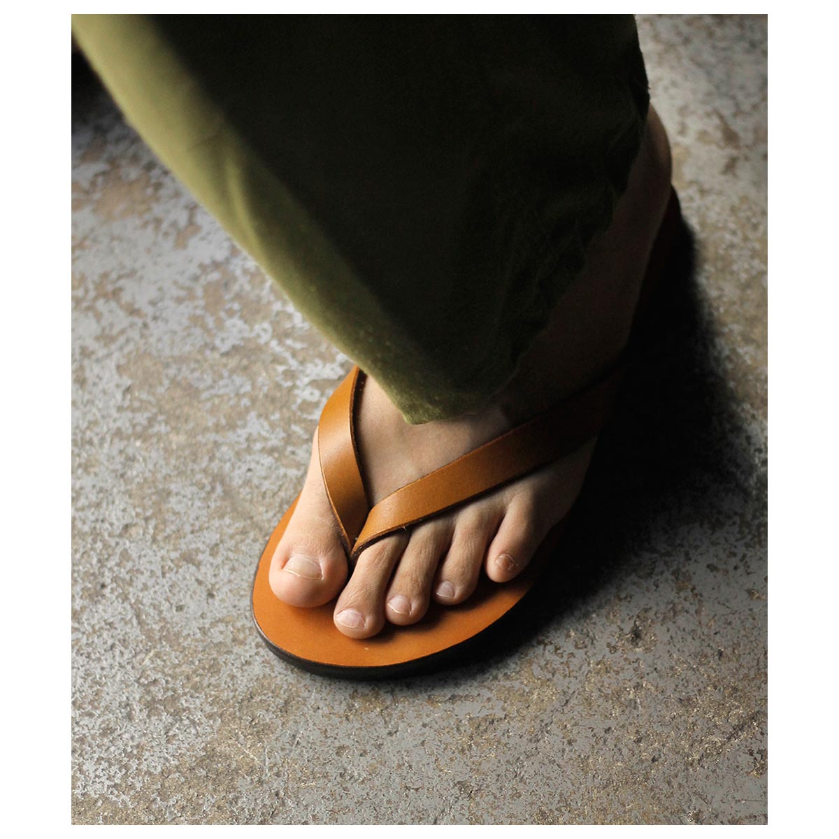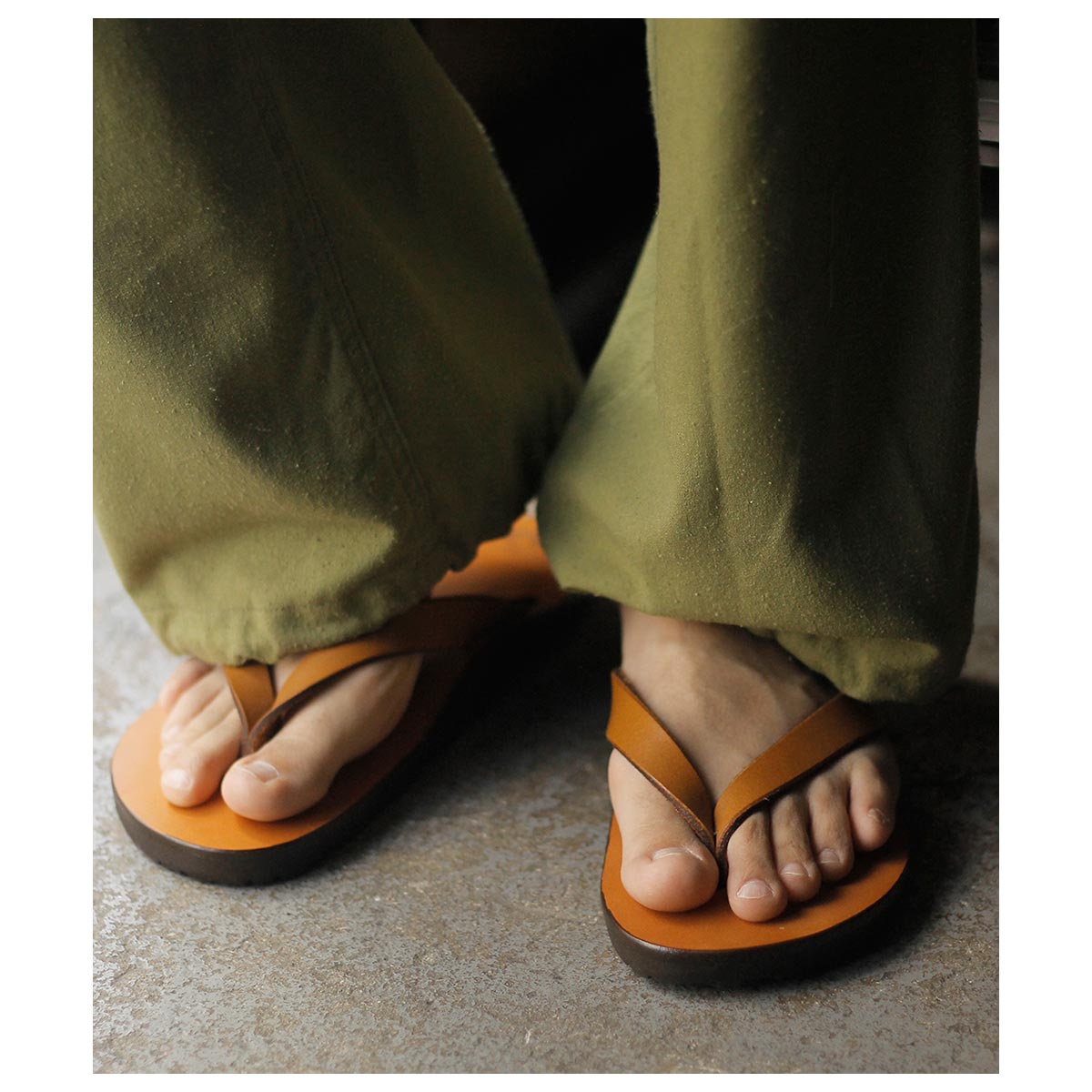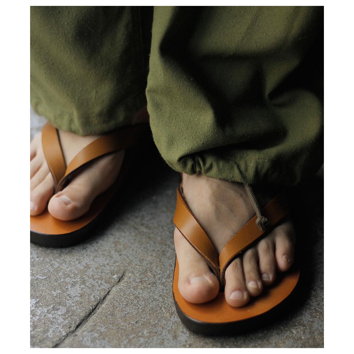キーの特徴は、二本のレザーを使用したシンプルでベーシックな鼻緒タイプ。履いた時の解放感があり、幅による痛みも少ないため、初めから履きやすいモデルとなります。