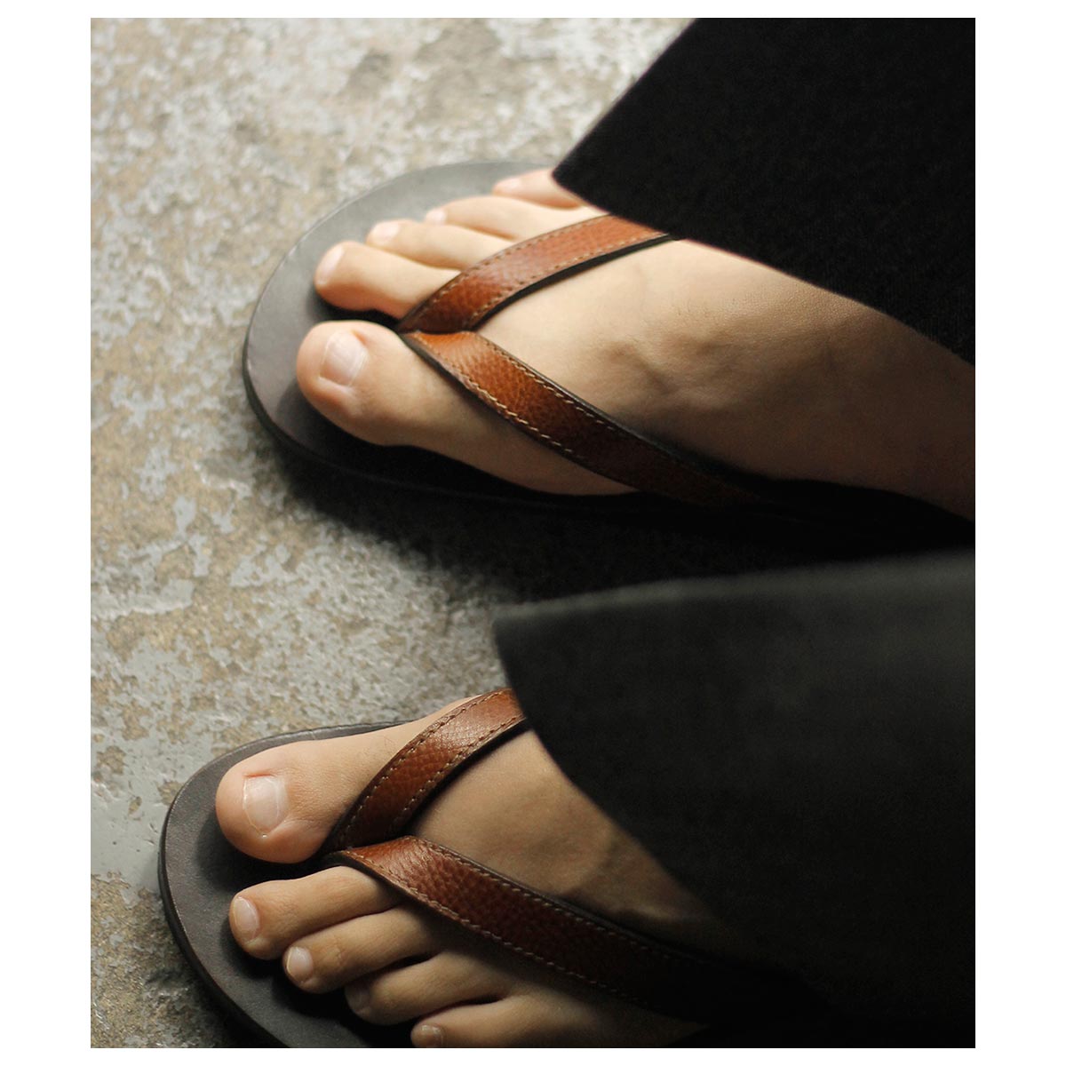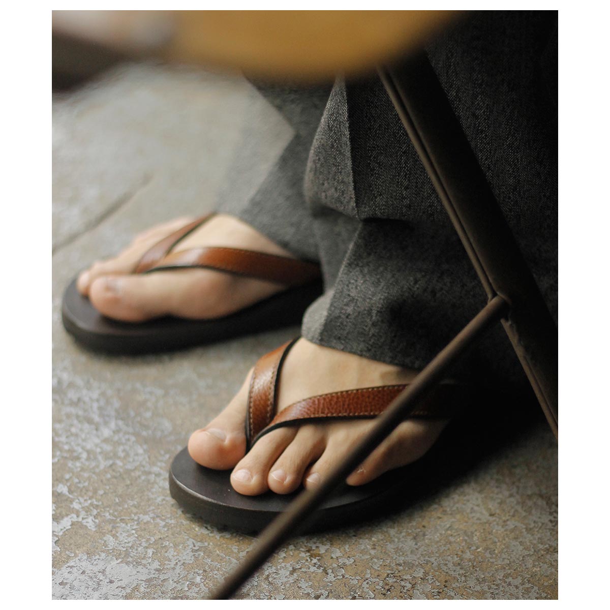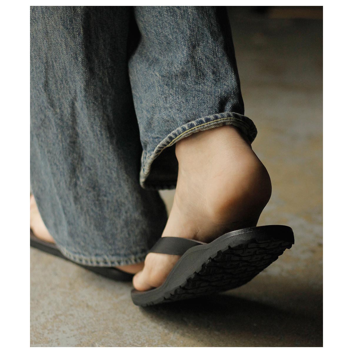 キーの特徴は、二本のレザーを使用したシンプルでベーシックな鼻緒タイプ。履いた時の解放感があり、幅による痛みも少ないため、初めから履きやすいモデルとなります。