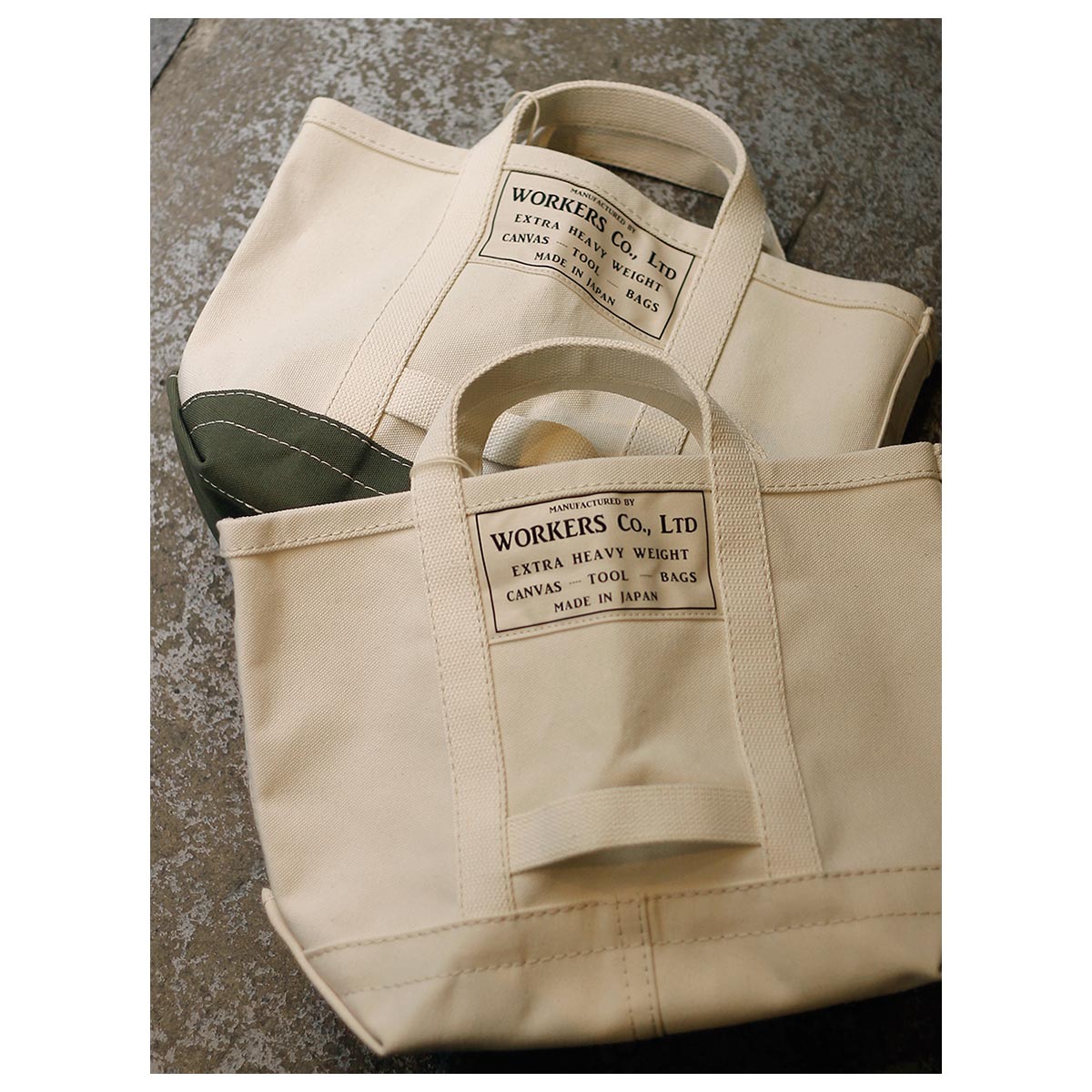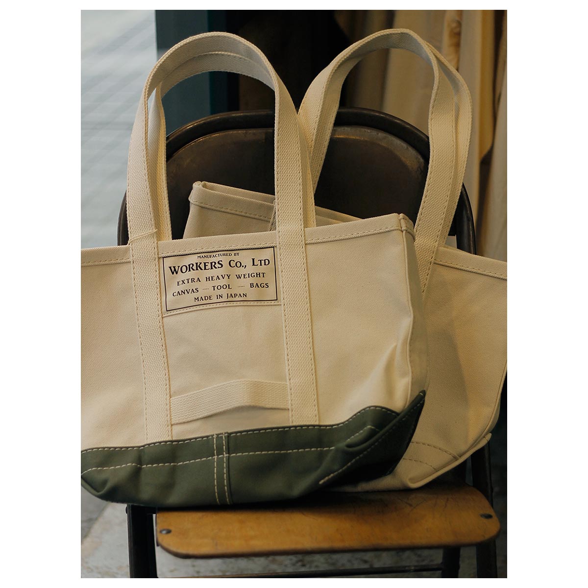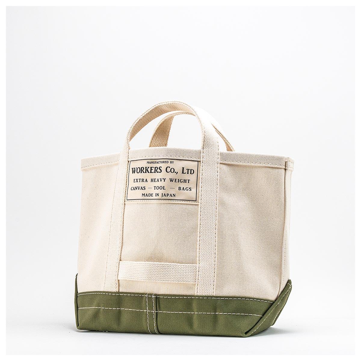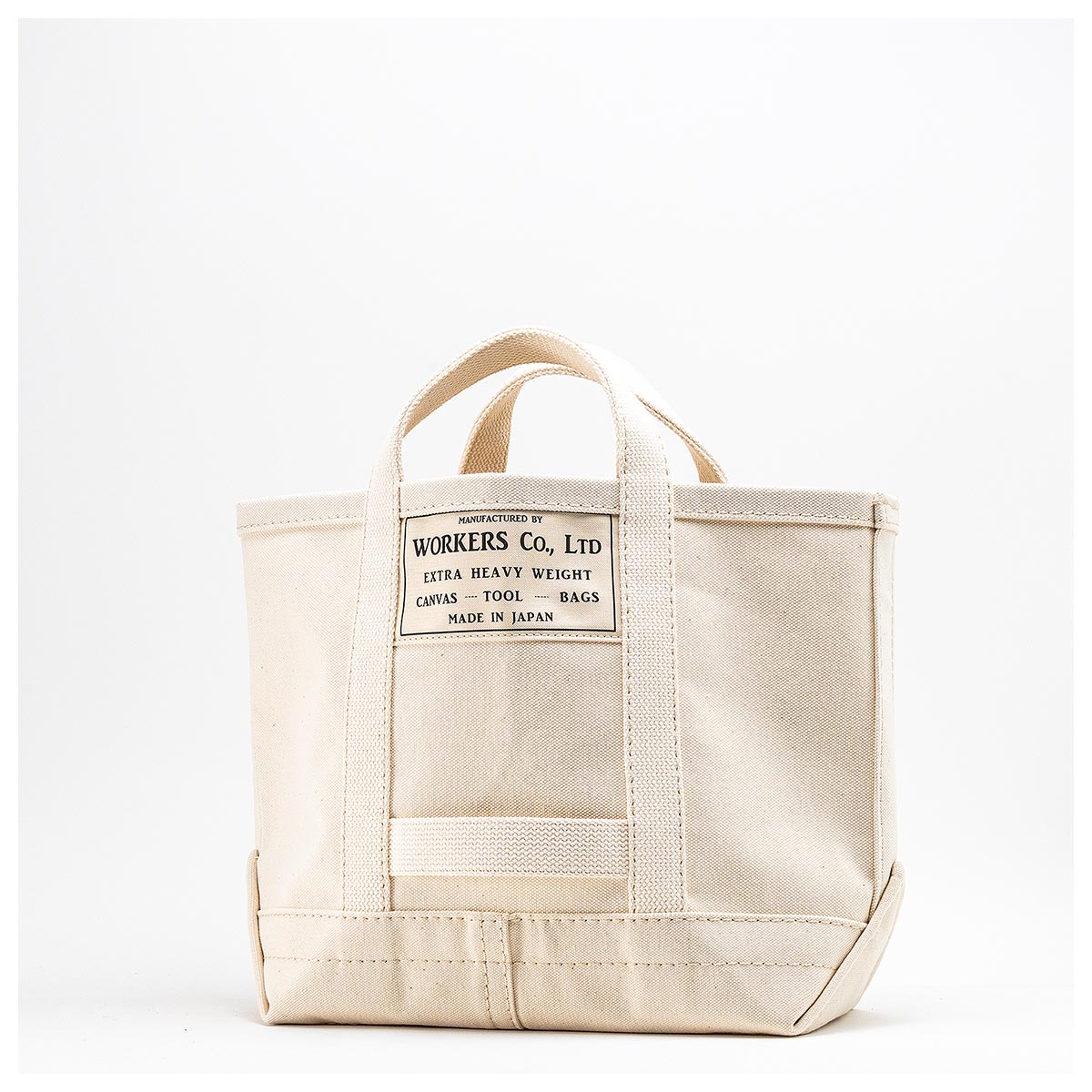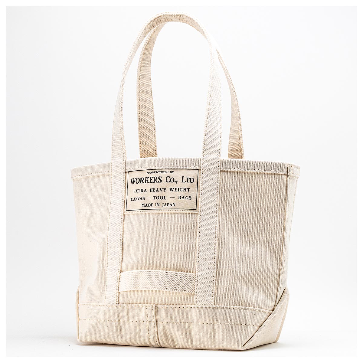 耳なしの4/6ヘビーオンス帆布の左右を折り込んで縫う仕様。折り込んだ箇所は硬く、バックが自立します。フロントには、ワーカーズのネームを大きめに貼っています。
