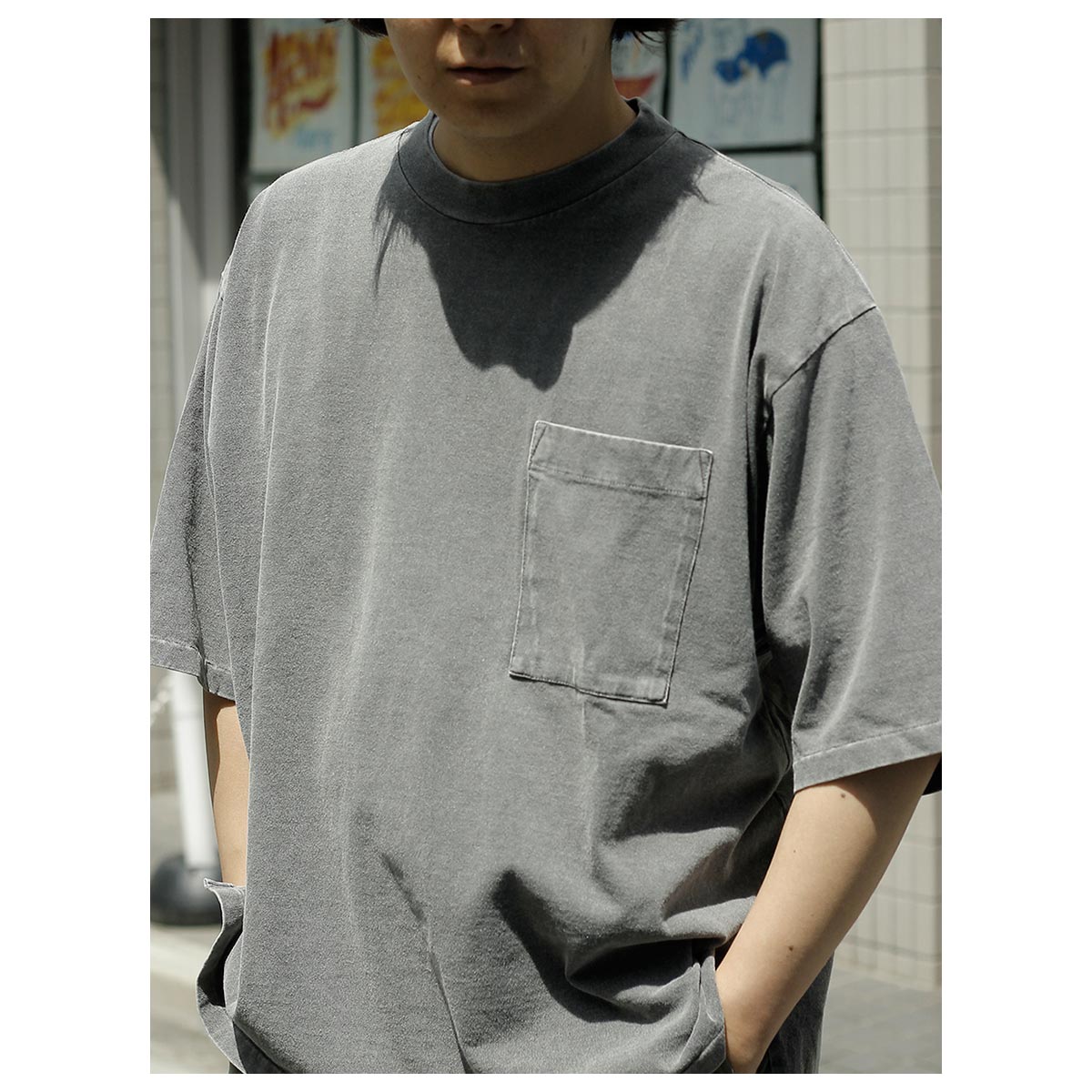 当時のアメリカ製のTシャツに使われていたドライな表情を再現するべく空気を含ませた特注の空紡糸を使用し、シャリ感のある度詰め生地に仕上げました。 加工は高度な技術と複雑な計算を必要とし、国内でも限られた工場のみが保有する特殊な機材を用いて行われる非常に希少な加工です。硫化染め、 パウダーブリーチ、日焼けイメージのサンフェードの3色を染色や加工で表現しています。
