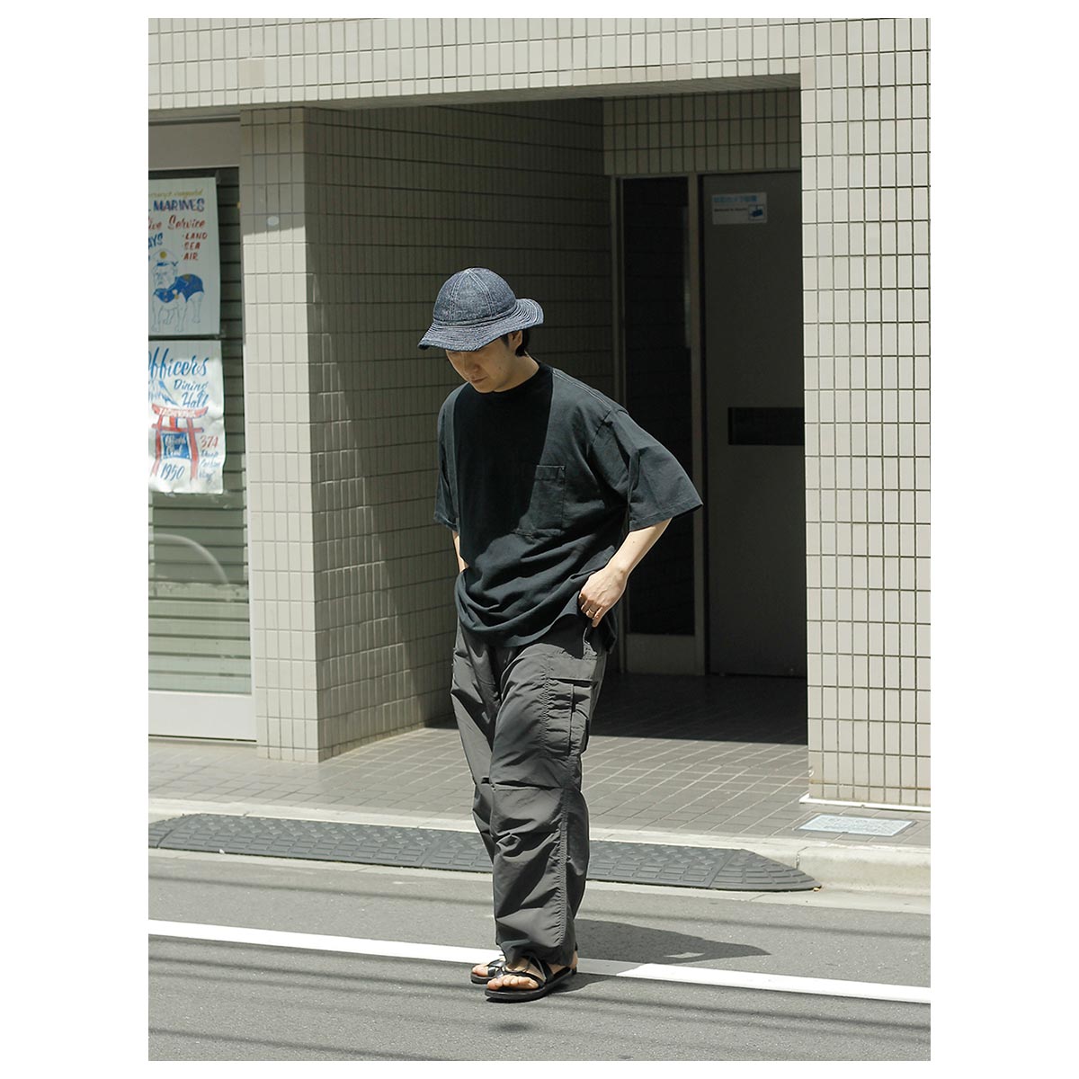 ナイロンタフタのミリタリーパンツとアーミハットでミリタリーな合わせ。