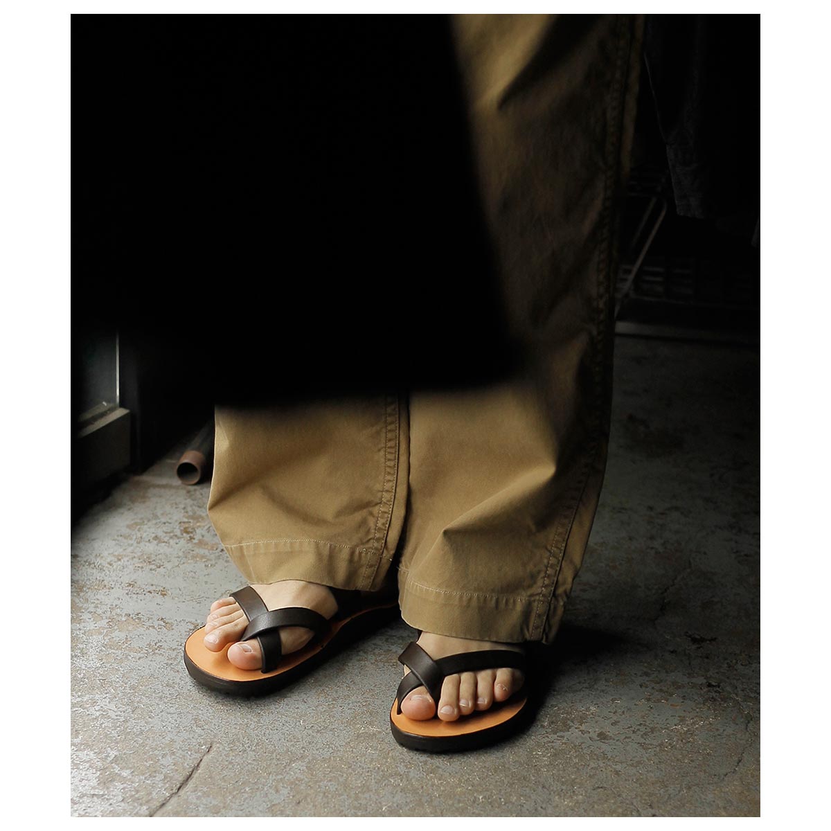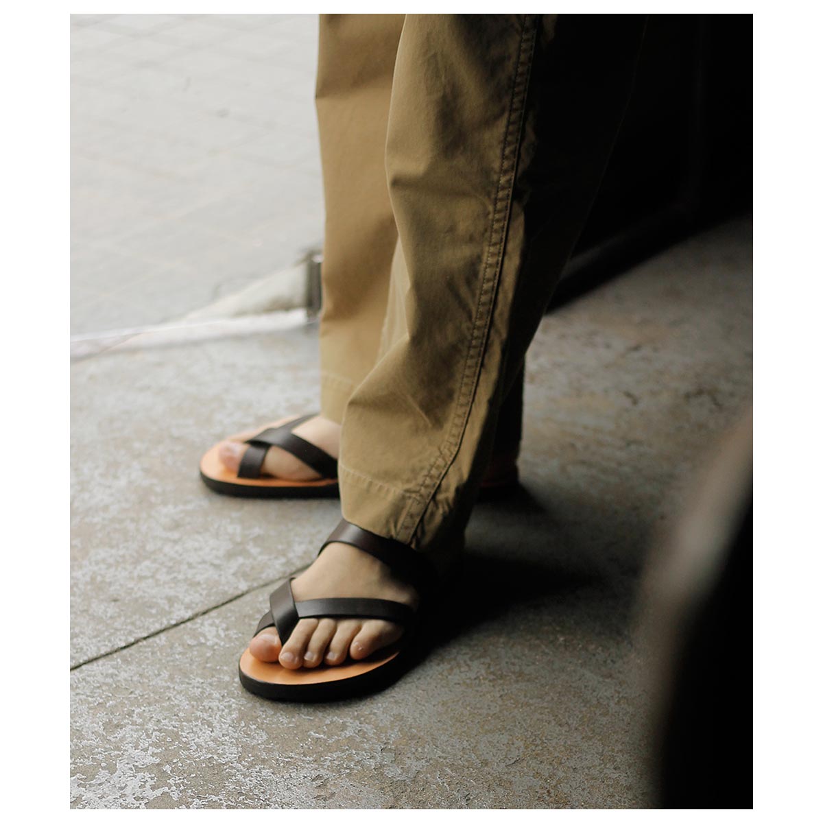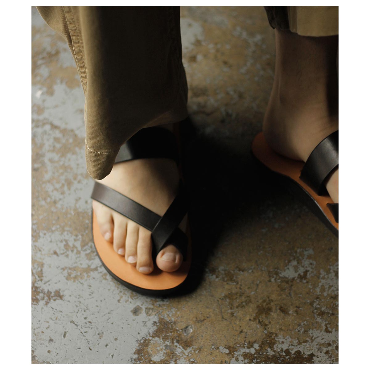 二本のレザーでクロスし、親指を通すサムホールを形成したデザインに、甲を覆うレザーを配した、ミリタリーサンダルような雰囲気を纏うARUBA。