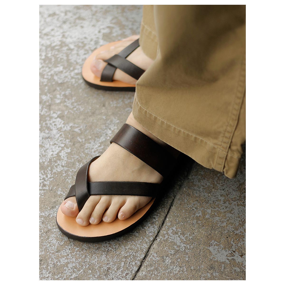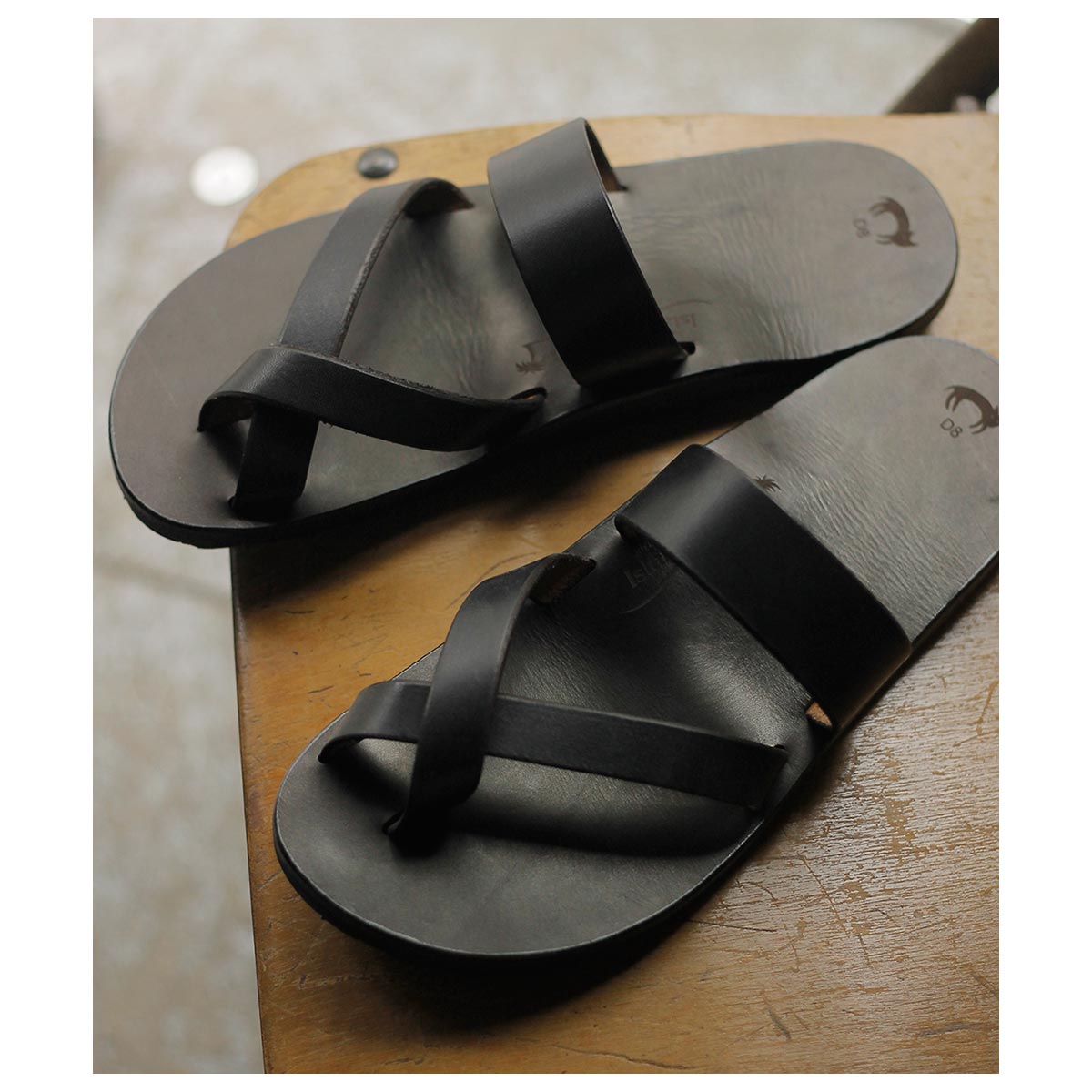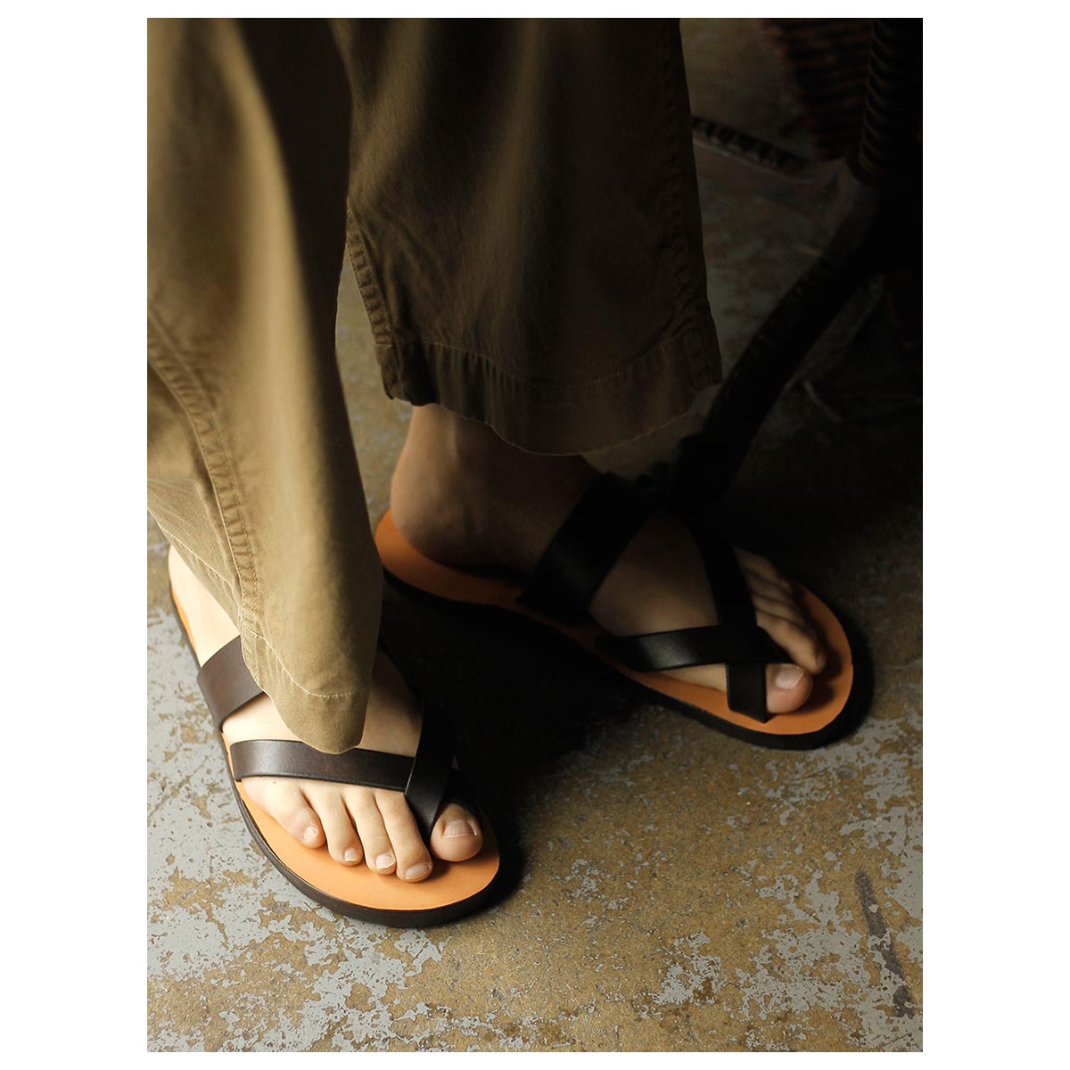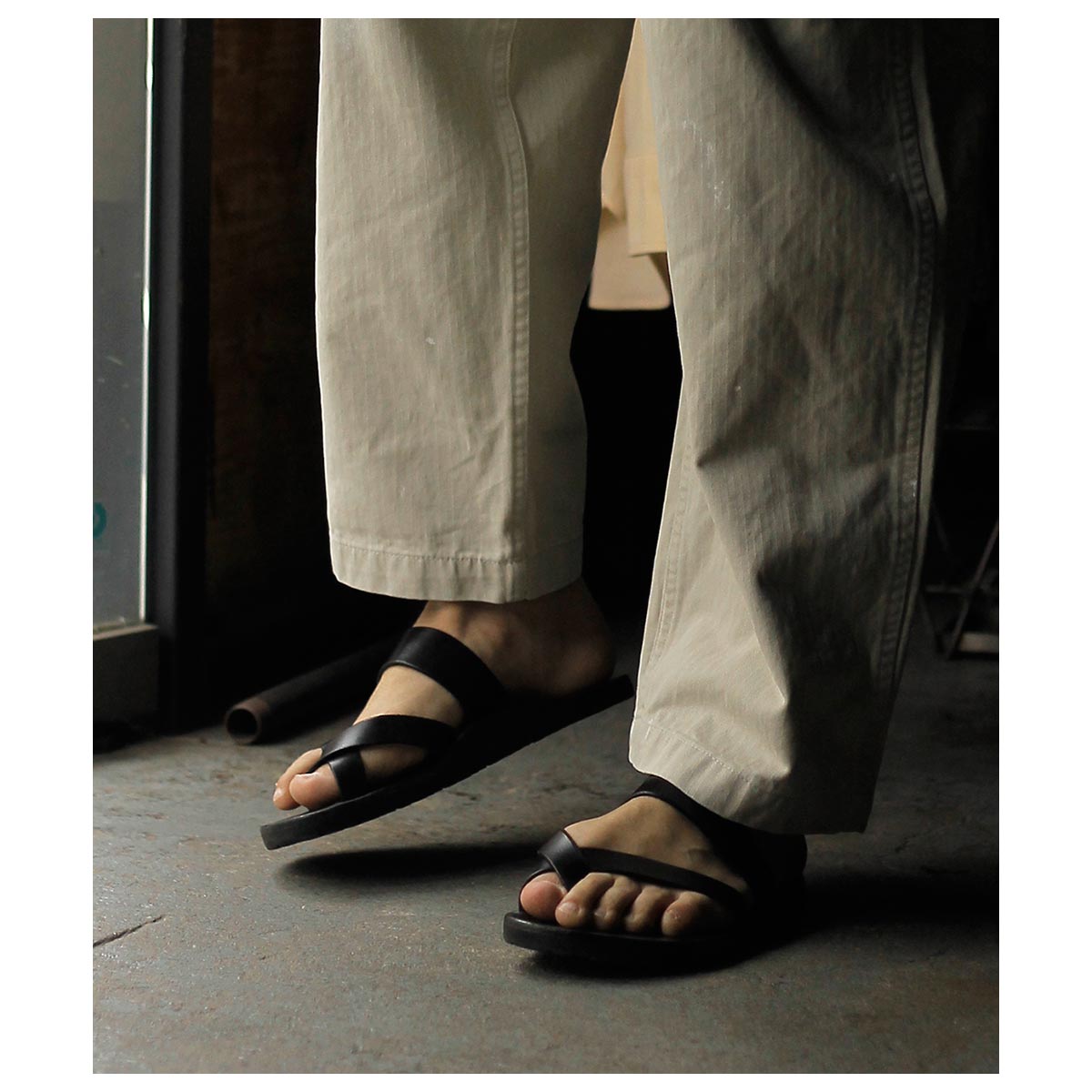 二本のレザーでクロスし、親指を通すサムホールを形成したデザインに、甲を覆うレザーを配した、ミリタリーサンダルような雰囲気を纏うARUBA。
